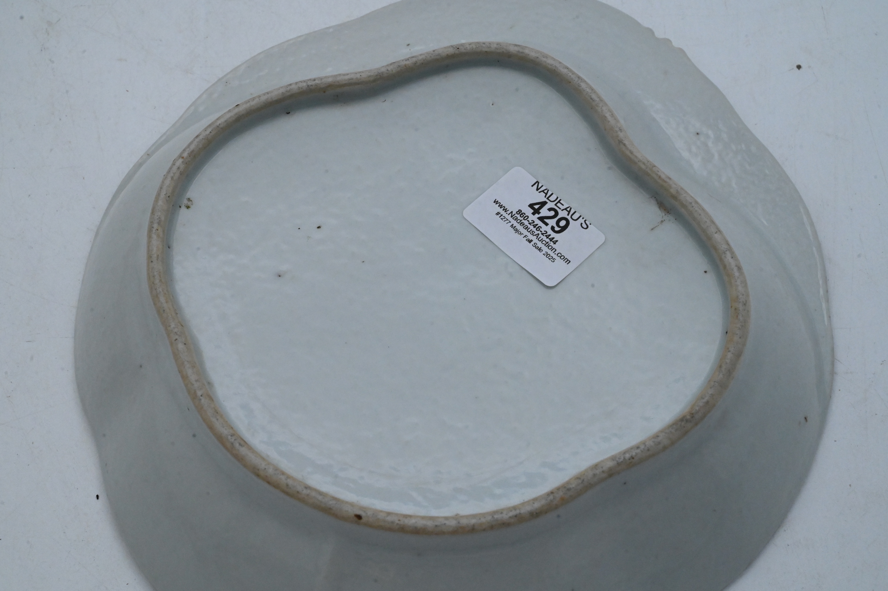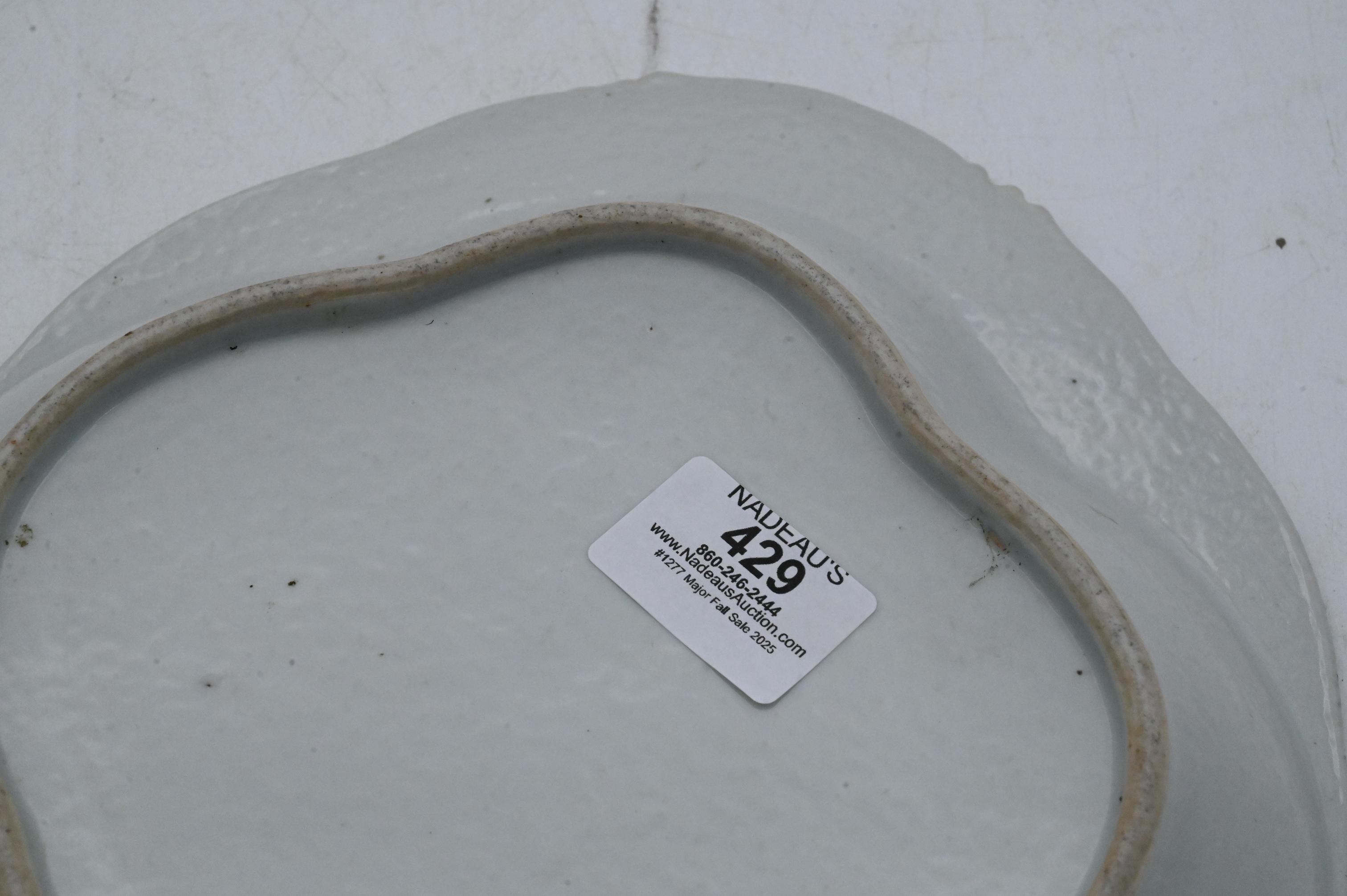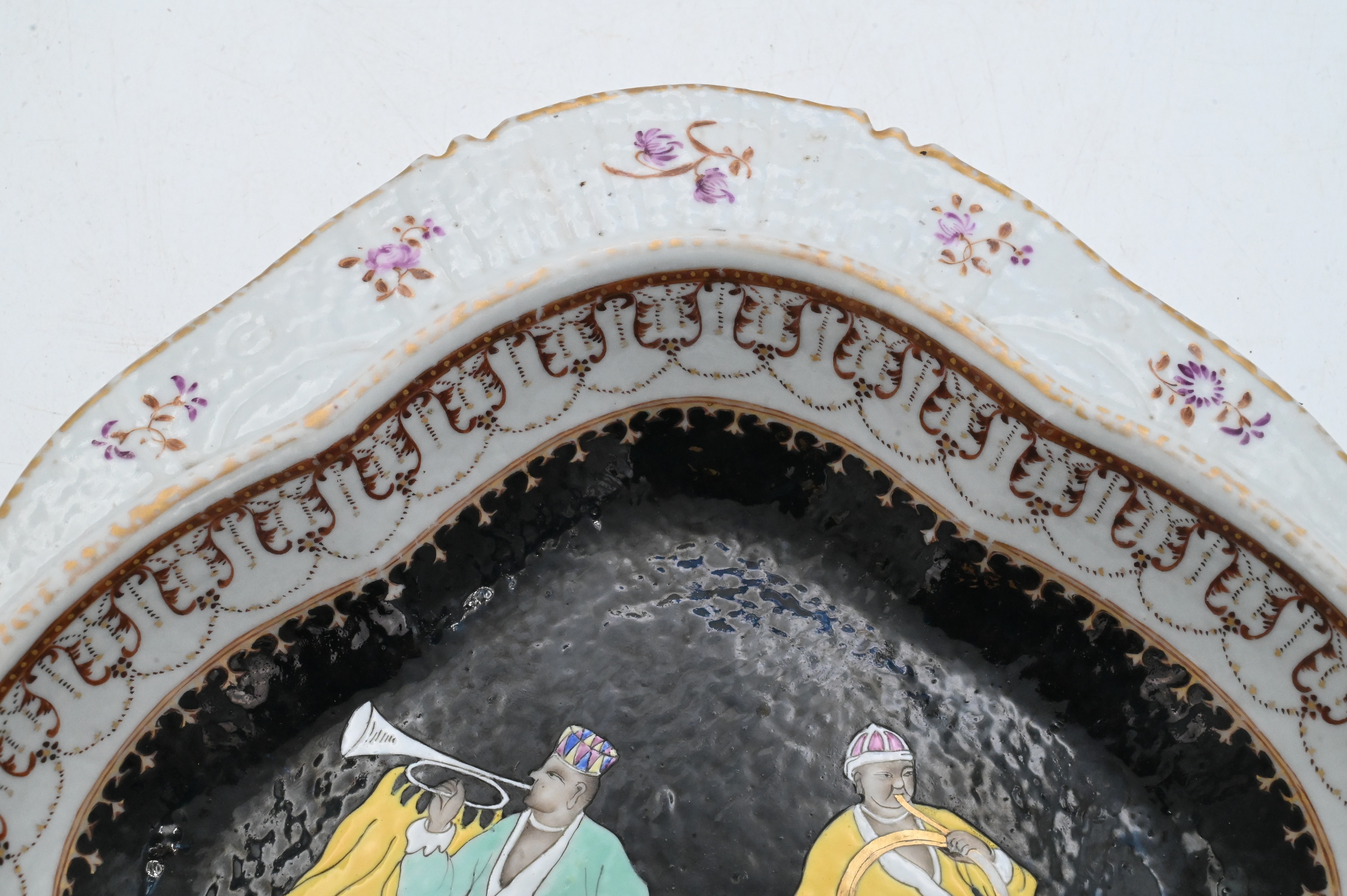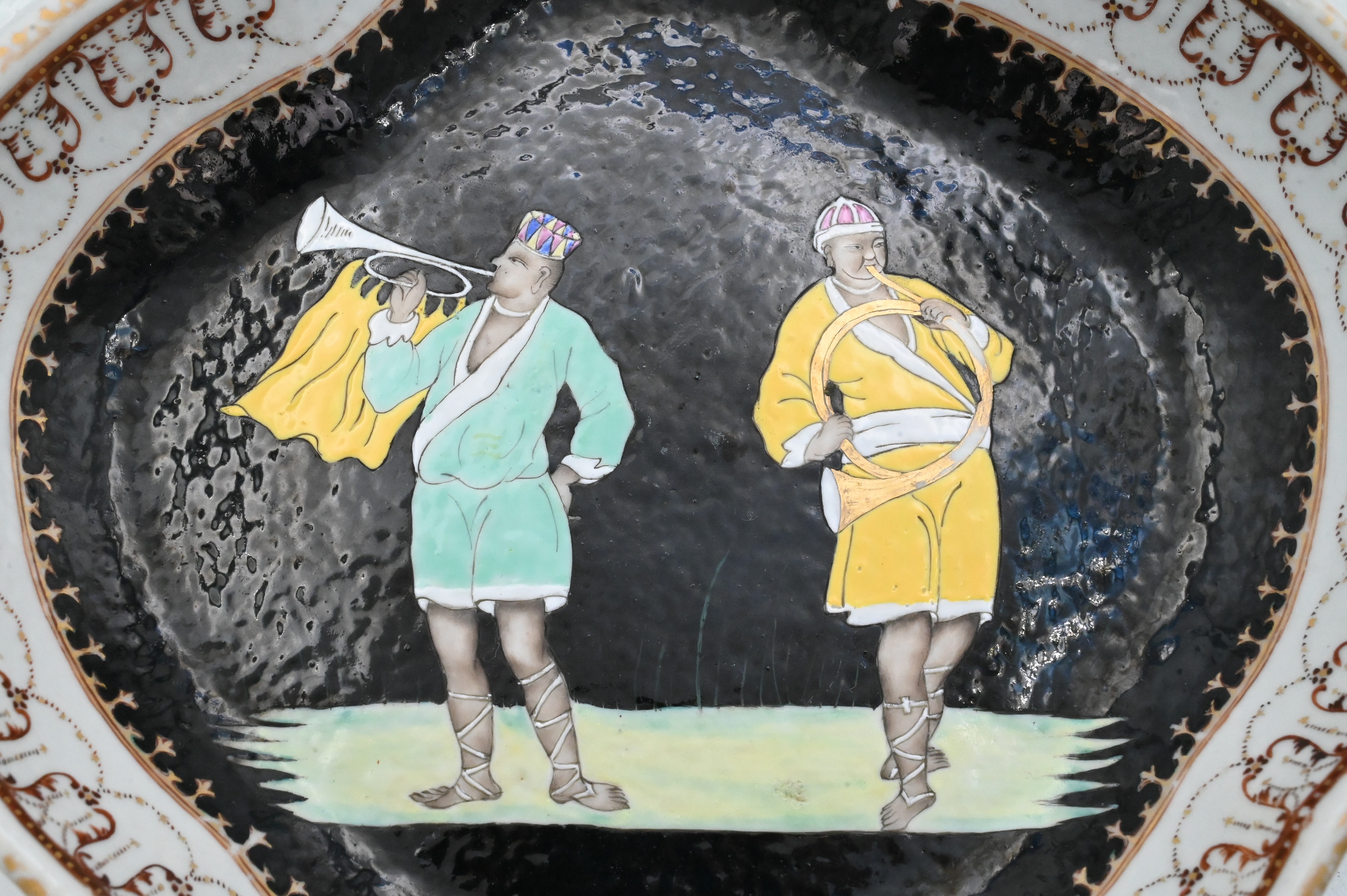 Of lobed form, decorated with two European figures on a black enamel ground, one playing a trumpet, the other a French horn, within a molded rim decorated with floral sprays and a brown enamel border. The reverse glazed white with unglazed foot rim. Part of the “Pronk” series of designs made for the Dutch East India Company and continued in later Qing export production