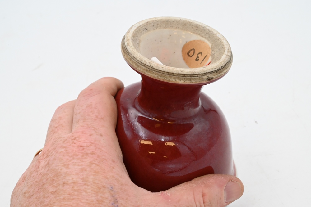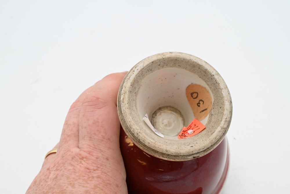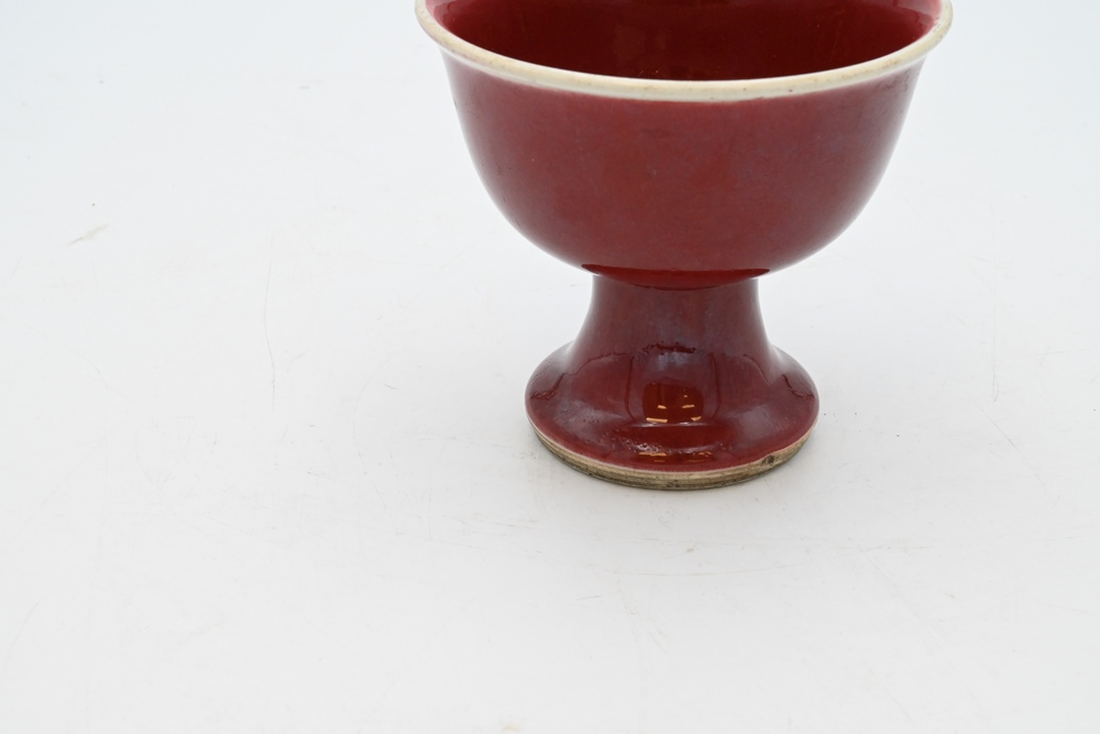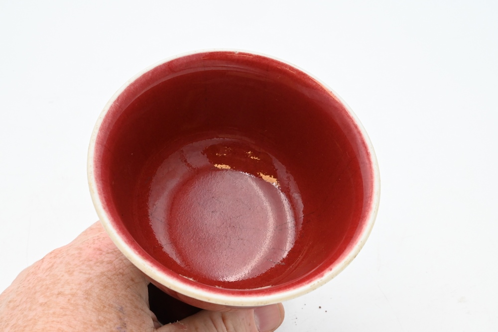 Lot 429: Chinese Glazed Stem Cup in oxblood red with white rim, old paper tag on inside of cup and bottom height 4 inches diameter 4 3/8 inches