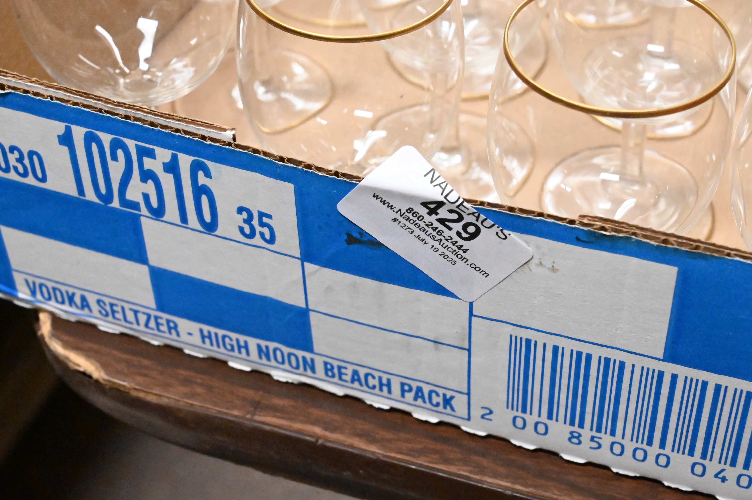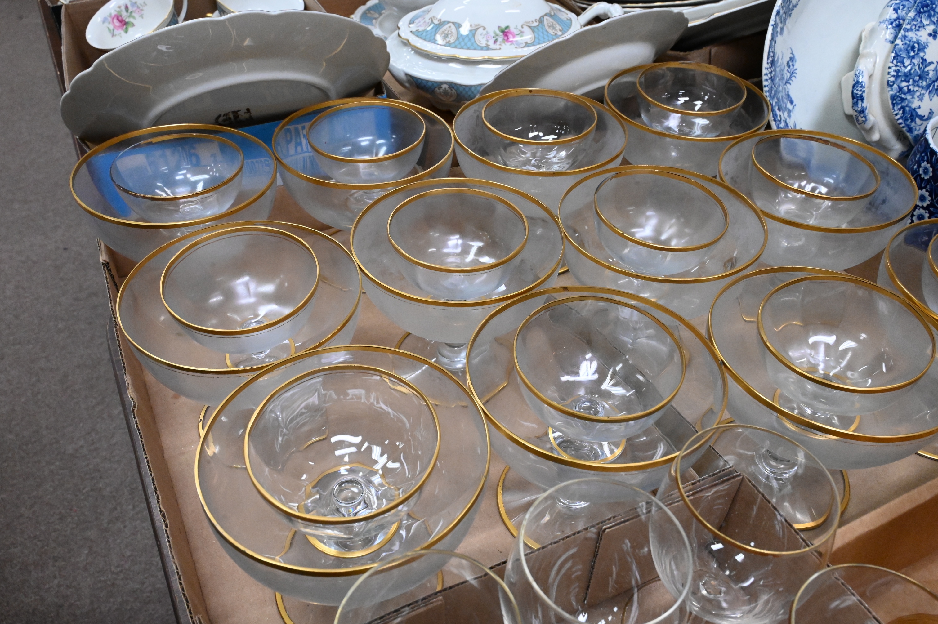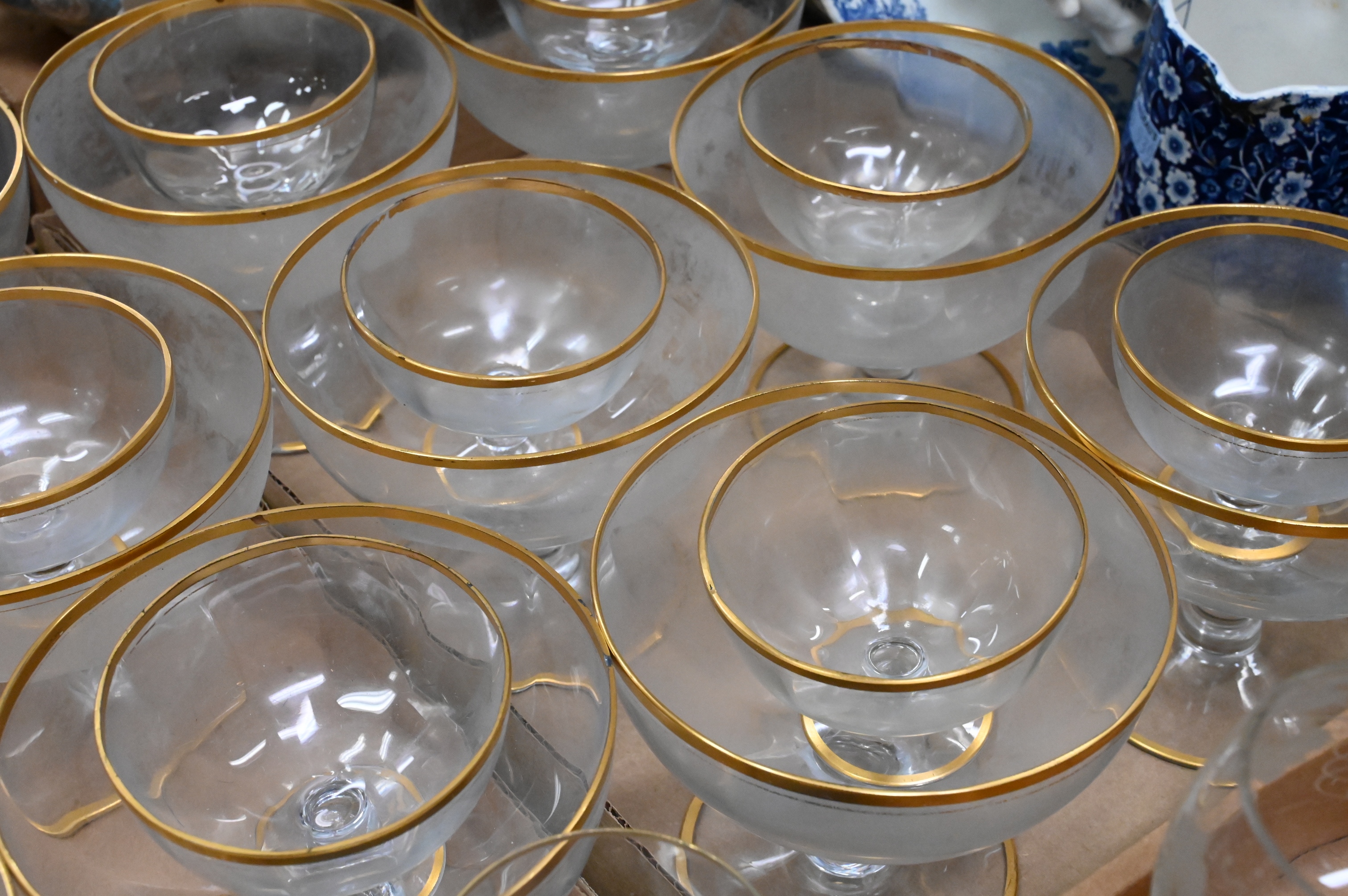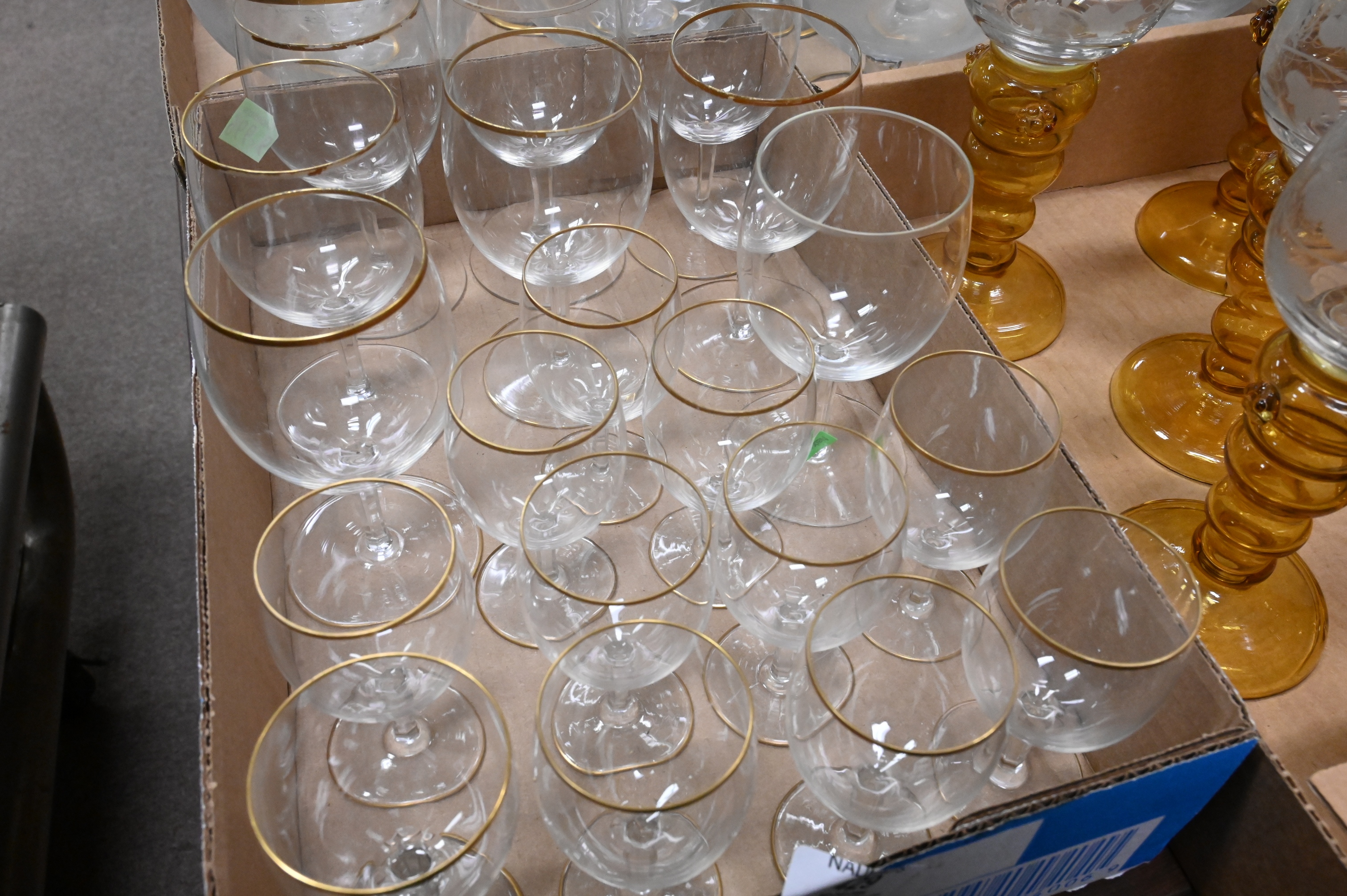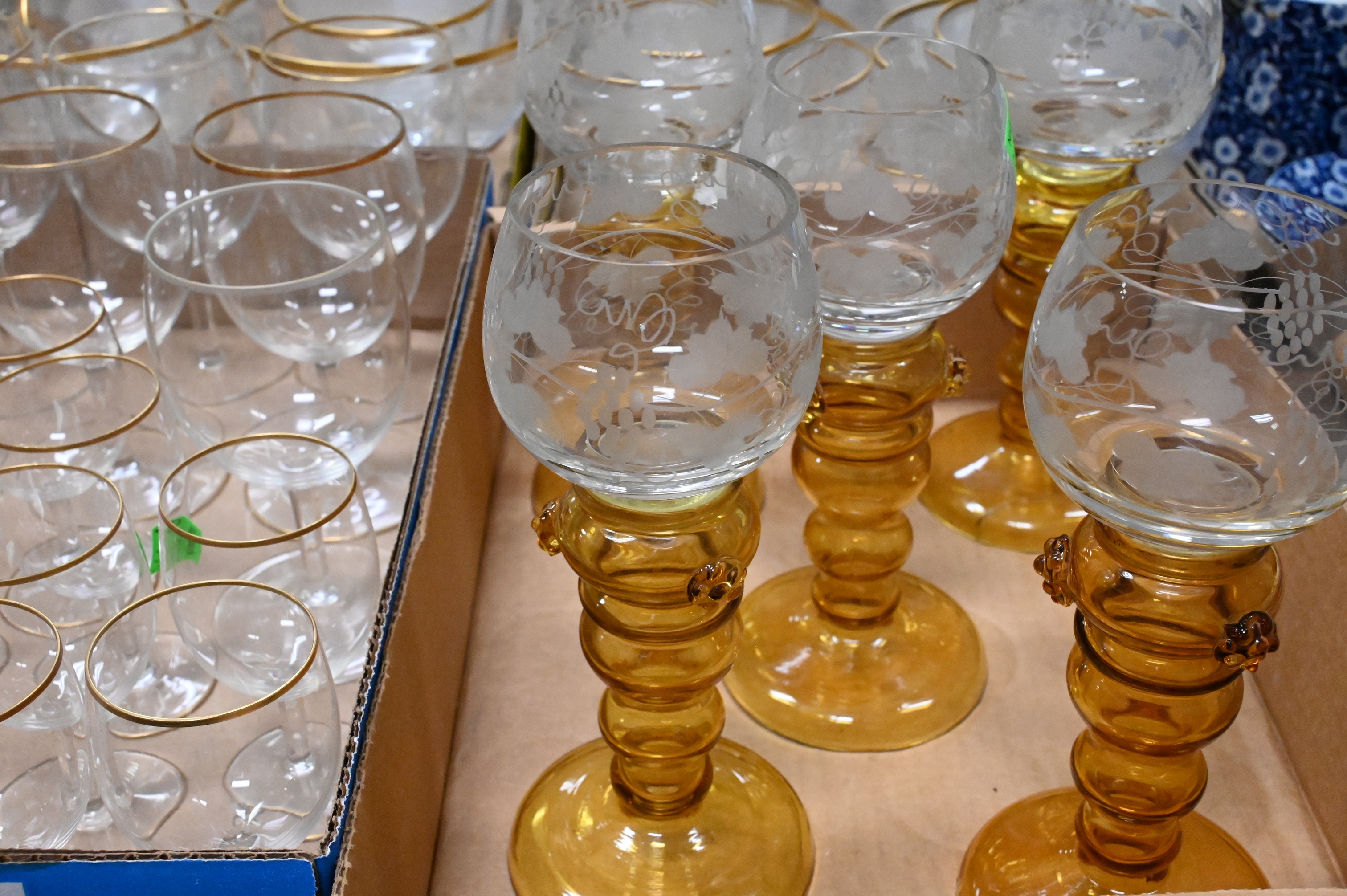 to include 12 shrimp cocktail serug glass sets, eight wine glasses, eleven sniffers or cordials along with five amber and etched glass wine goblets by Theresienthal Roemer Verre Rhine Germany