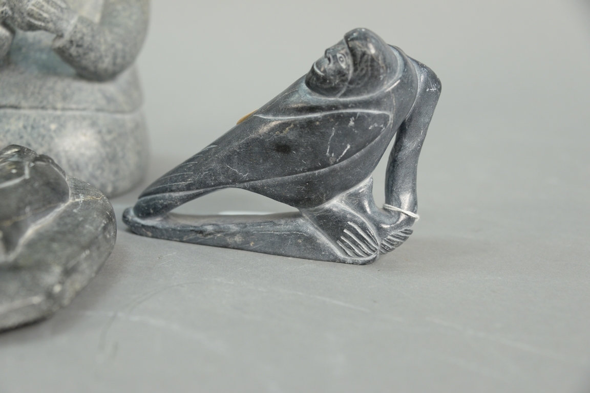 Four Inuit Eskimo carvings to include Mata Qissualuk b. 1921 Ivujivik grey steatite Woman Holding Pot 6 1/2in., Levi Qumaluk 1919-1997 Puvirnituq basalt Death Scene lg. 7in., Wayne Puqiqnak 1975 Gjoa Haven black basalt with caribou drum beater Drum Dancer 4 3/4in., and Levi Alasua Pirti Smith 1927-1986 Puvirnituq grey soapstone Birdman 3 1/2in..