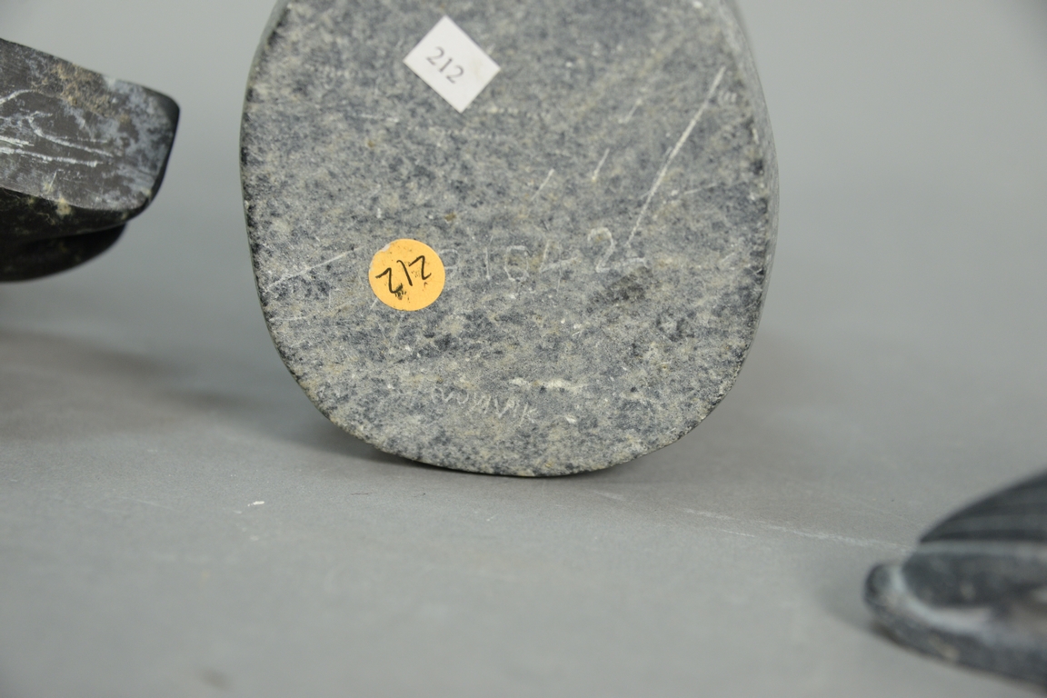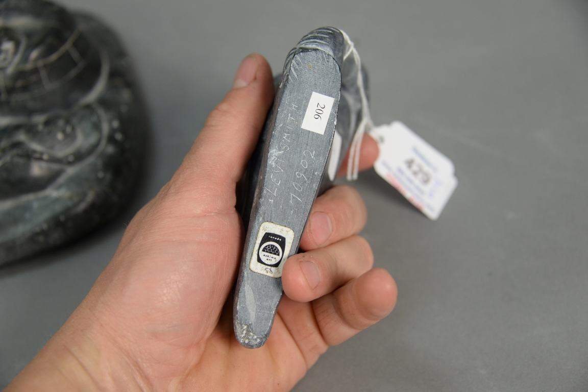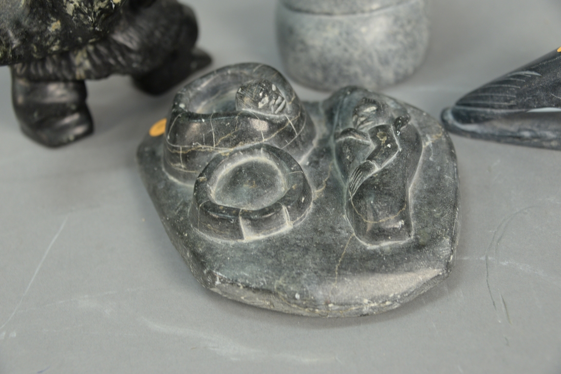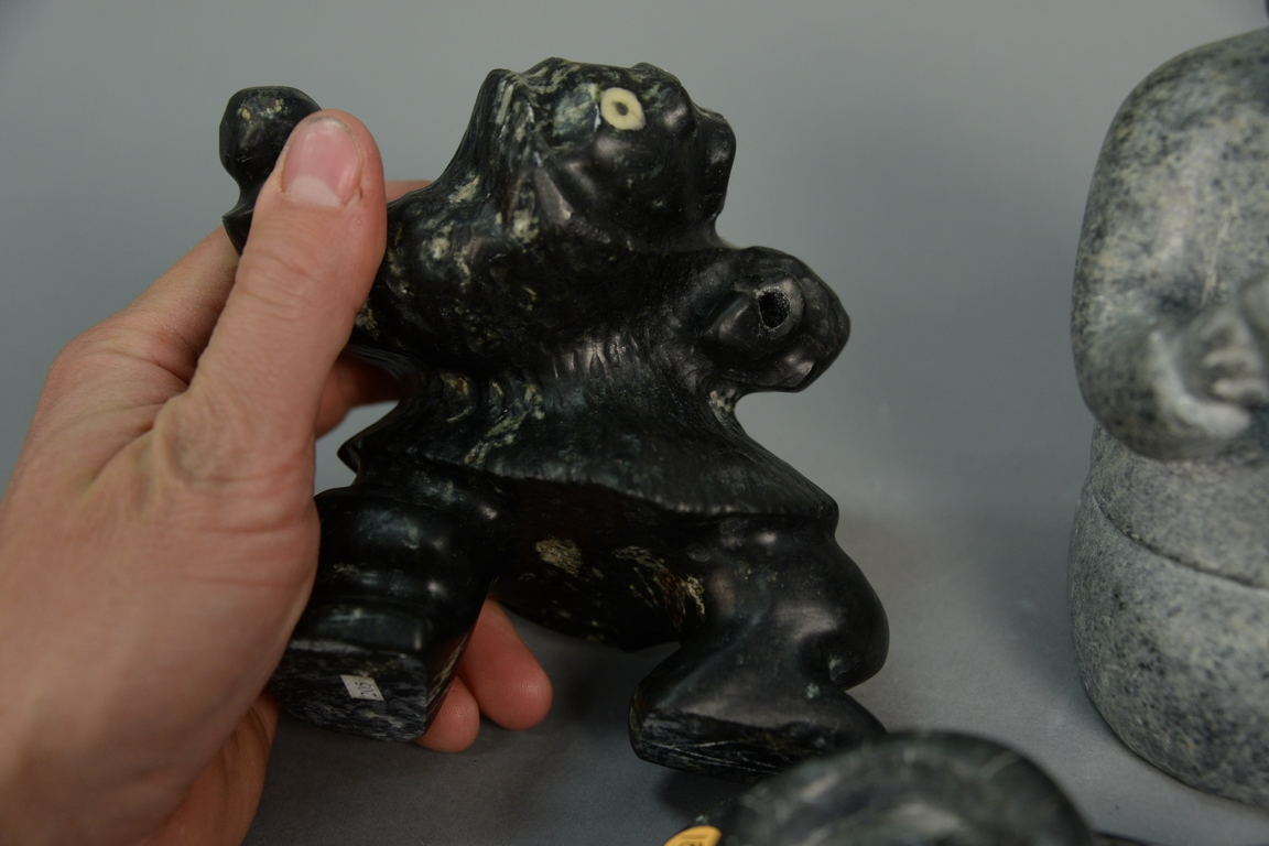 Lot 429: Four Inuit Eskimo carvings to include Mata Qissualuk b. 1921 Ivujivik grey steatite Woman Holding Pot 6 1/2in., Levi Qumaluk 19…