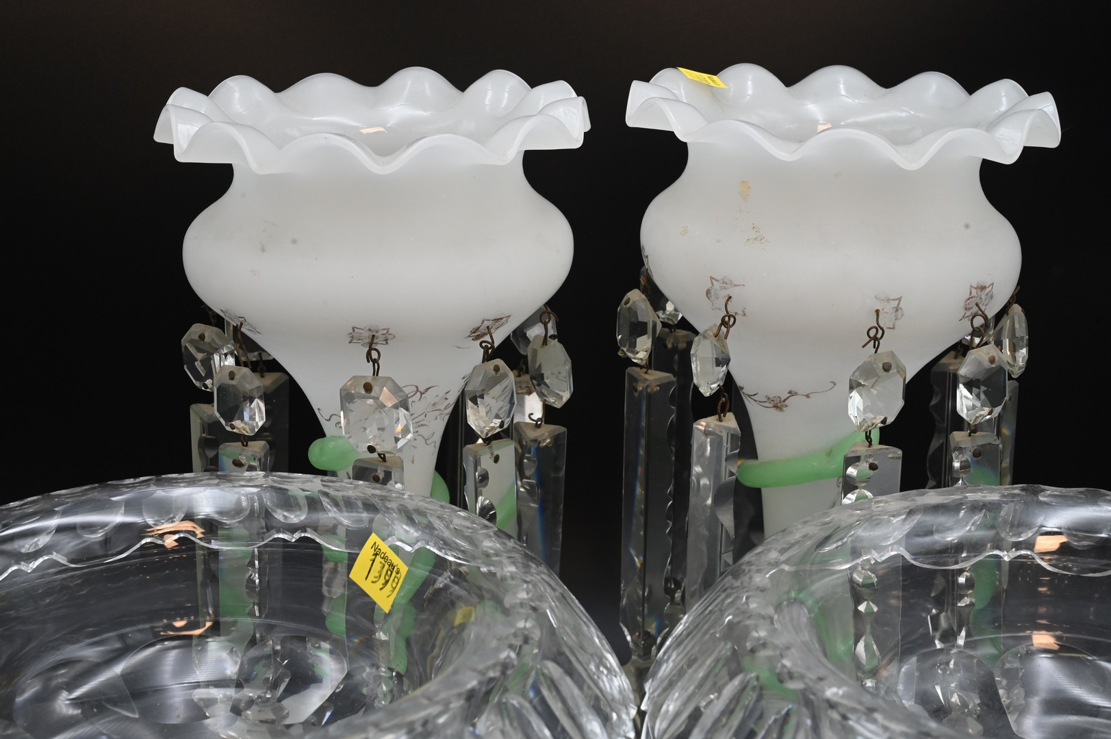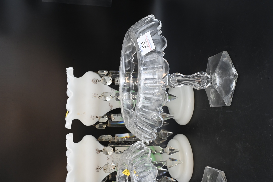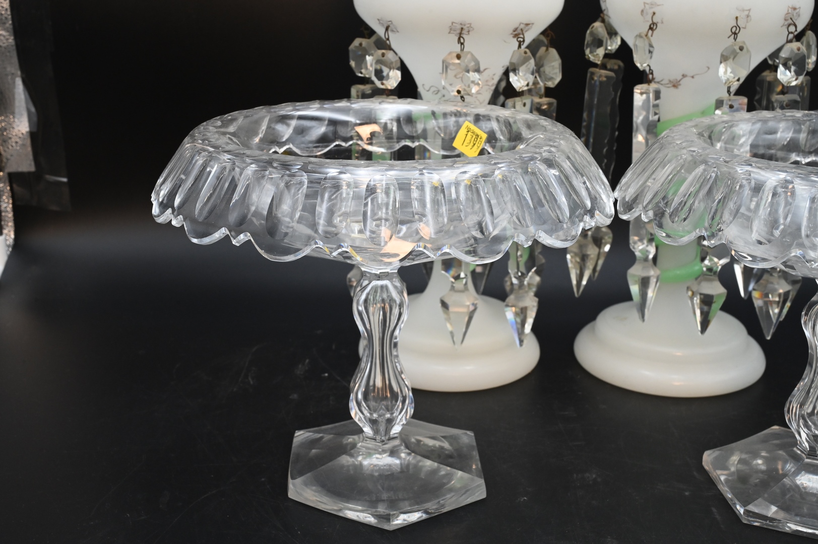 Four Piece Group, pair of lusters with green glass twist and prisms, along with a pair of glass compotes, tallest height 12 inches.