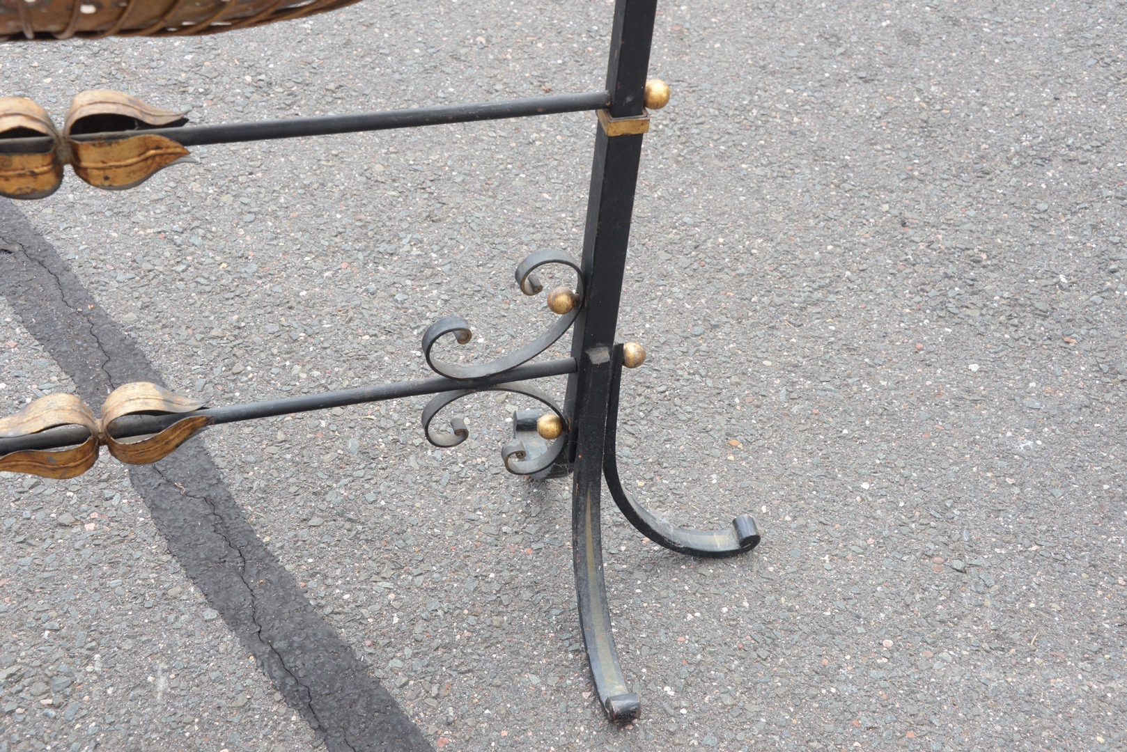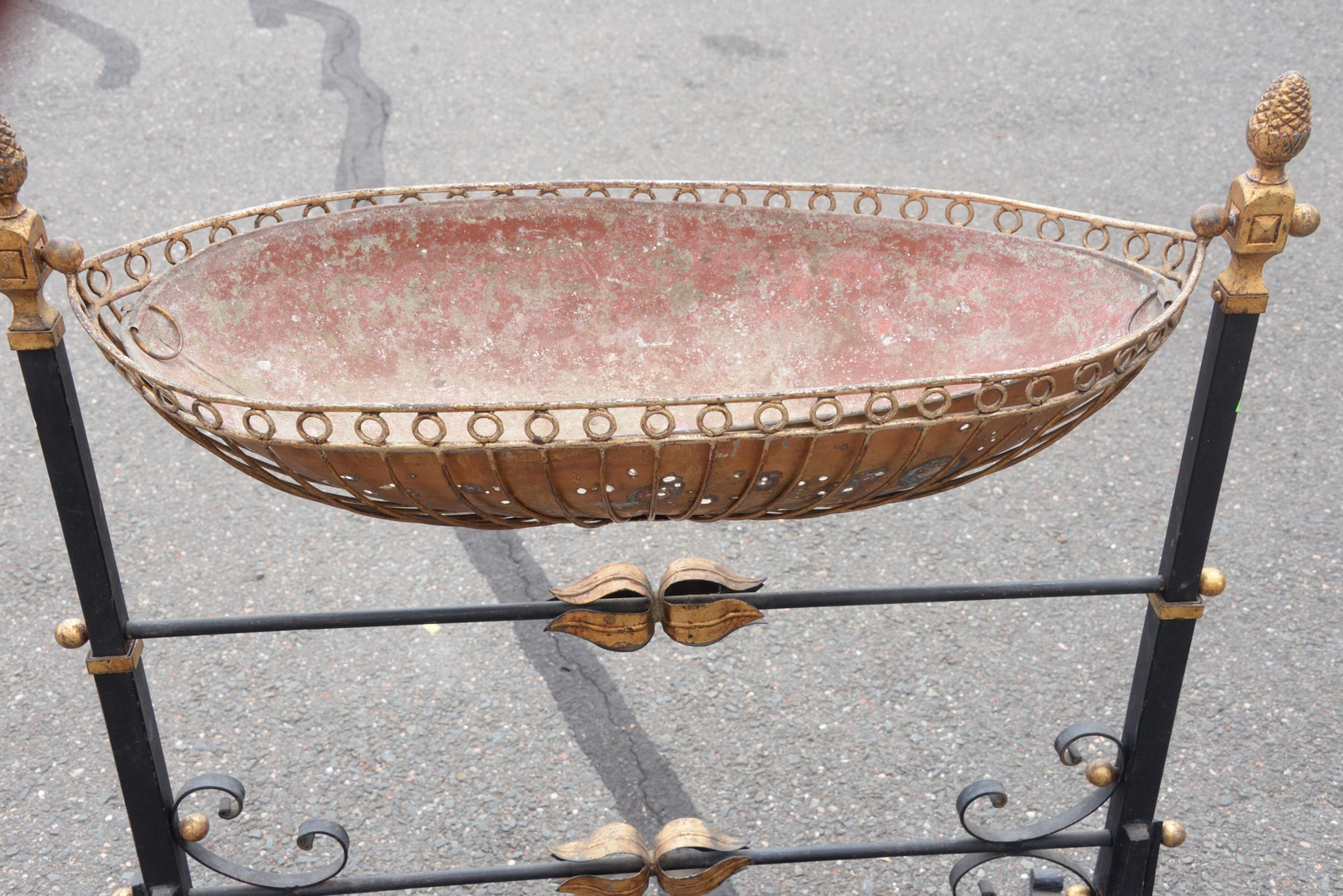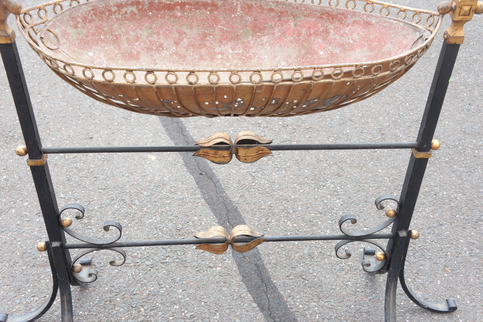 French Iron Swing Planter, black with gilt accents, height 40 inches and 37 inches.