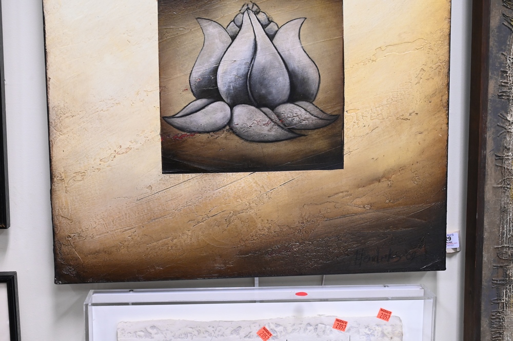 Lot 429: John Hendriks (20th century), Blossoming Flower, oil on canvas, signed lower right Hendriks 04, also signed on verso J. Hendriks 2004, 24″x 24″.