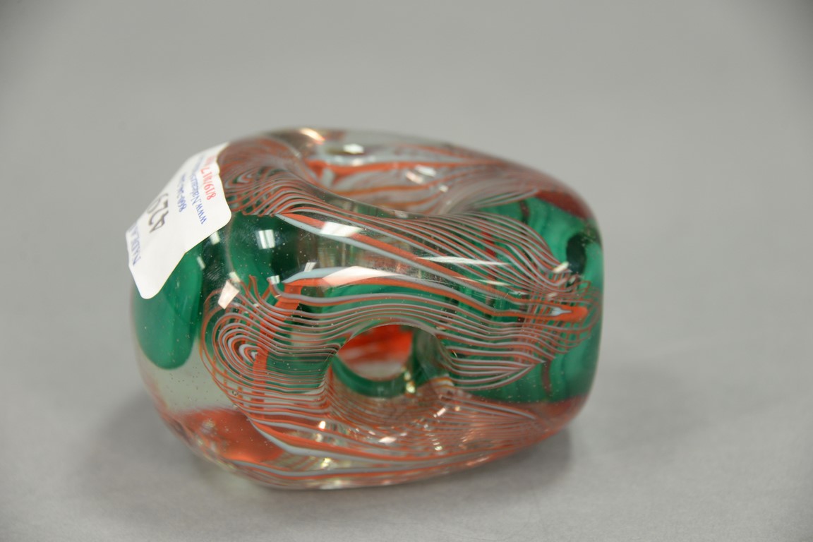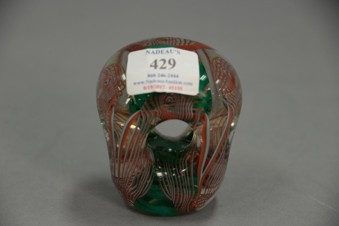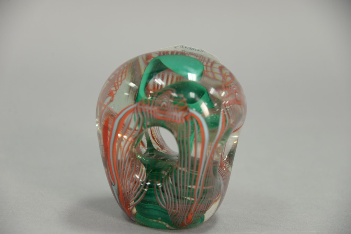 Lot 429: Karlin Rushbrooke art glass paperweight in green, red, and white, marked Karlin Rushbrooke A168 1978. ht. 3 1/2in.
