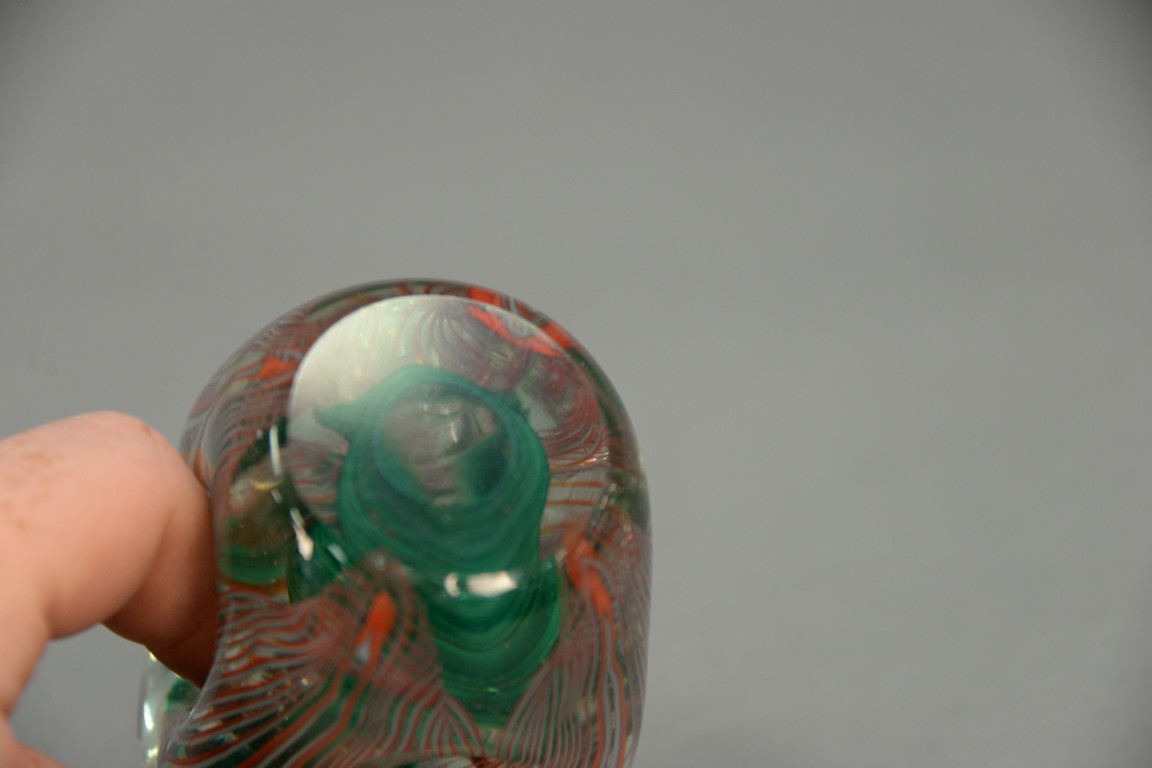 Karlin Rushbrooke art glass paperweight in green, red, and white, marked Karlin Rushbrooke A168 1978. ht. 3 1/2in.