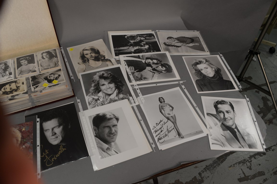 Large grouping of actor and actress postcards and photographs signed and unsigned including Large binder of postcards, 53 are autographed including 2 Arlene Dahl, 2 Catherine Deneuve, 18 Yvonne De Carlo, 4 Kirk Douglas, 2 Douglas Fairbanks, 1 Anita Ekberg, 1 Linda Evans, 3 Rhonda Fleming, 1 Glenn Ford, 1 Jose Ferrer, 1 Robert Fuller, 2 Errol Flynn, 4 Ava Gardner, 1 David Garrett, 2 James Garner, 3 Farley Granger, and 5 signed illegibly, plus over 400 unsigned postcards and a large group of 60 photographs, 26 are autographed including 2 Mel Ferrer, 1 Sally Field, 2 Eddy Fisher, 1 Peggy Fleming, 8 Rhonda Fleming, 2 Nina Foch, 2 Jane Fonda, 4 Harrison Ford, 1 Jodi Foster, 1 John Forsythe, 1 Michael J. Fox, and 1 Robert Foxworth and 34 are unsigned including 31 Errol Flynn, 2 Jane Fonda, and 1 Harrison Ford.