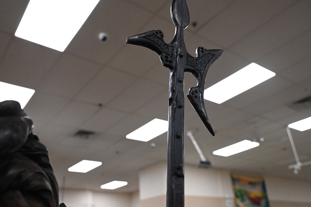 Pair of Large 19th Century Italian Carved Wood Figures of Cavaliers, mounted on pedestals, intricately carved in the Renaissance style, right and left facing, attired in belted intaglio incised tunics having breastplates with motifs of the Venetian winged lion, having ruffled neck collars and sleeves, figures holding halberds in opposing arms, pedestals ornately relief carved with figural corner elements, centering the side plaques with goat head, armorial, foliate and floral carved motif, overall height 89 inches; height (figure and pedestal) 77 inches, height (figure) 46 inches; width 18 inches; diameter 18 inches.