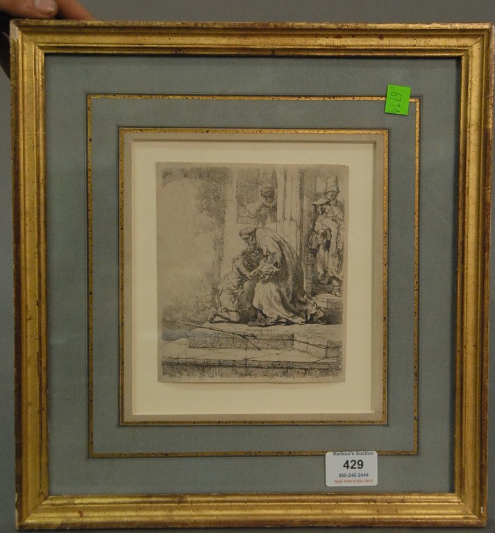 Lot 429: Rembrandt Van Rijn THE RETURN OF THE PRODIGAL SON etching signed center in the plateRembrandt 1636 6 1/4 x 5 1/…