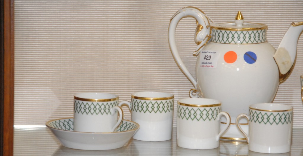Russian porcelain tea set to include a pot with dolphin handle, five cups, waste bowl, and two saucers repair to spout.