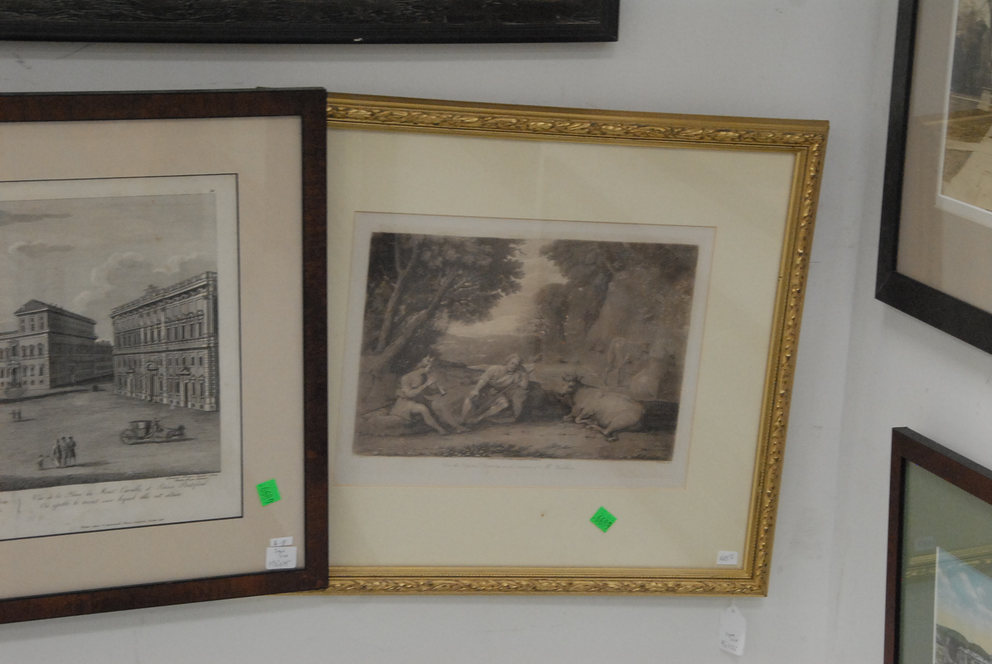 Three framed pieces 2 English sepia allegorical scenes John Boydell/Richard Earlem circa 1780, and an engraving from Architectural Views Of Rome by Parboni/ Giacomo Antonelli 1824.
