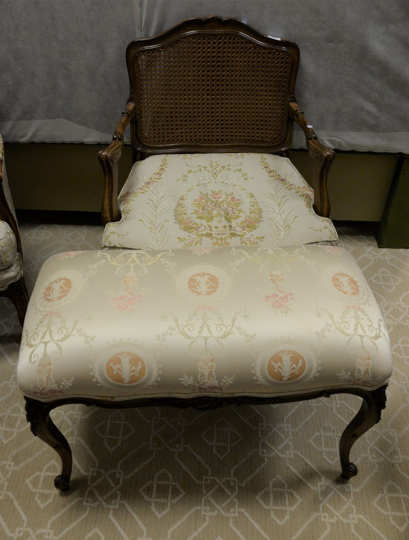 Lot 429: Two Piece Lot, to include Louis XV style caned chair and Louis XV style bench, each with custom silk upholstery, seat height 16 inches.