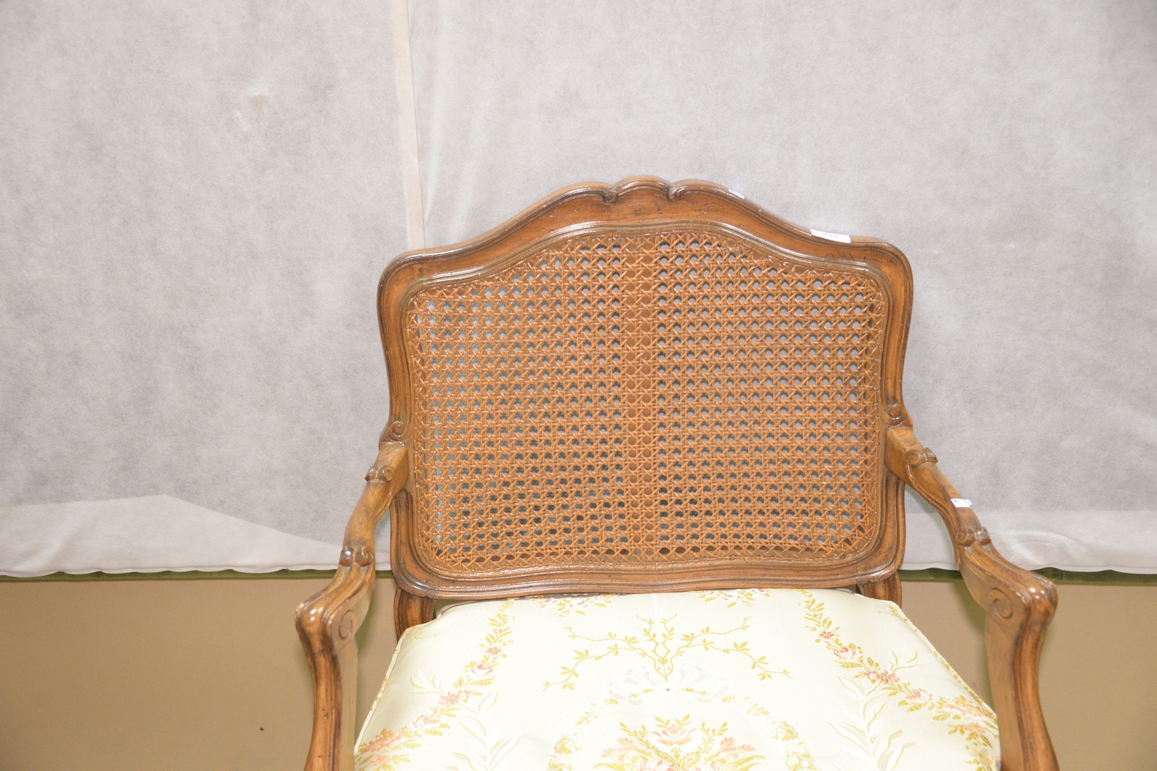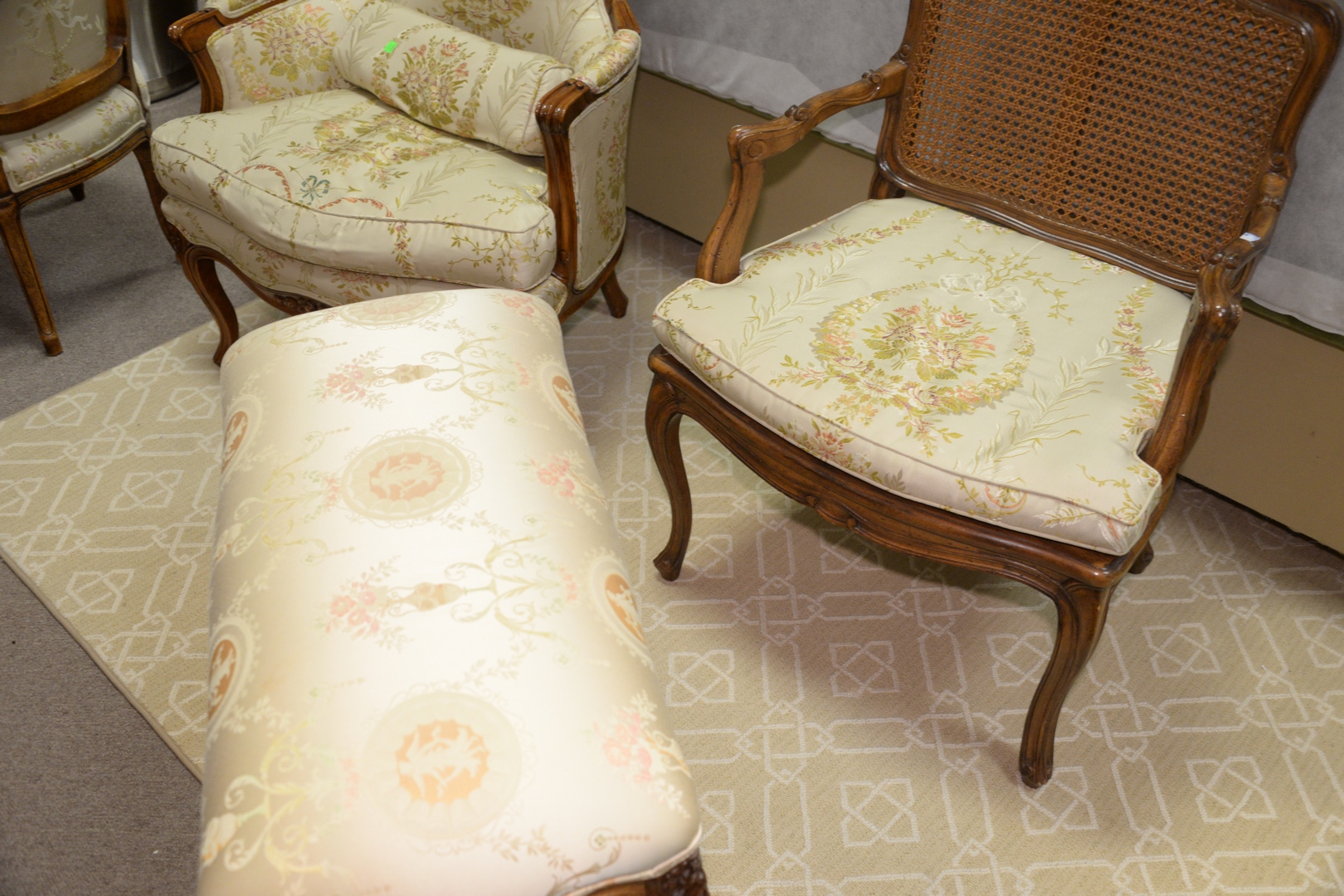 Two Piece Lot, to include Louis XV style caned chair and Louis XV style bench, each with custom silk upholstery, seat height 16 inches.