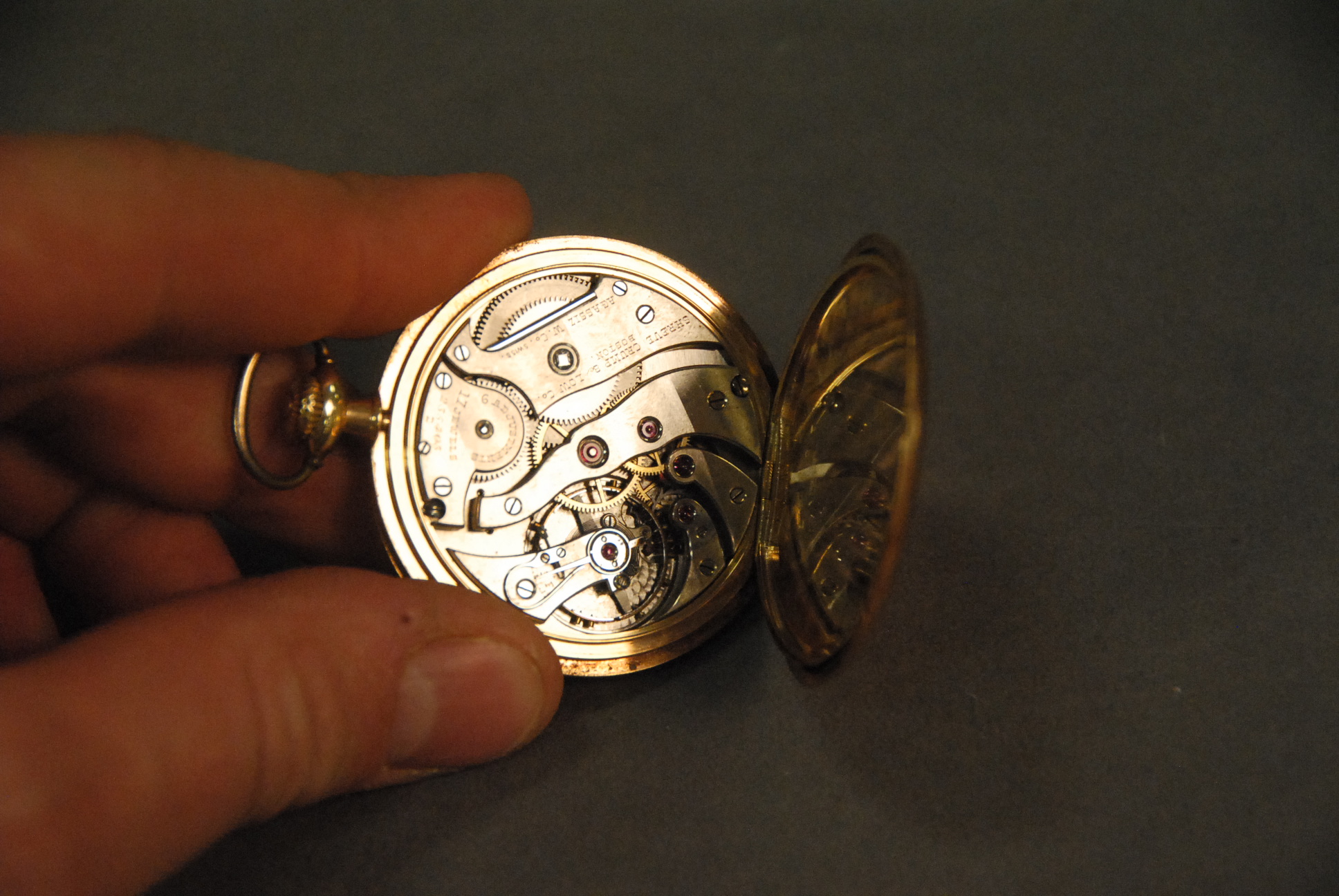 14K gold pocket watch with open face marked Shreve Crump & Low Co.