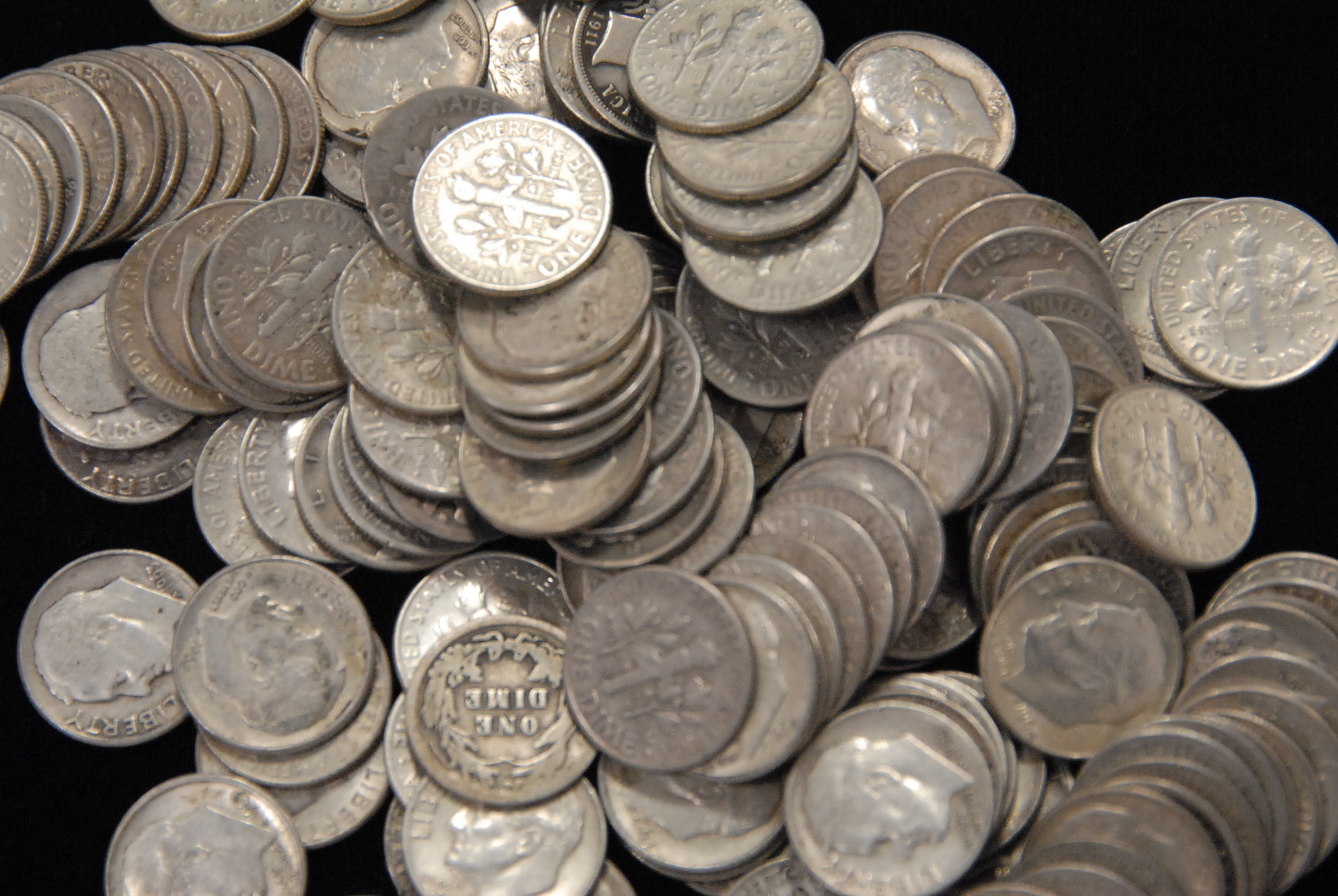 152 silver dimes, 49 silver quarters, and a bag lot of pennies and nickels including some buffalo head and Jefferson nickels