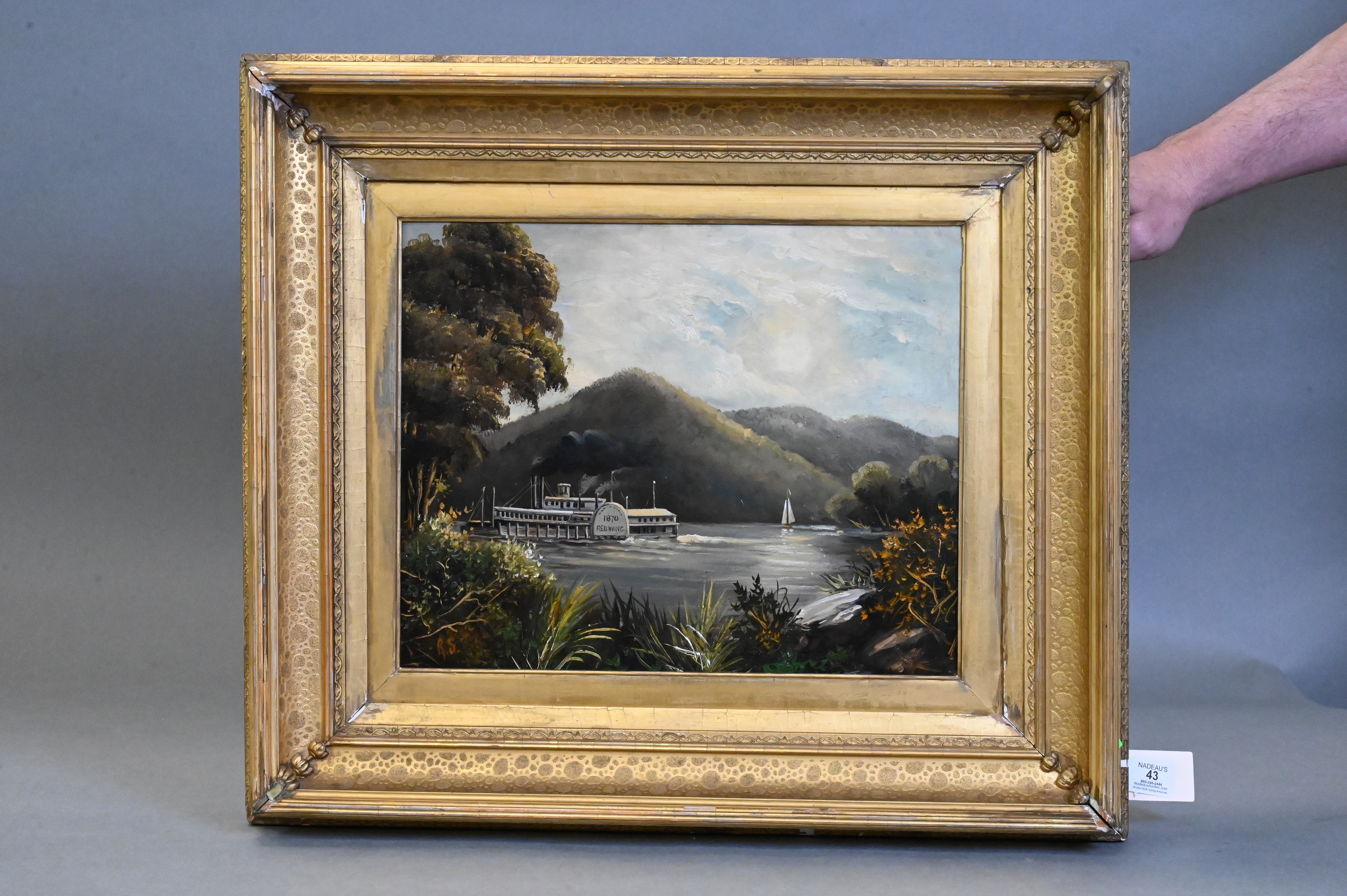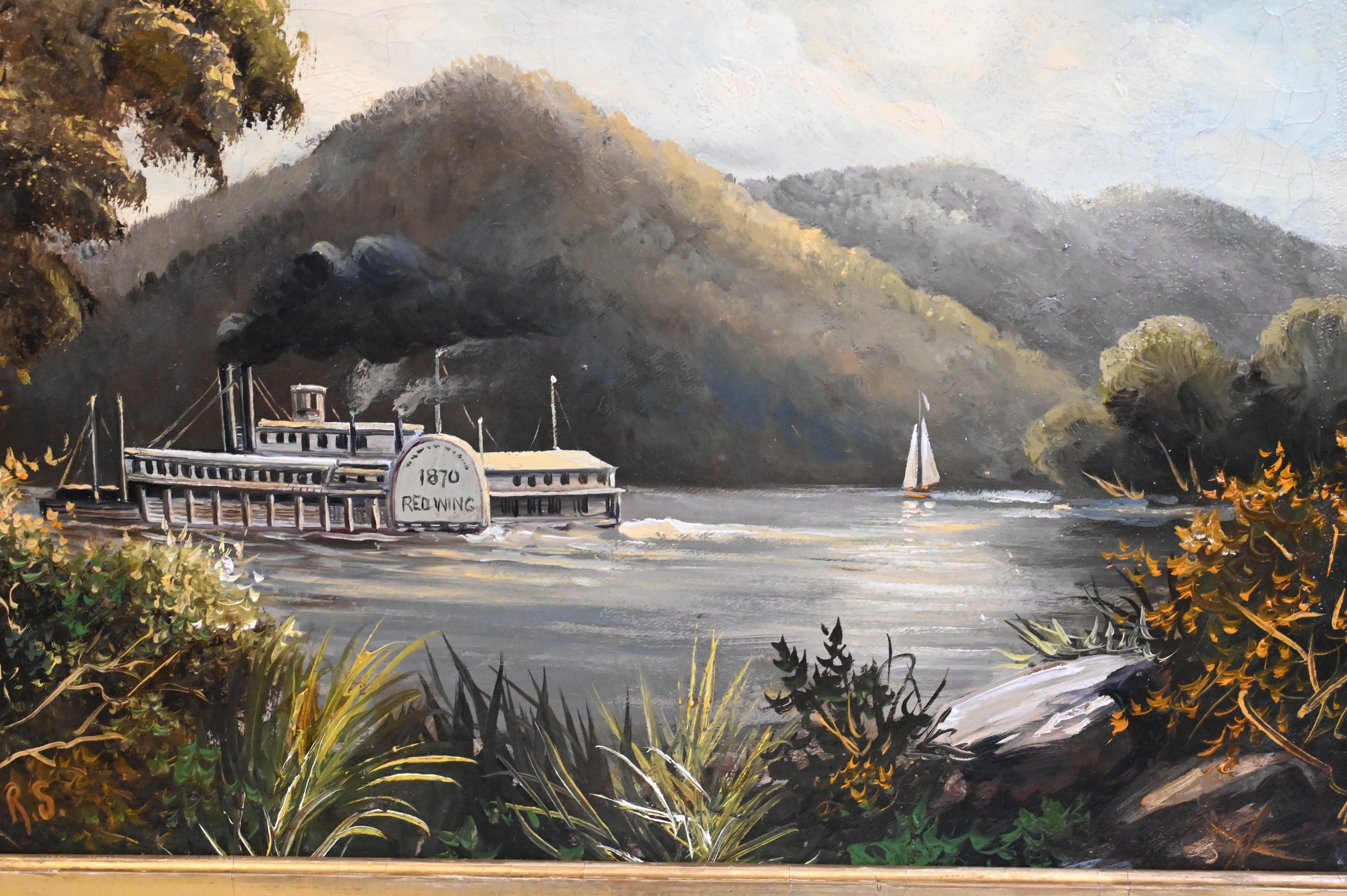 Oil on canvas depicting a river landscape with sidewheel steamboat and sailboat before mountainous terrain, housed in period frame