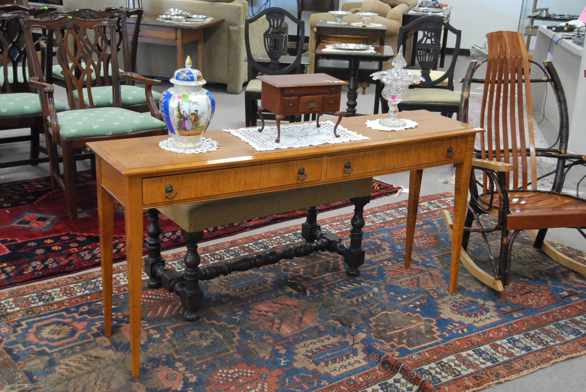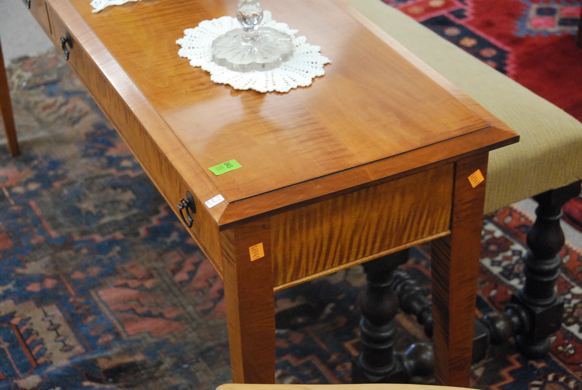 Lot 43: Attributed to Moser, custom made tiger maple hall table, ht. 30in. wd. 60in.