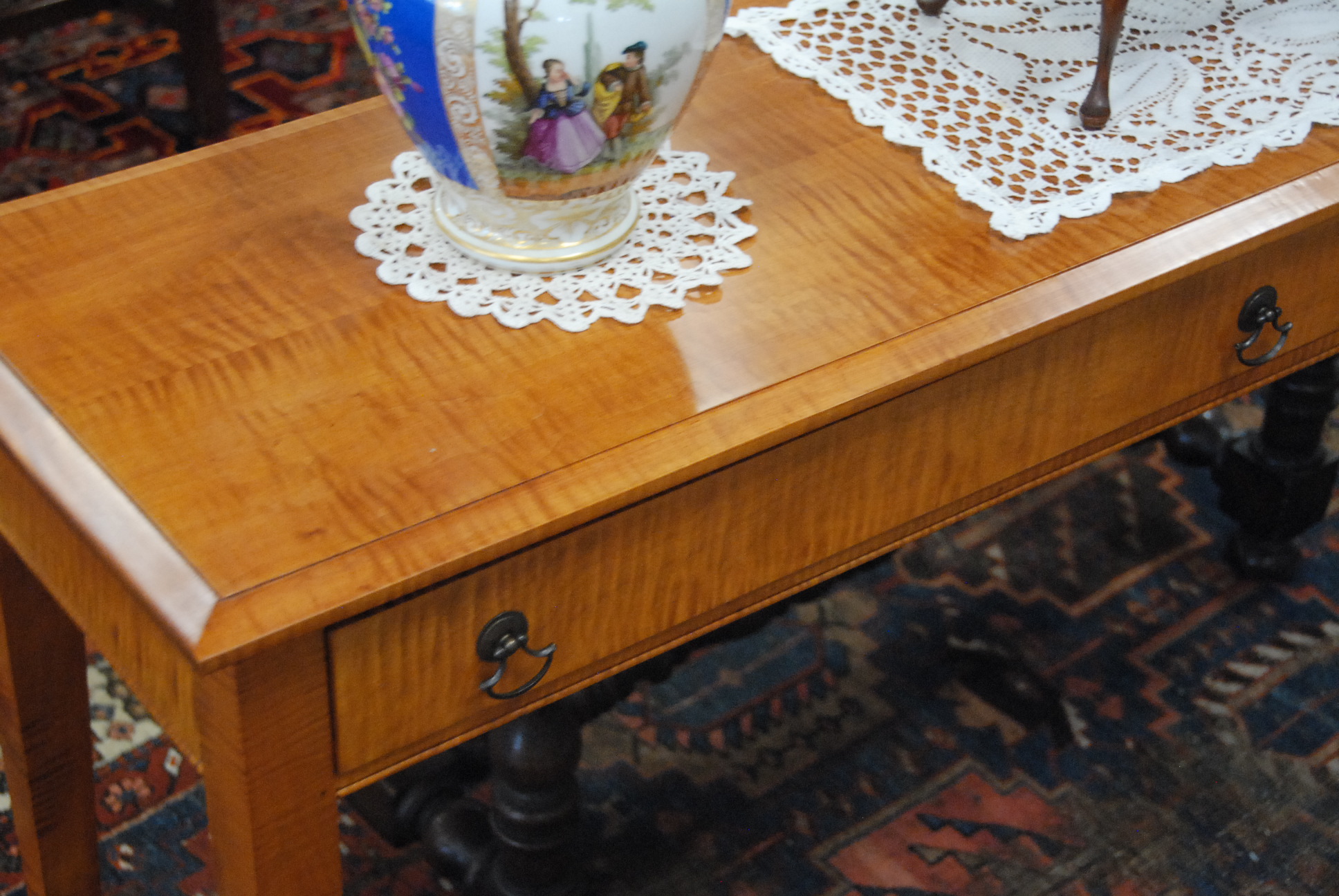 Attributed to Moser, custom made tiger maple hall table, ht. 30in. wd. 60in.