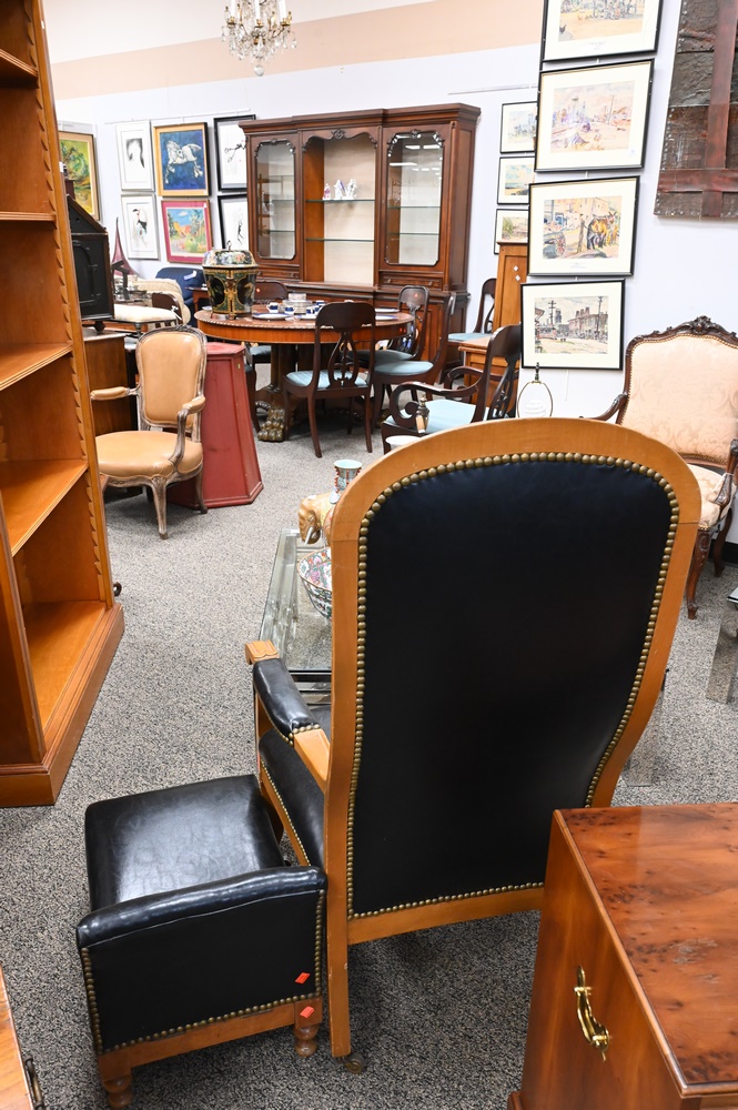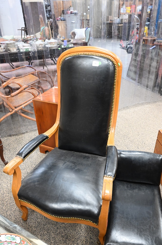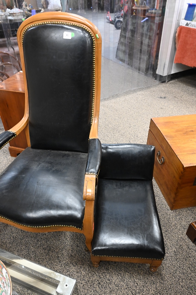 Lot 43: Continental Chair, having matching footstool, black leather, height 44 inches.