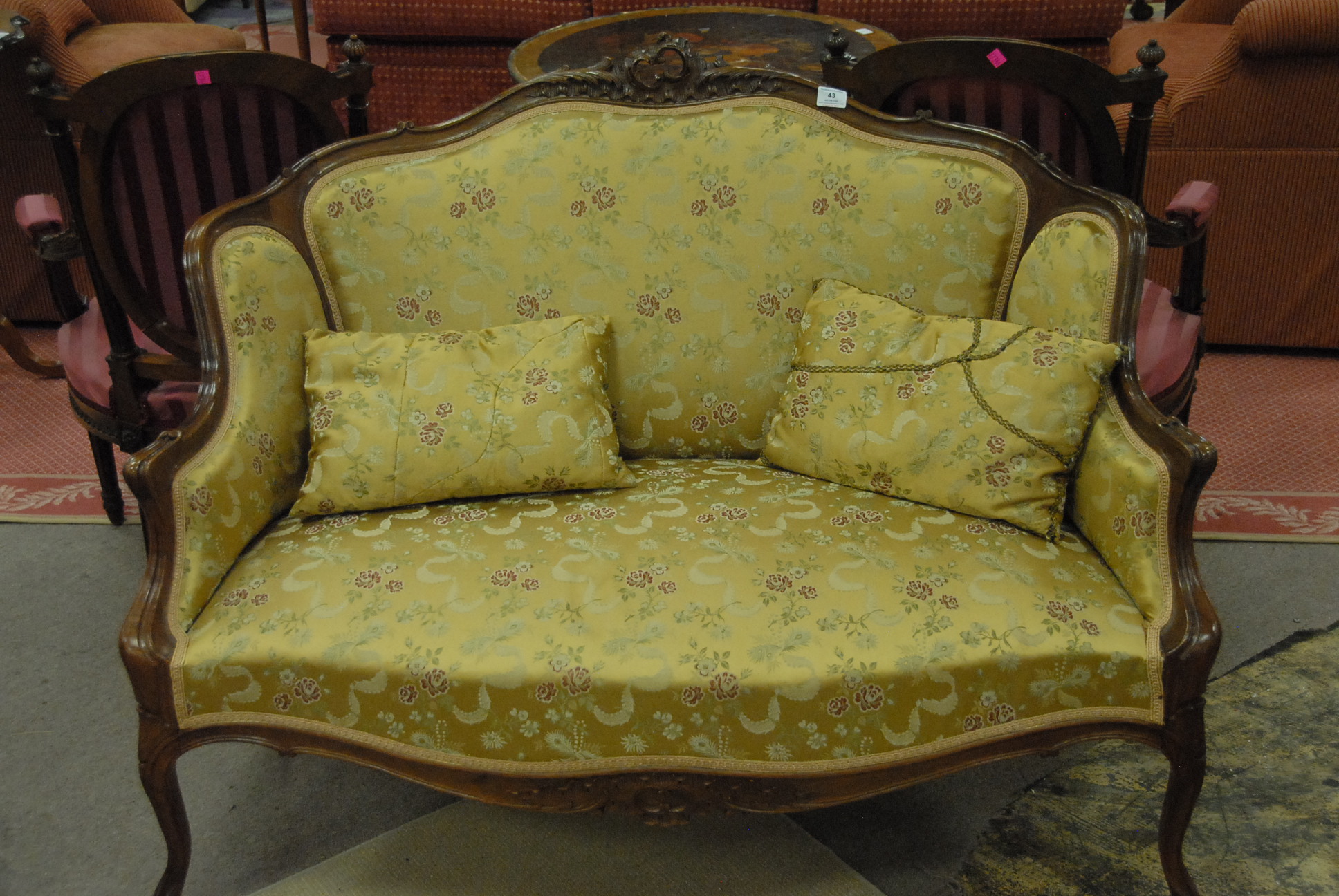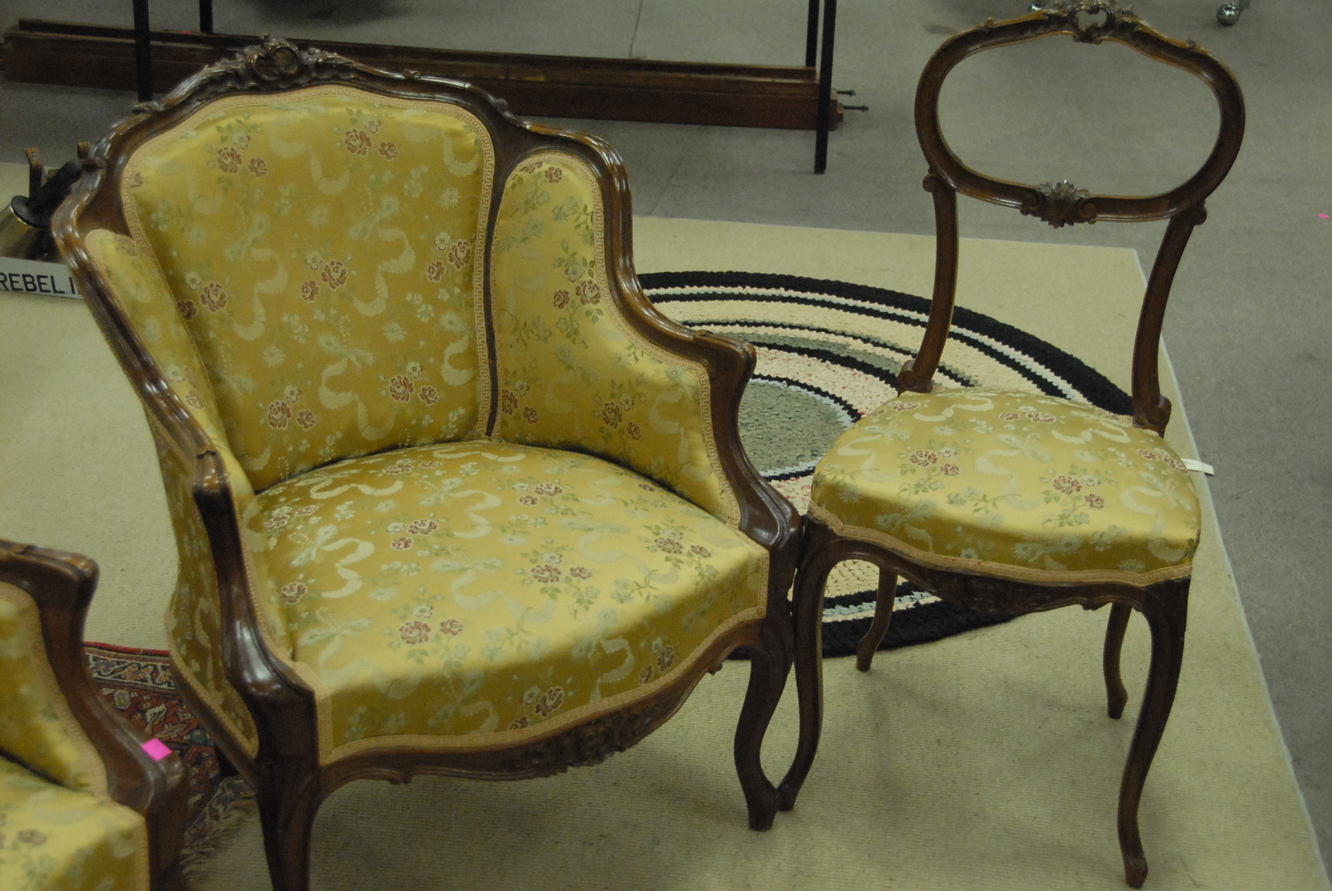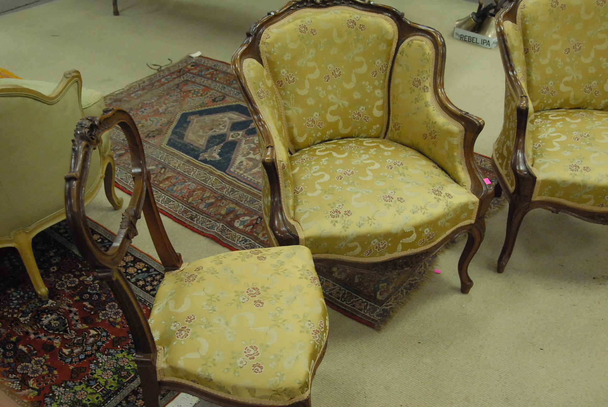 Five piece Louis XV salon suite including loveseat, two armchairs, and two side chairs.