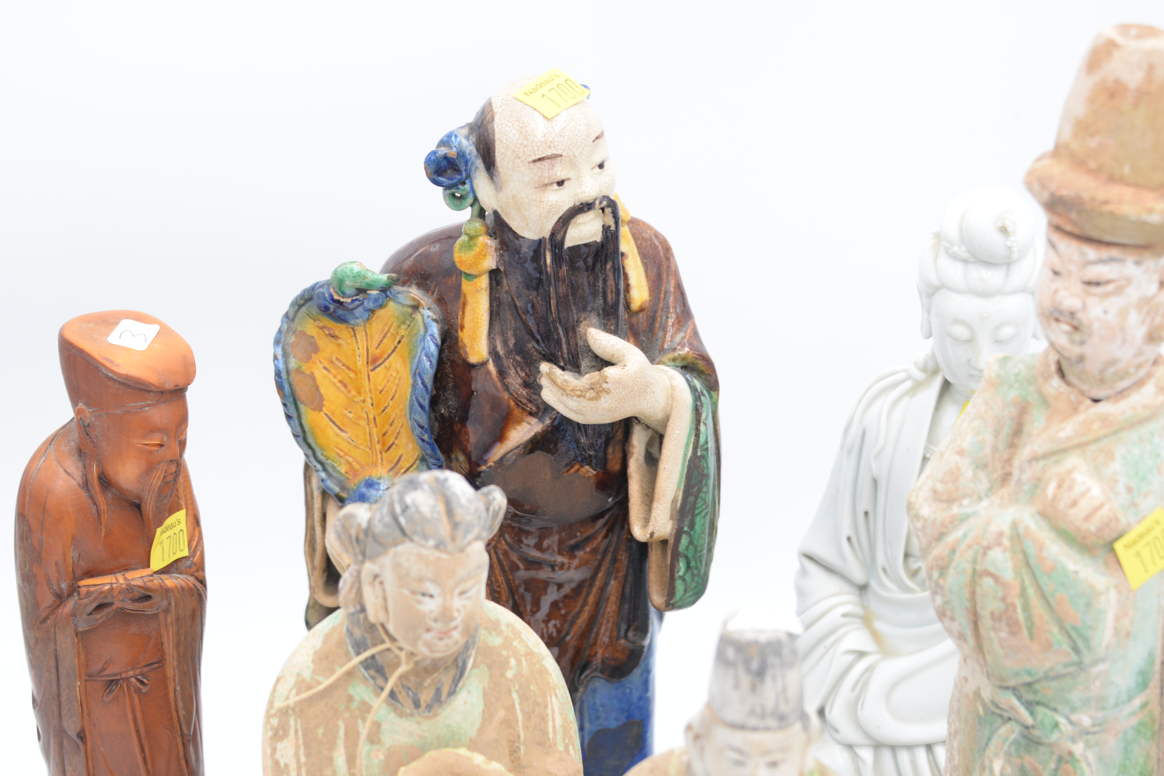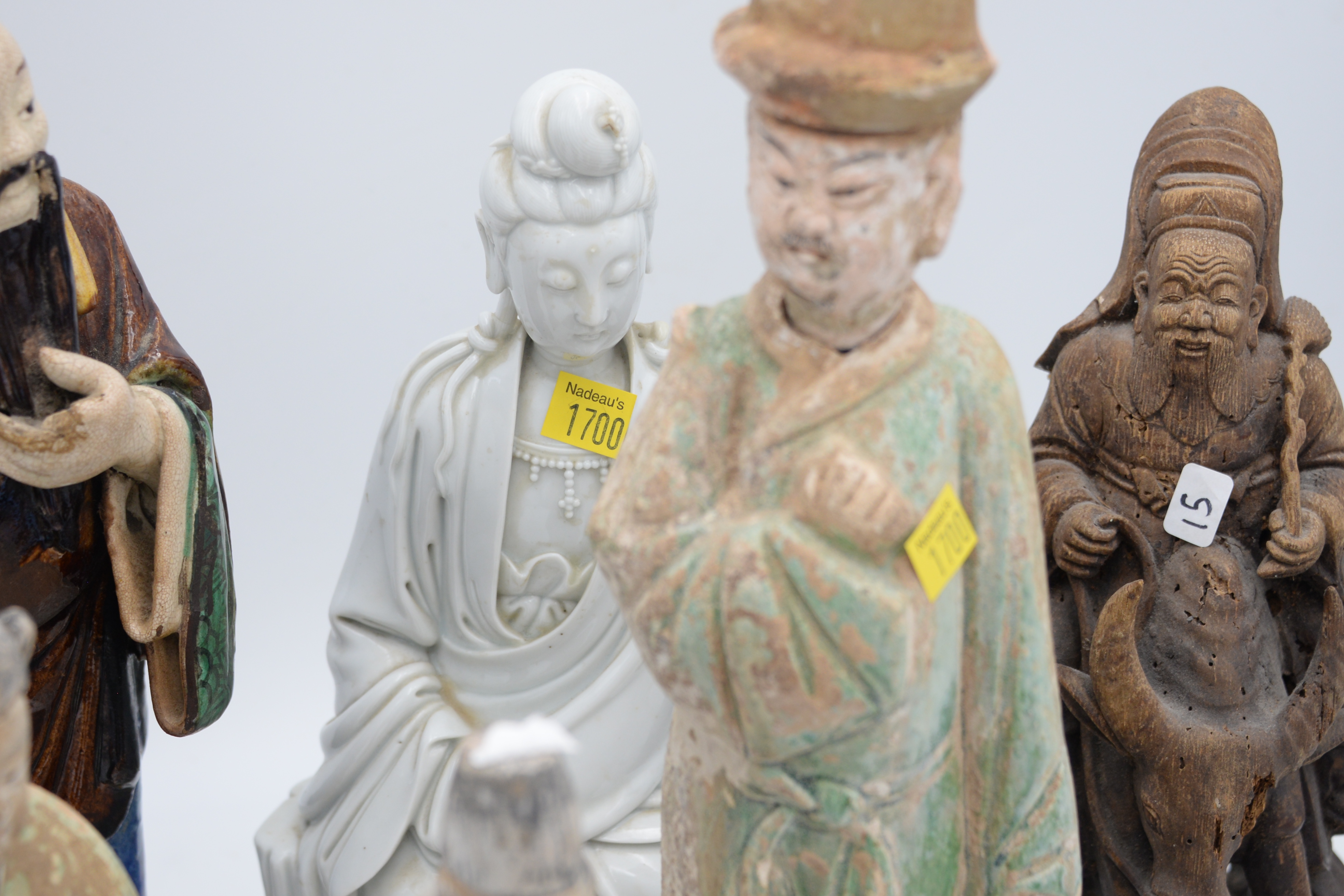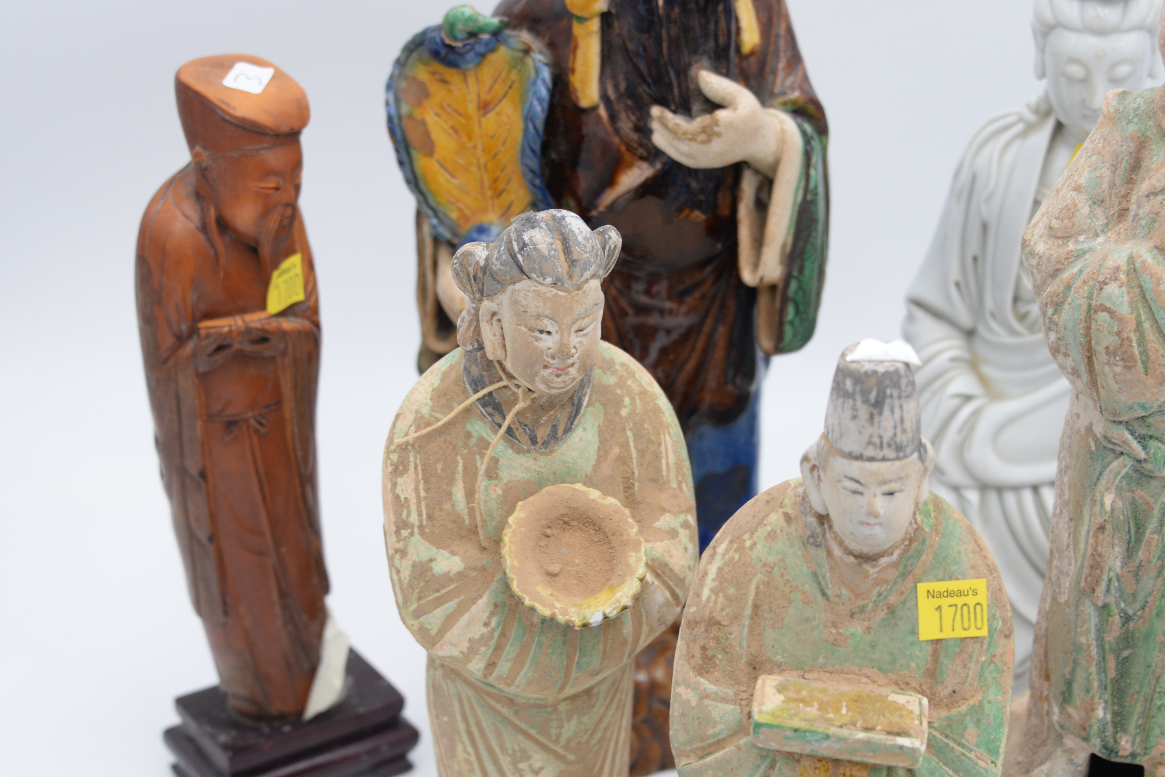Group of Seven Chinese Figures to Include, Blanc de chine Guanyin, pair Tang Sancai male and female attendants, tall tang sancai attendant, ceramic man with fan, two carved wood figures, one riding bull, tallest height 17 inches
