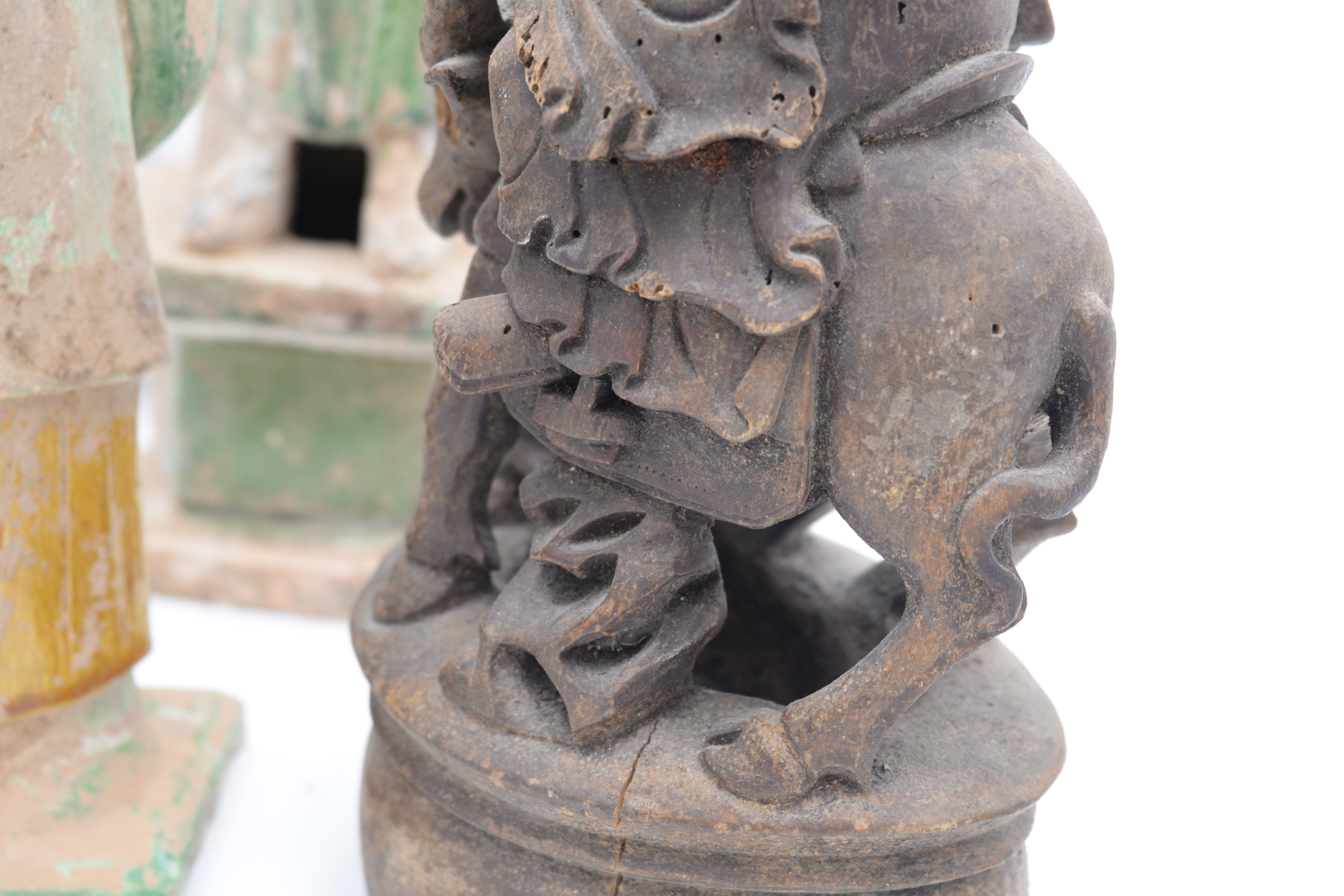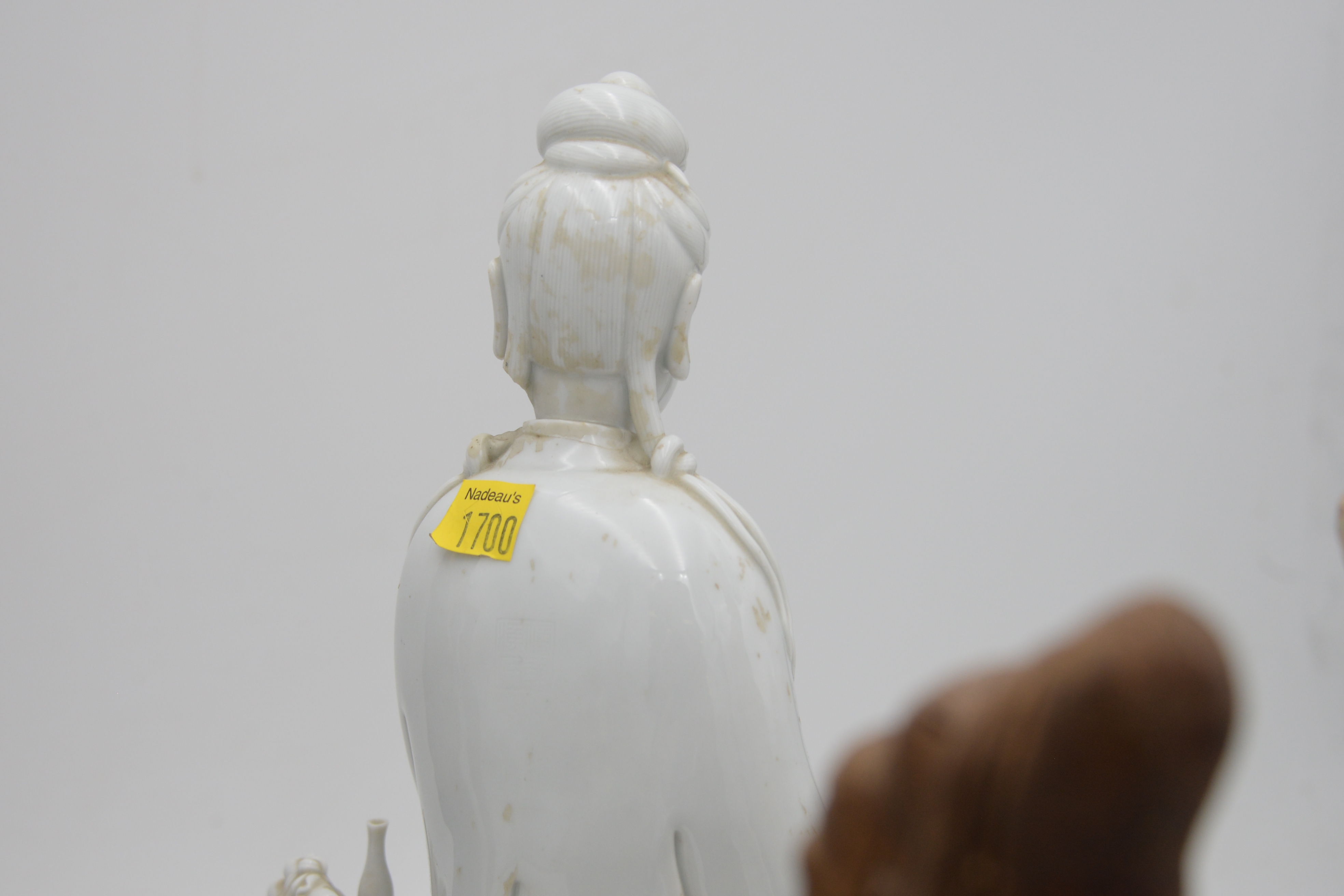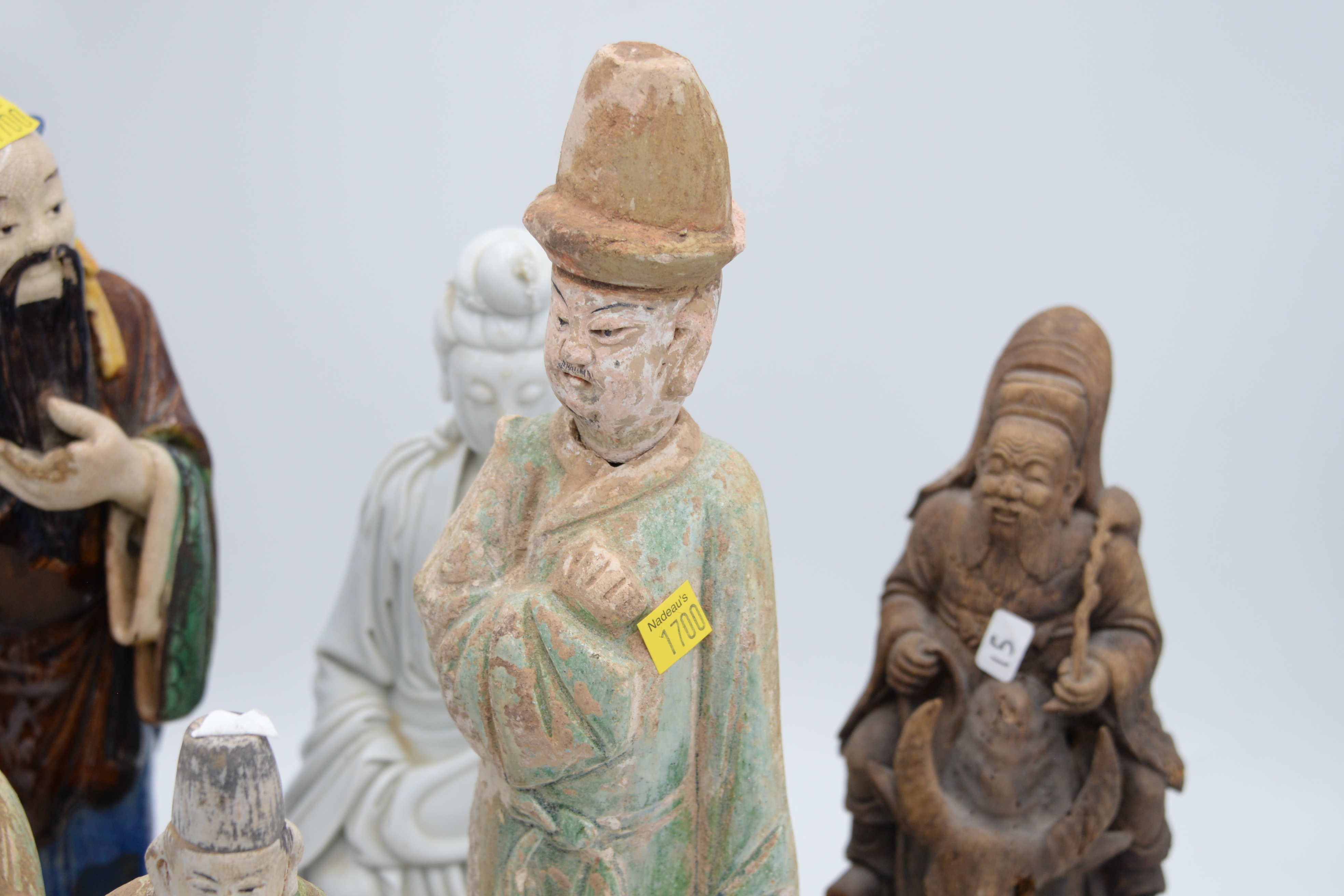 Group of Seven Chinese Figures to Include, Blanc de chine Guanyin, pair Tang Sancai male and female attendants, tall tang sancai attendant, ceramic man with fan, two carved wood figures, one riding bull, tallest height 17 inches