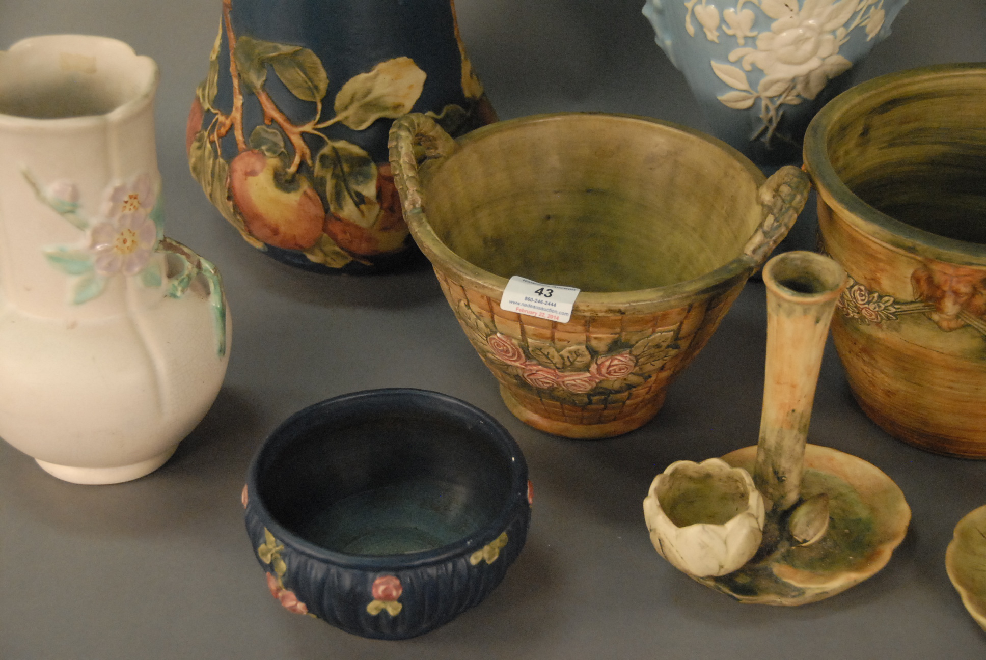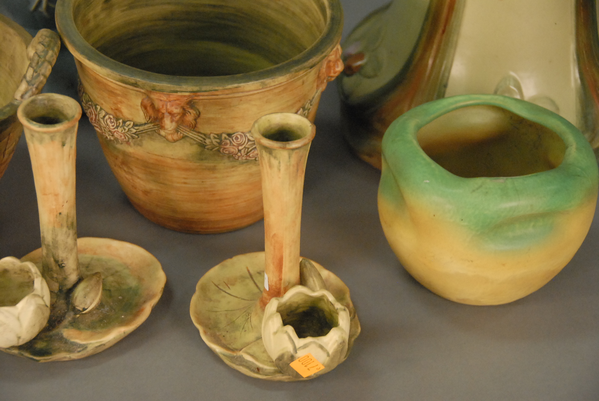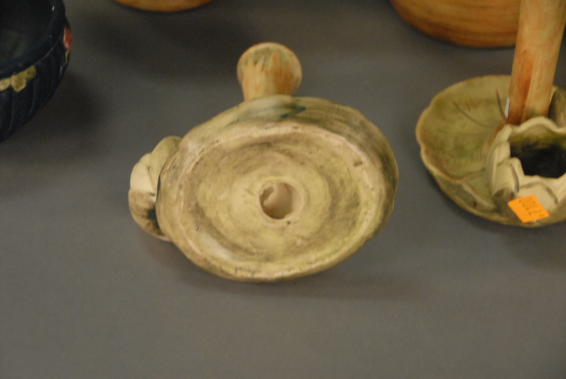 Lot 43: Group of ten pieces of Weller Pottery to include a pair of water lily candlesticks, jardinire with jewel base, pinch vase, etc. hts…