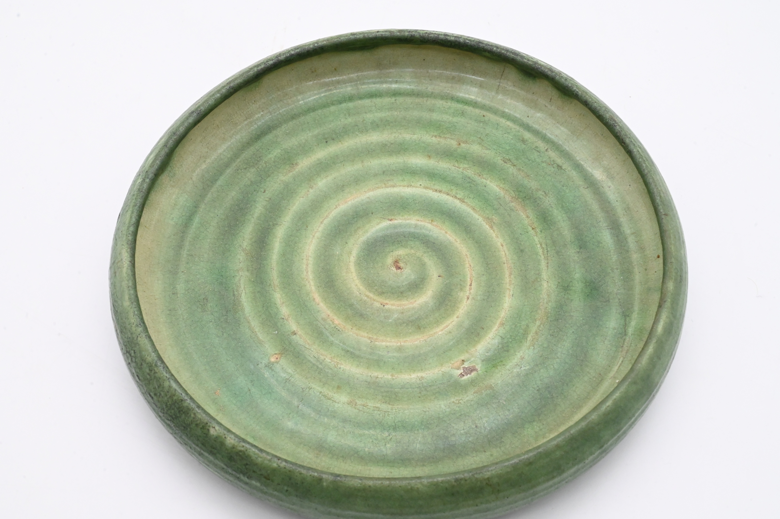matte green glaze, interior having swirl decoration impressed, marked on bottom