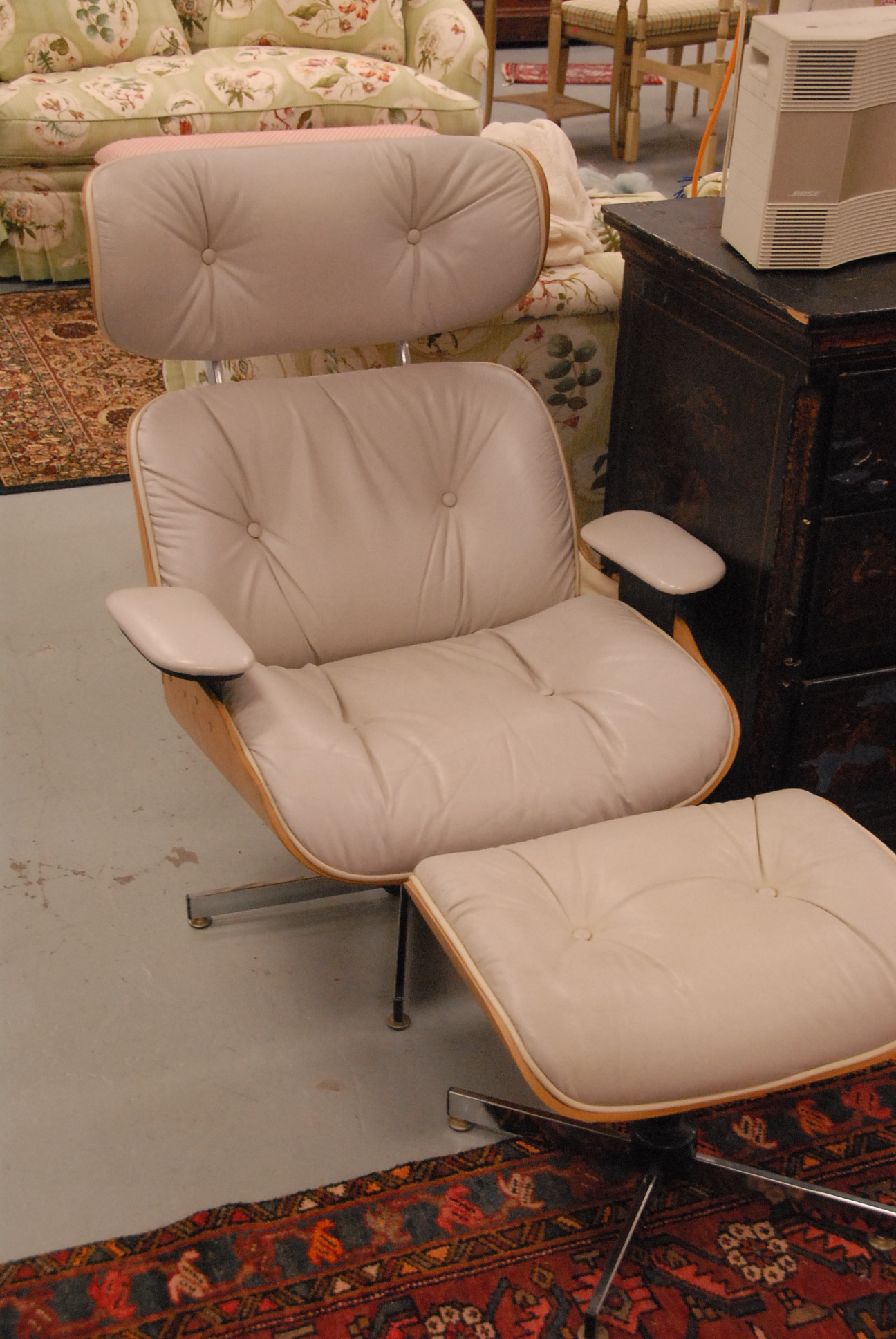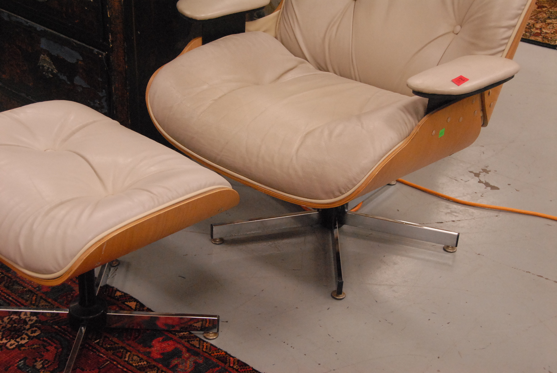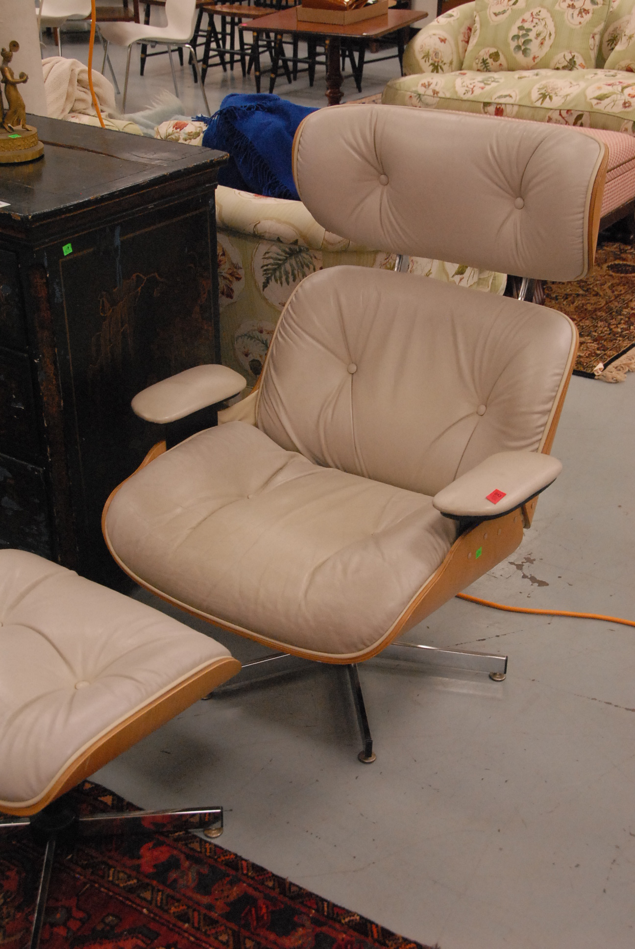 In the manner of Eames lounge chairs in tan leather upholstery with matching ottomans.