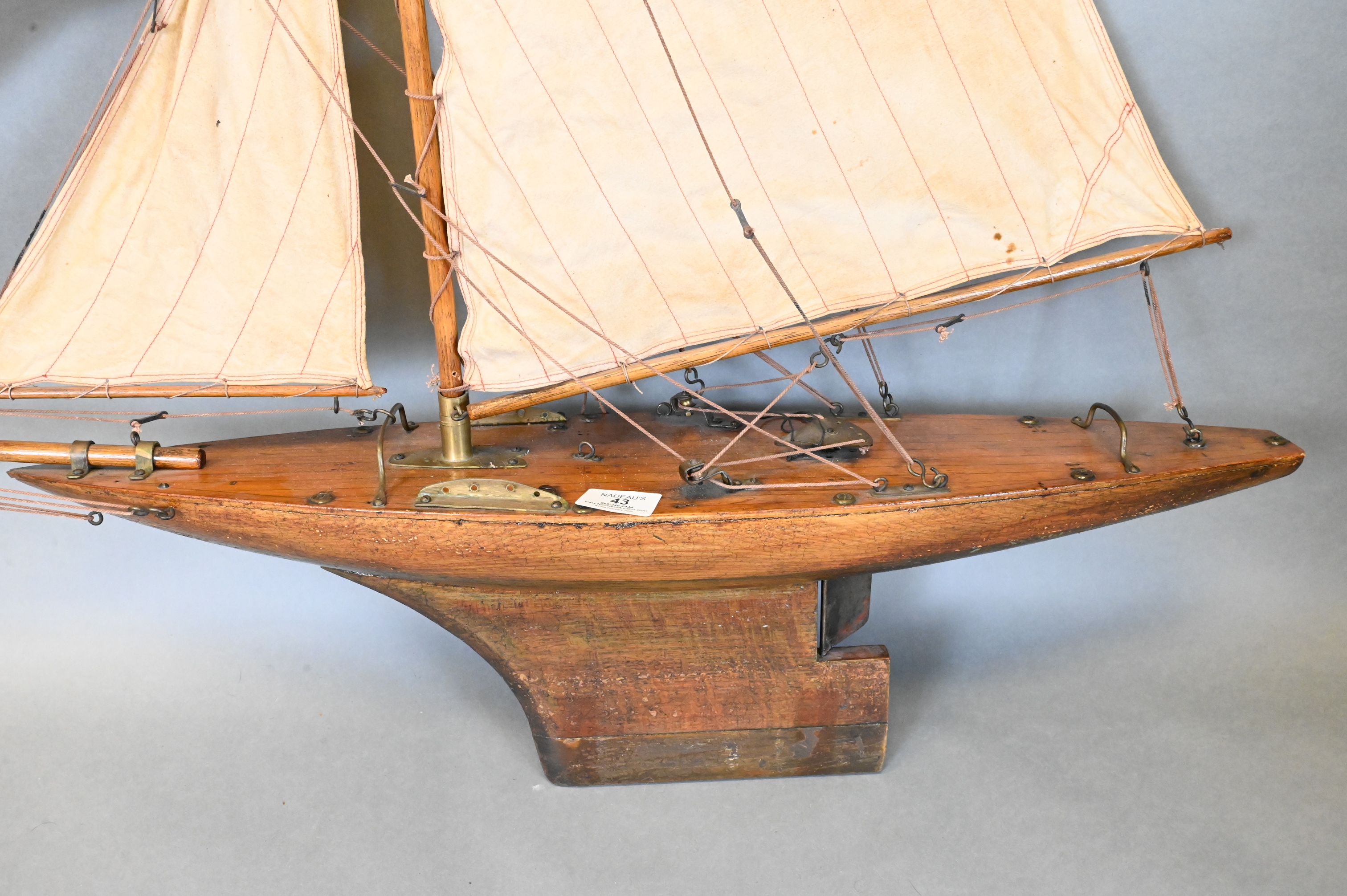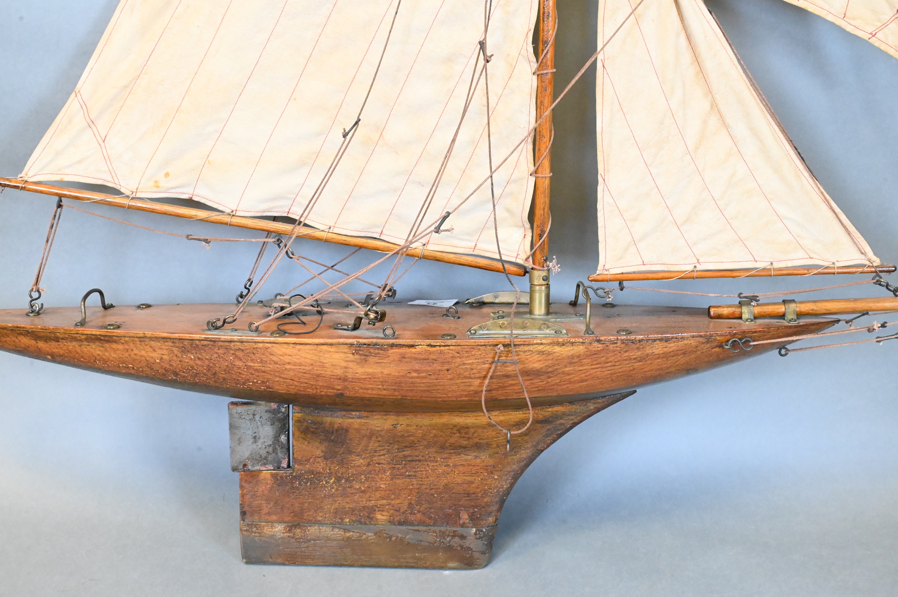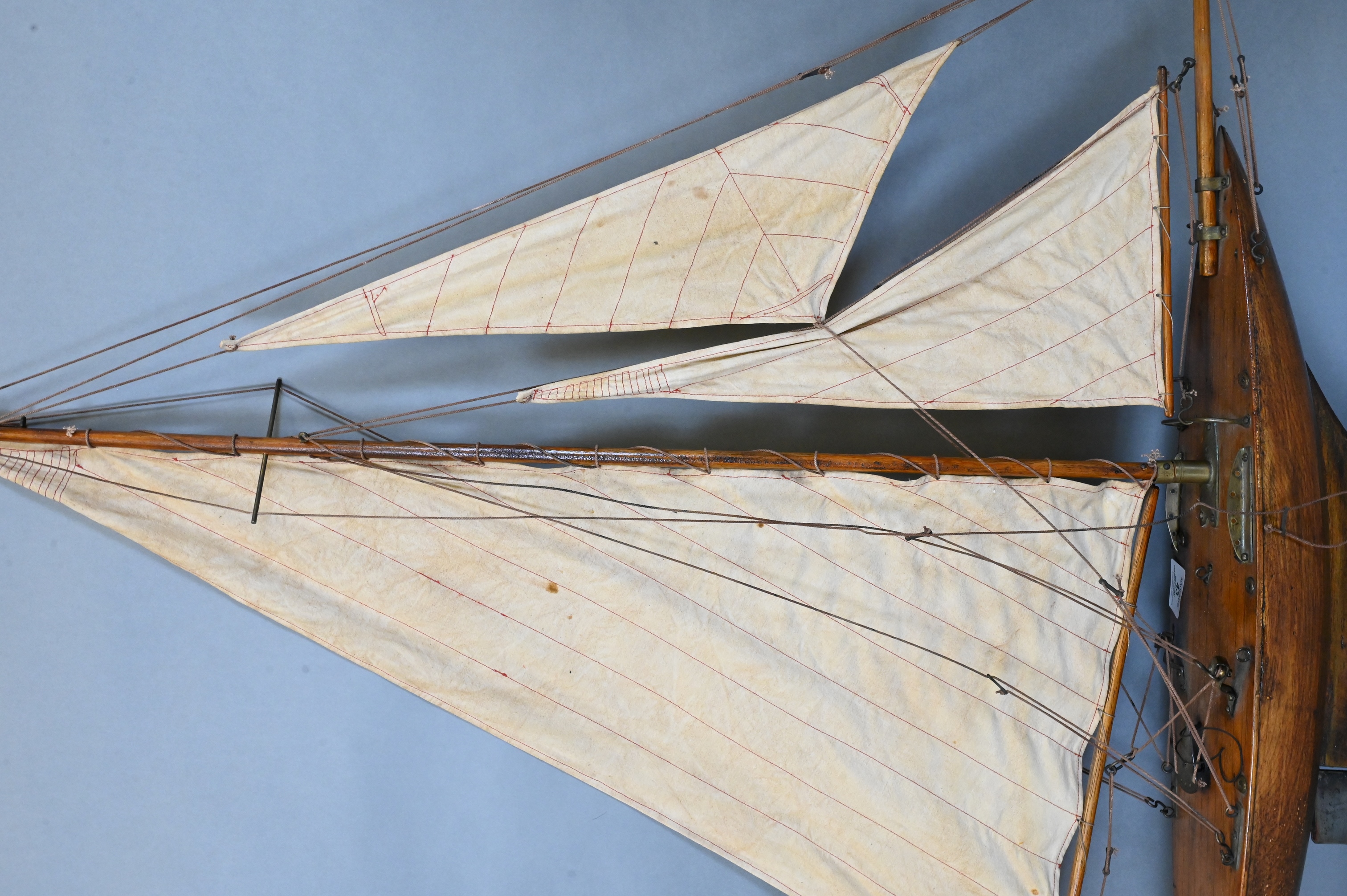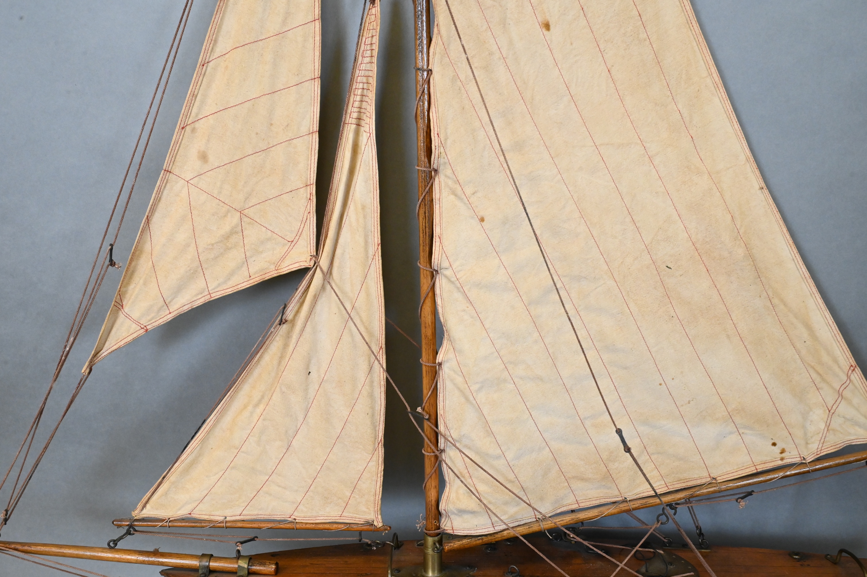 scale model having three striped cotton canvas sails, brass accent, and working pulleys