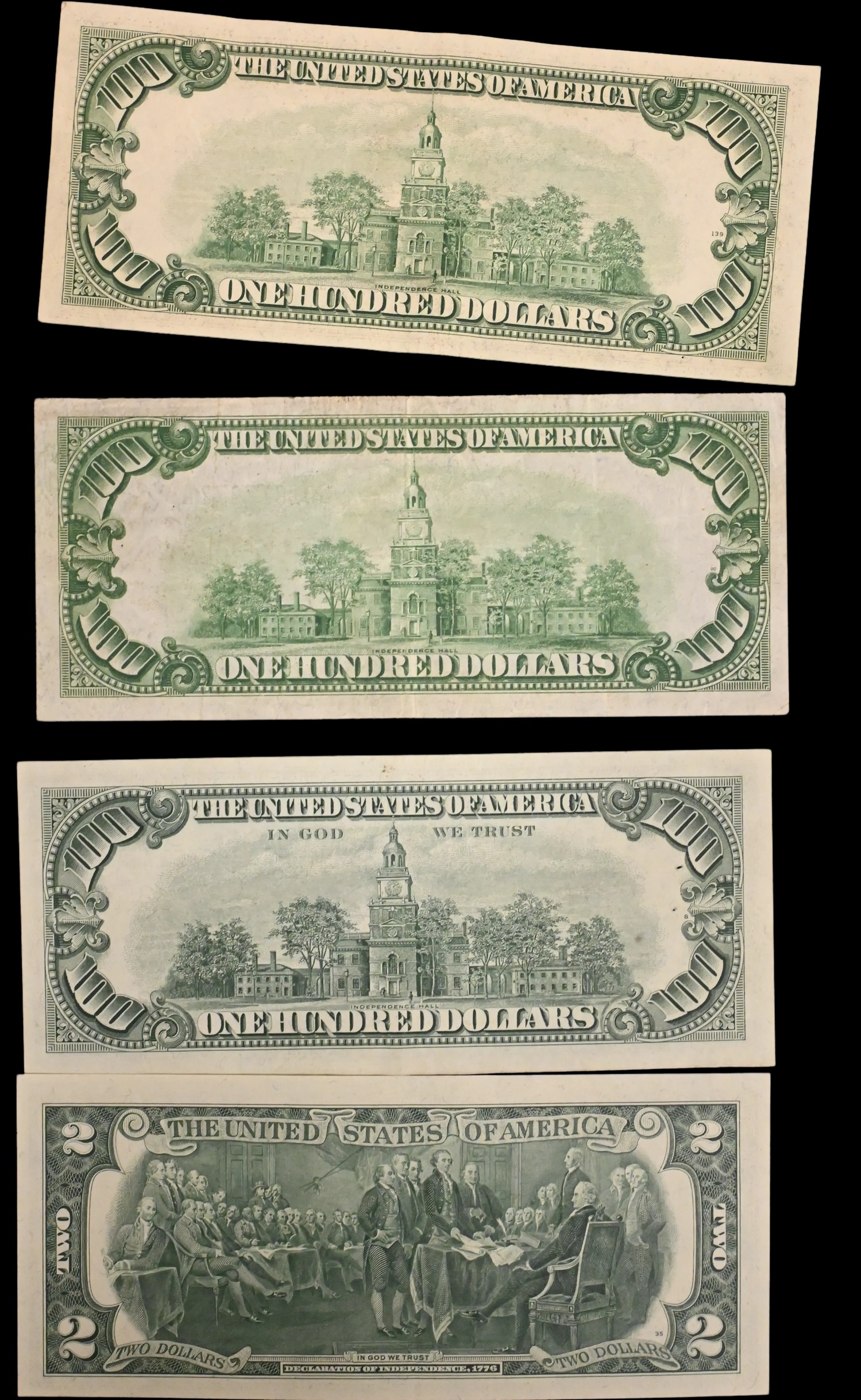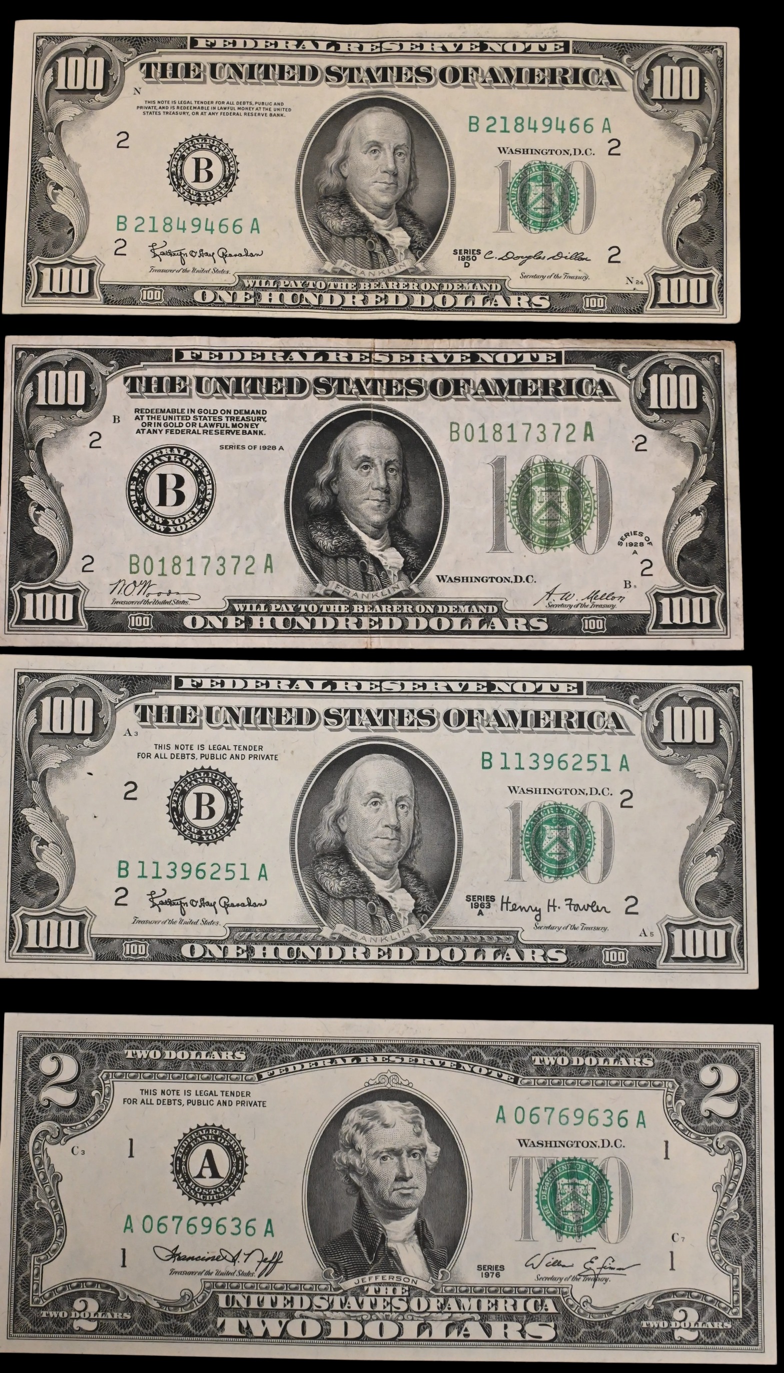 along with two $2 bills federal notes UNC plus one $1 silver certificate UNC and one $100 federal series 1963A note