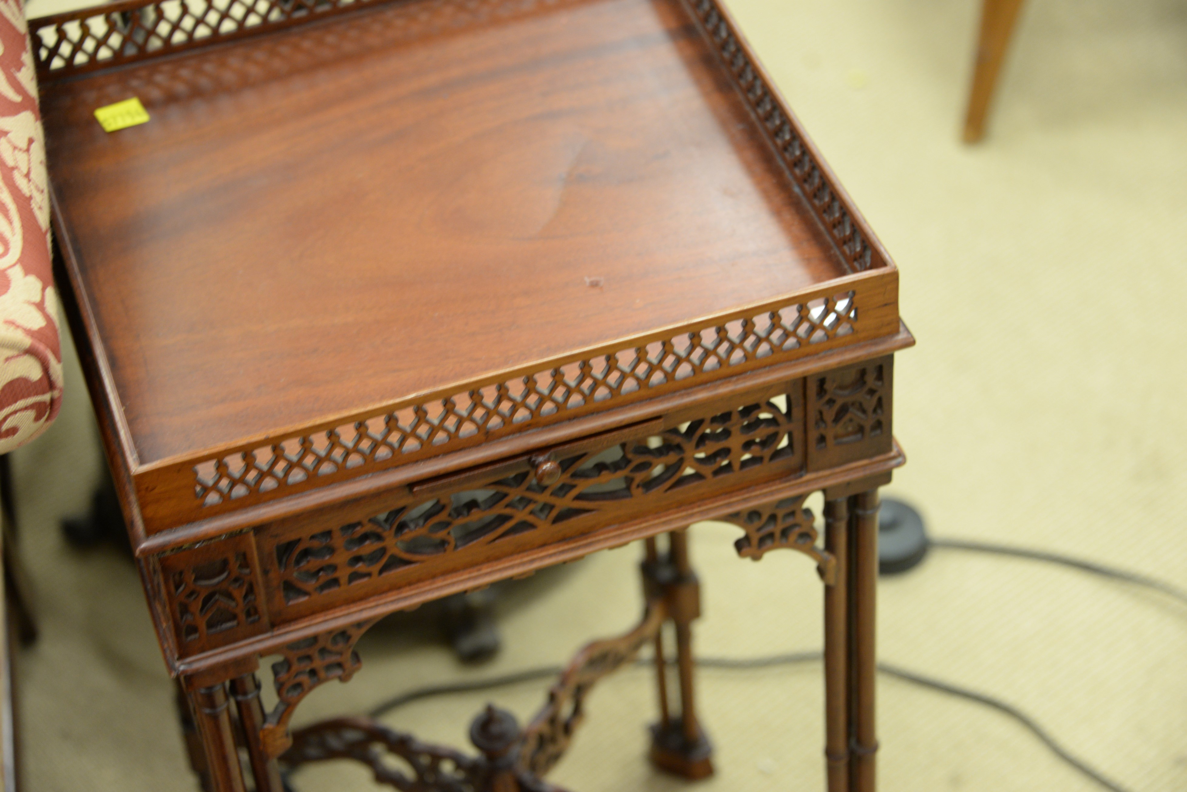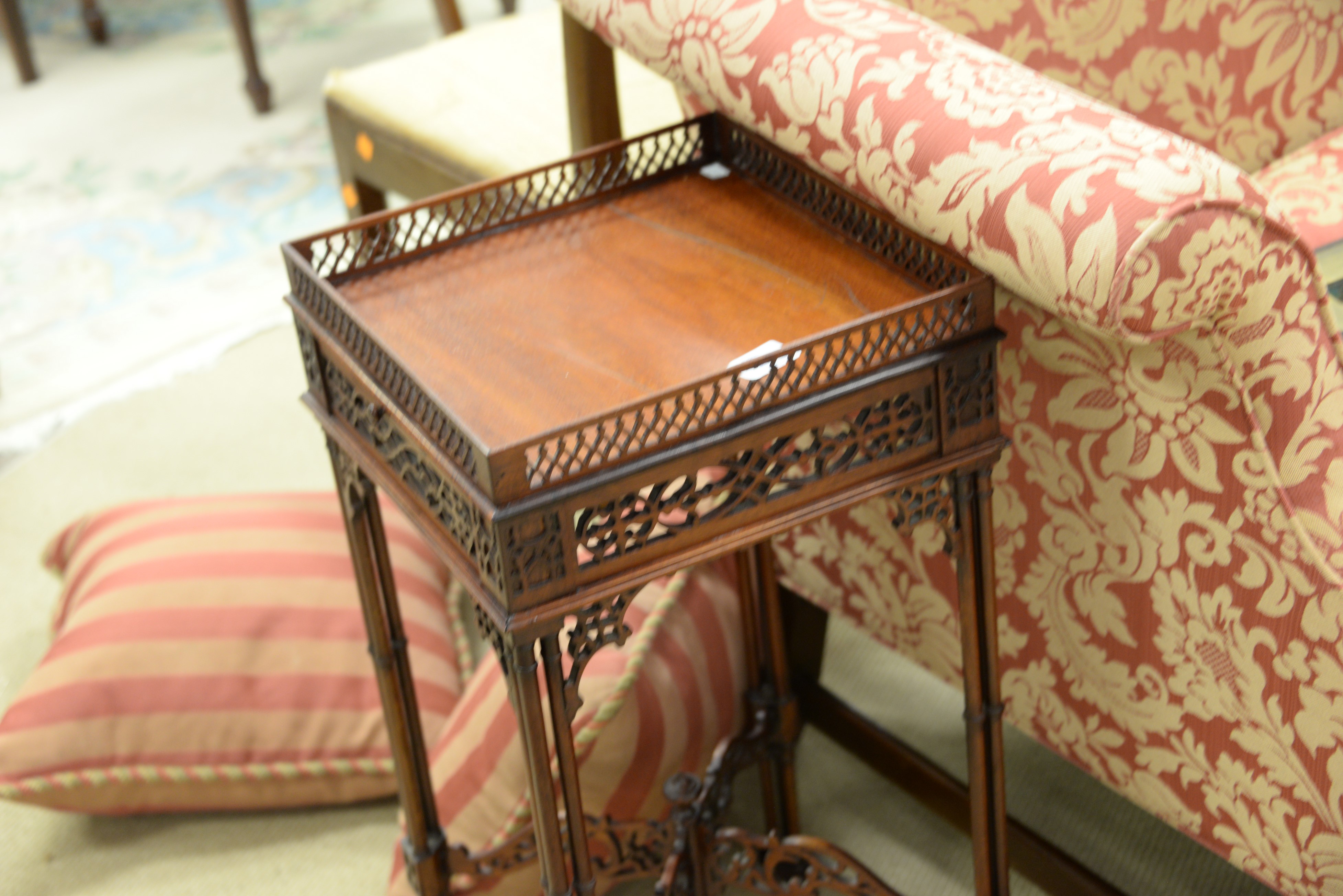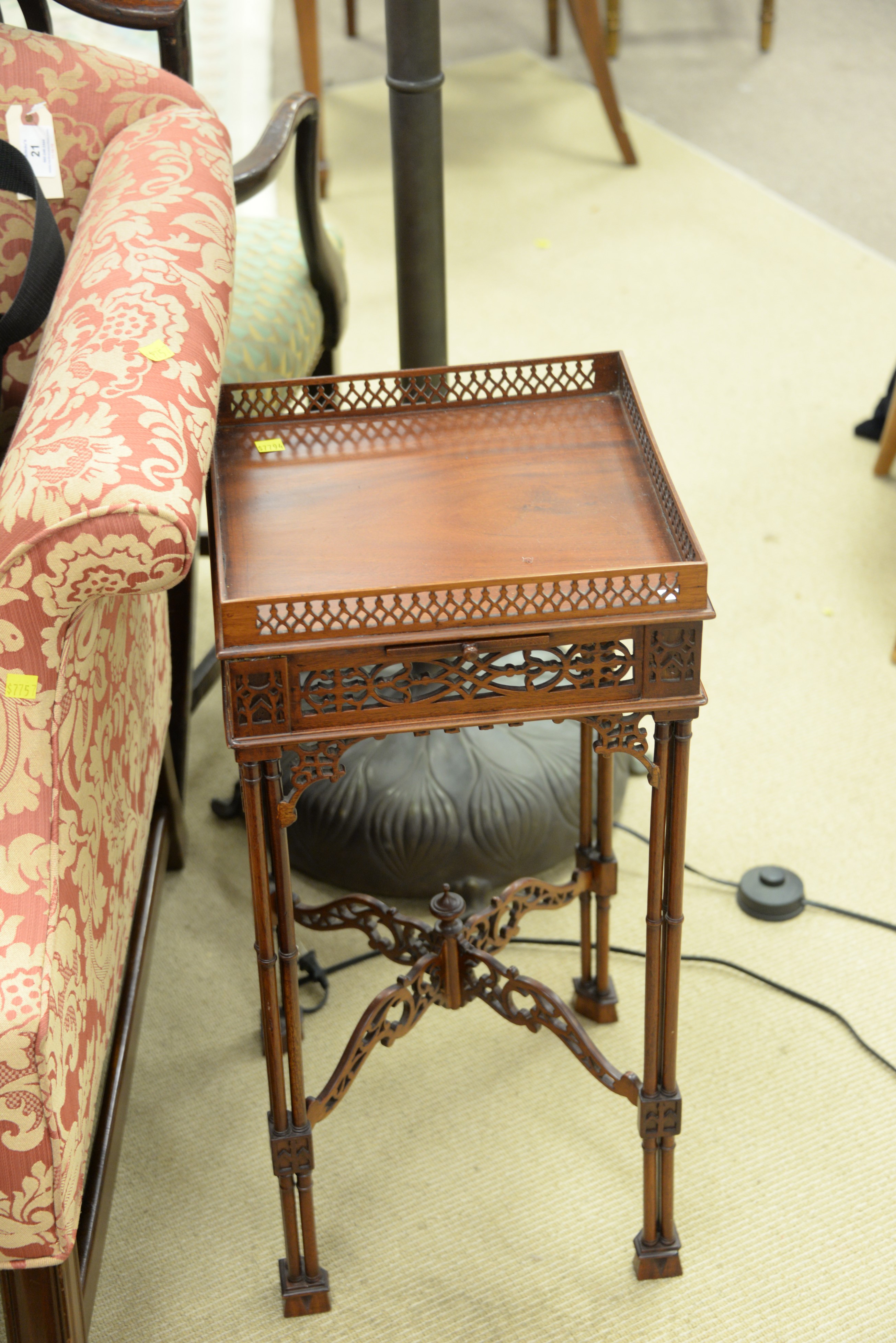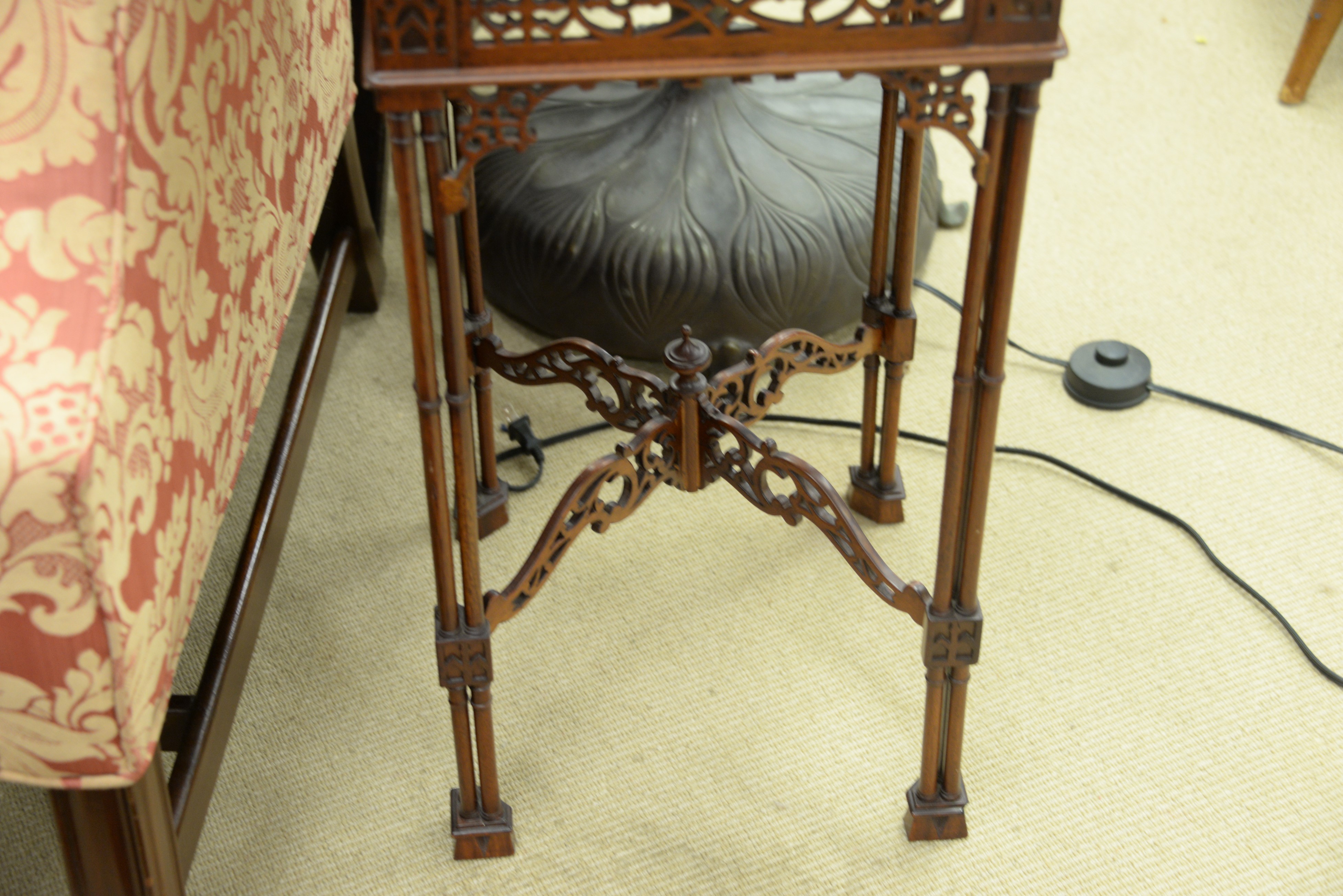Lot 43: Pair of Chinese Chippendale style stands with candle slides. ht. 26 in. top: 12 1/2 x 12 1/2