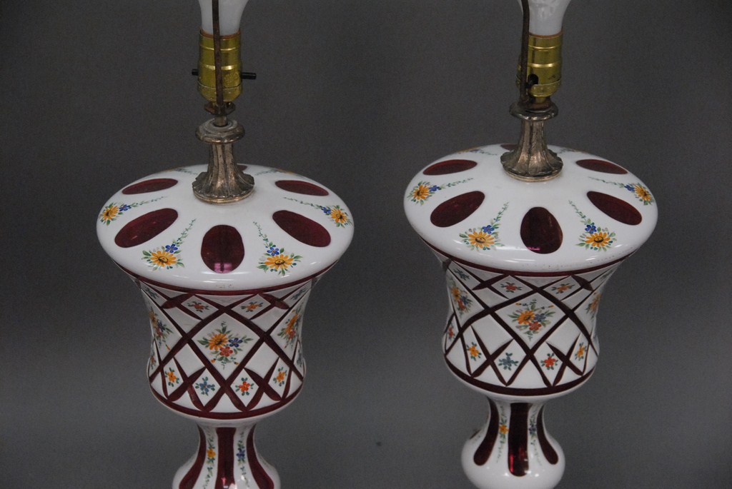 Pair of cranberry overlay glass table lamps, ht. with shade 35in.