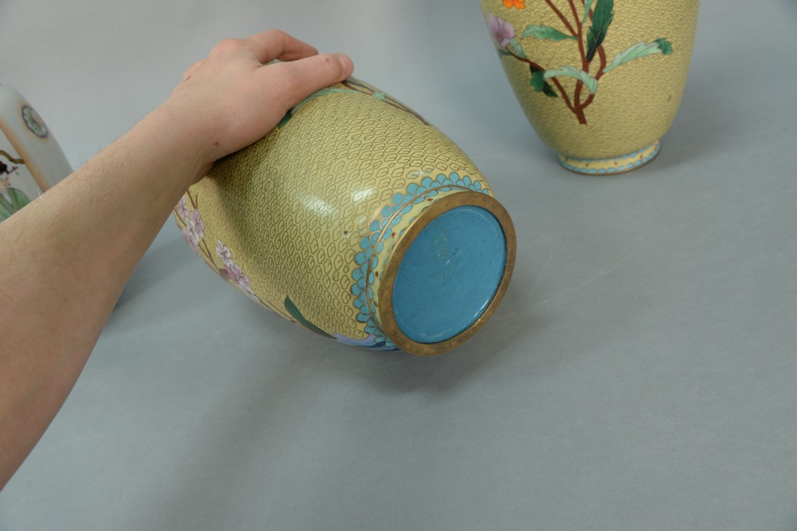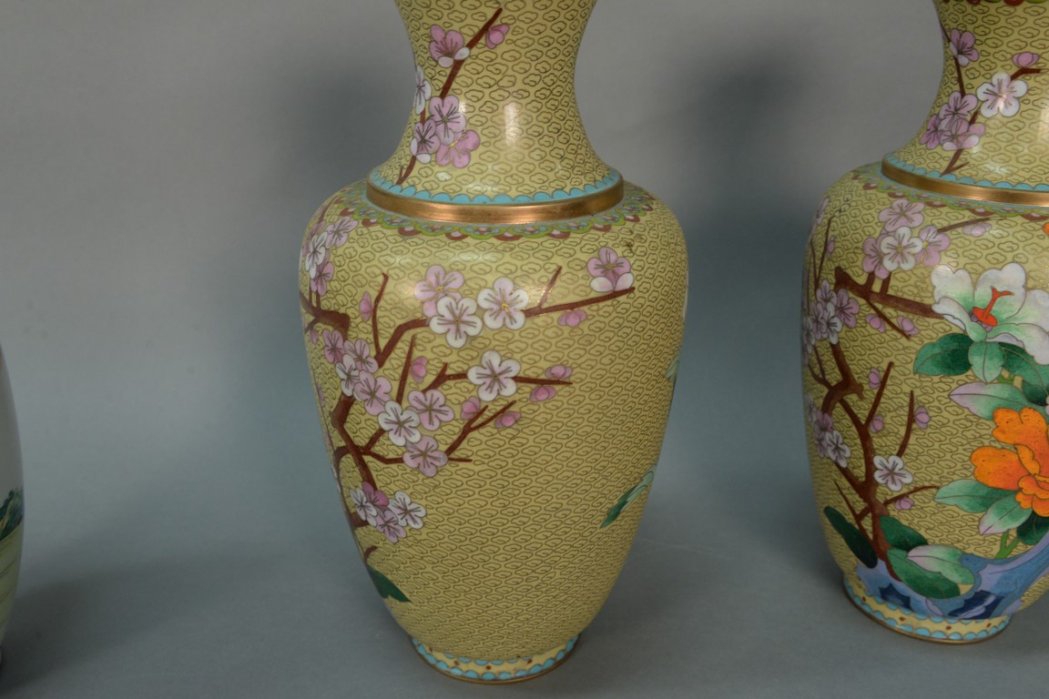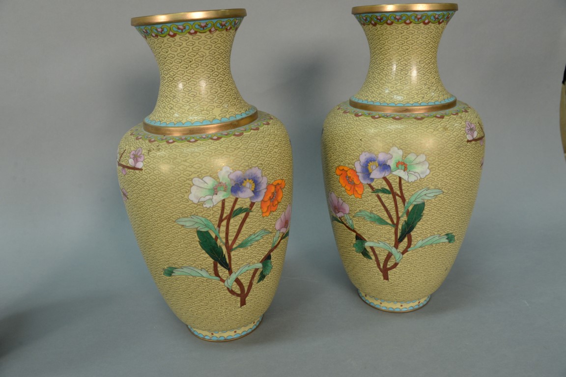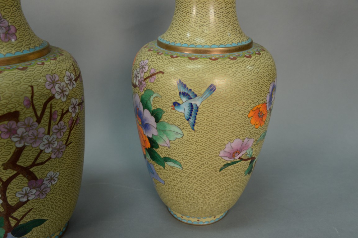 Pair of large cloisonne vases with flower and bird decoration. height 15 1/2 inches