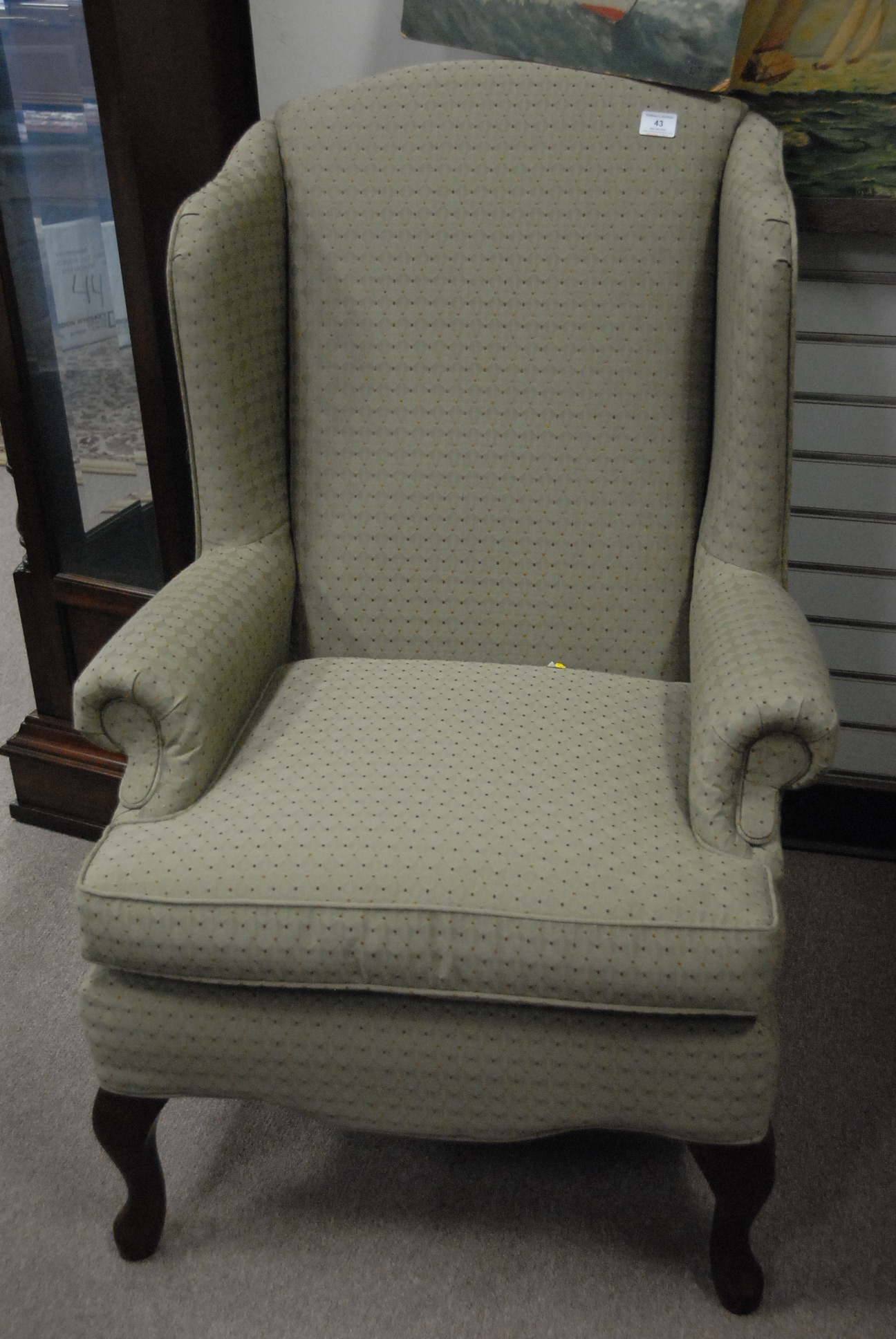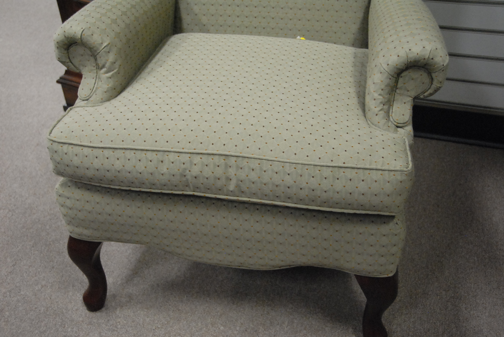 Queen Anne style upholstered wing chair.
