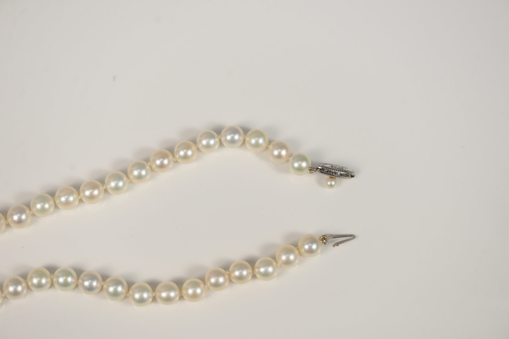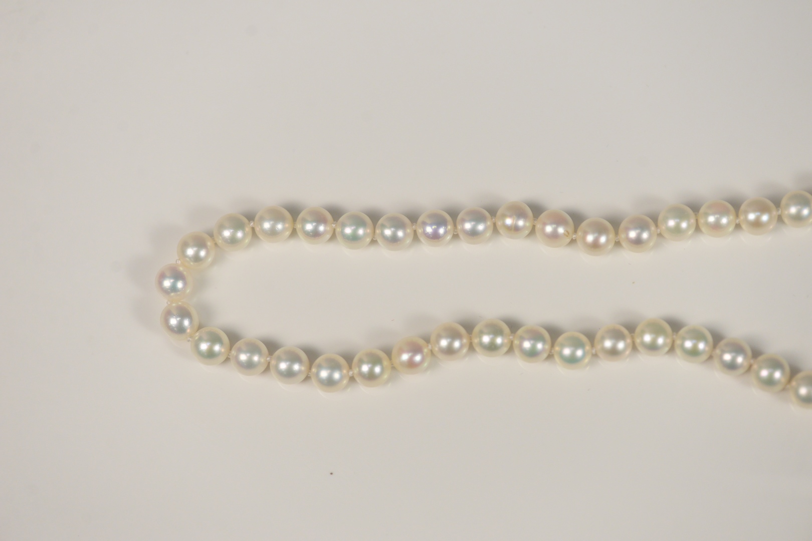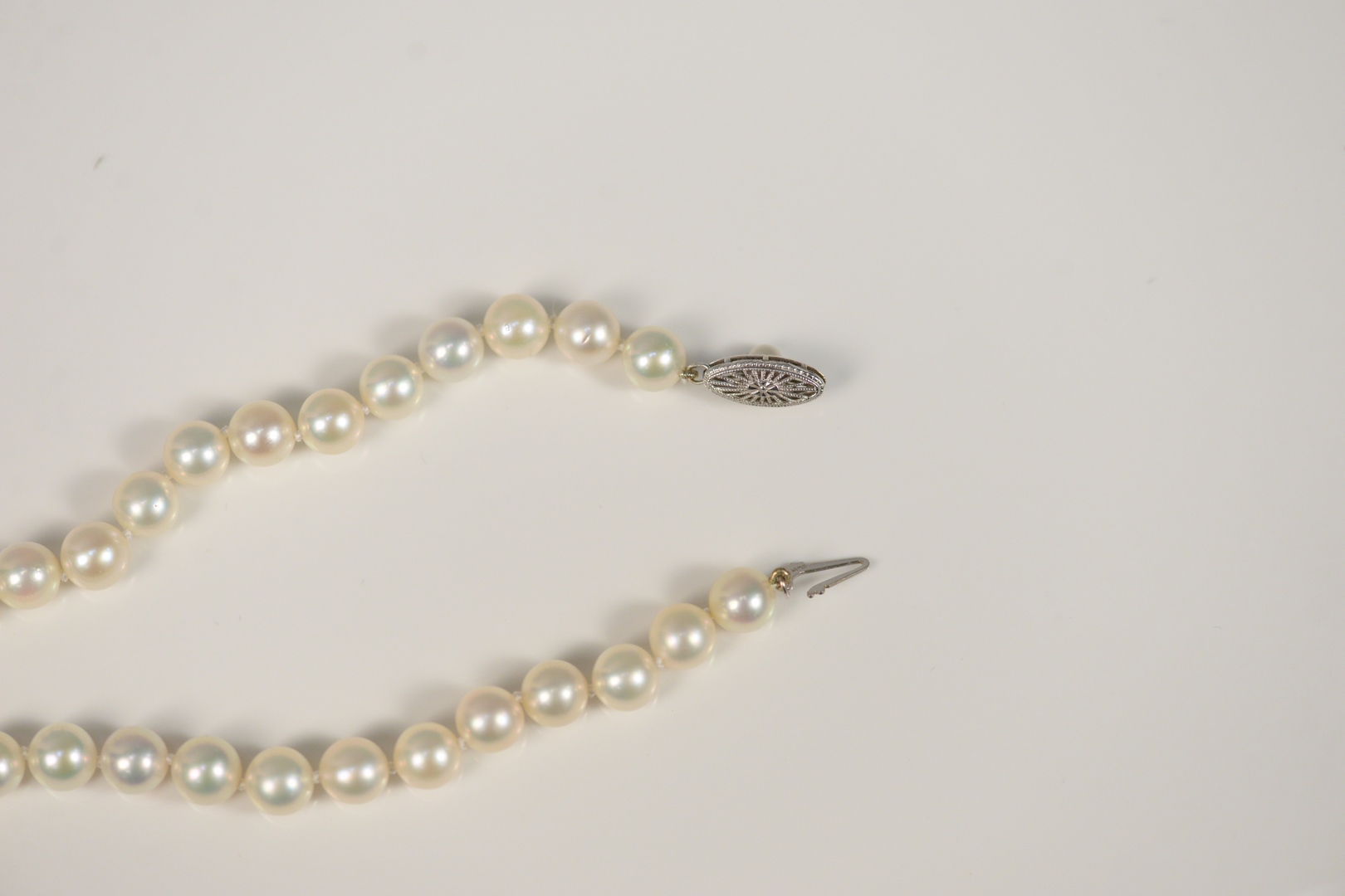 Lot 43: Single Strand of Pearls with 14 karat white gold clasp, set with one pearl length 15 1/2 inches 7.4 millimeters