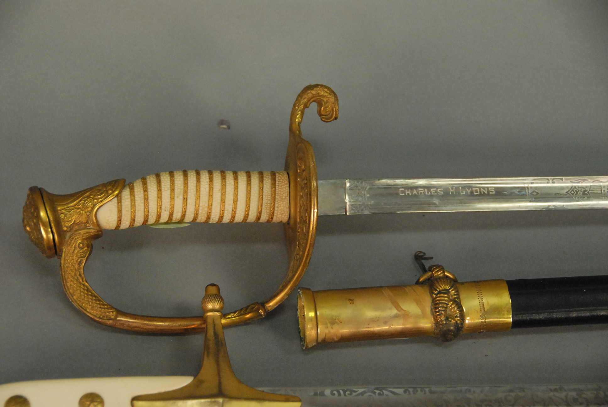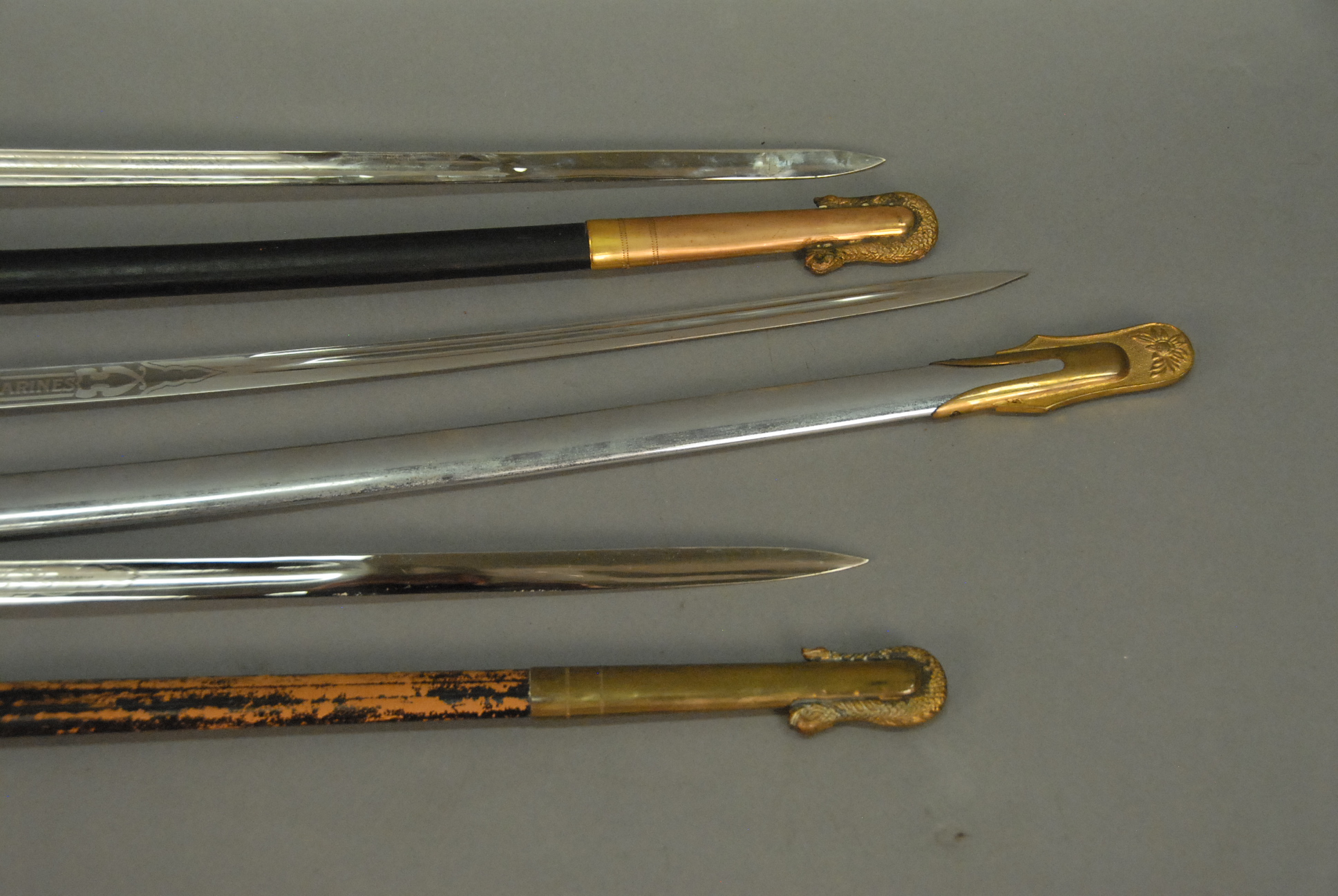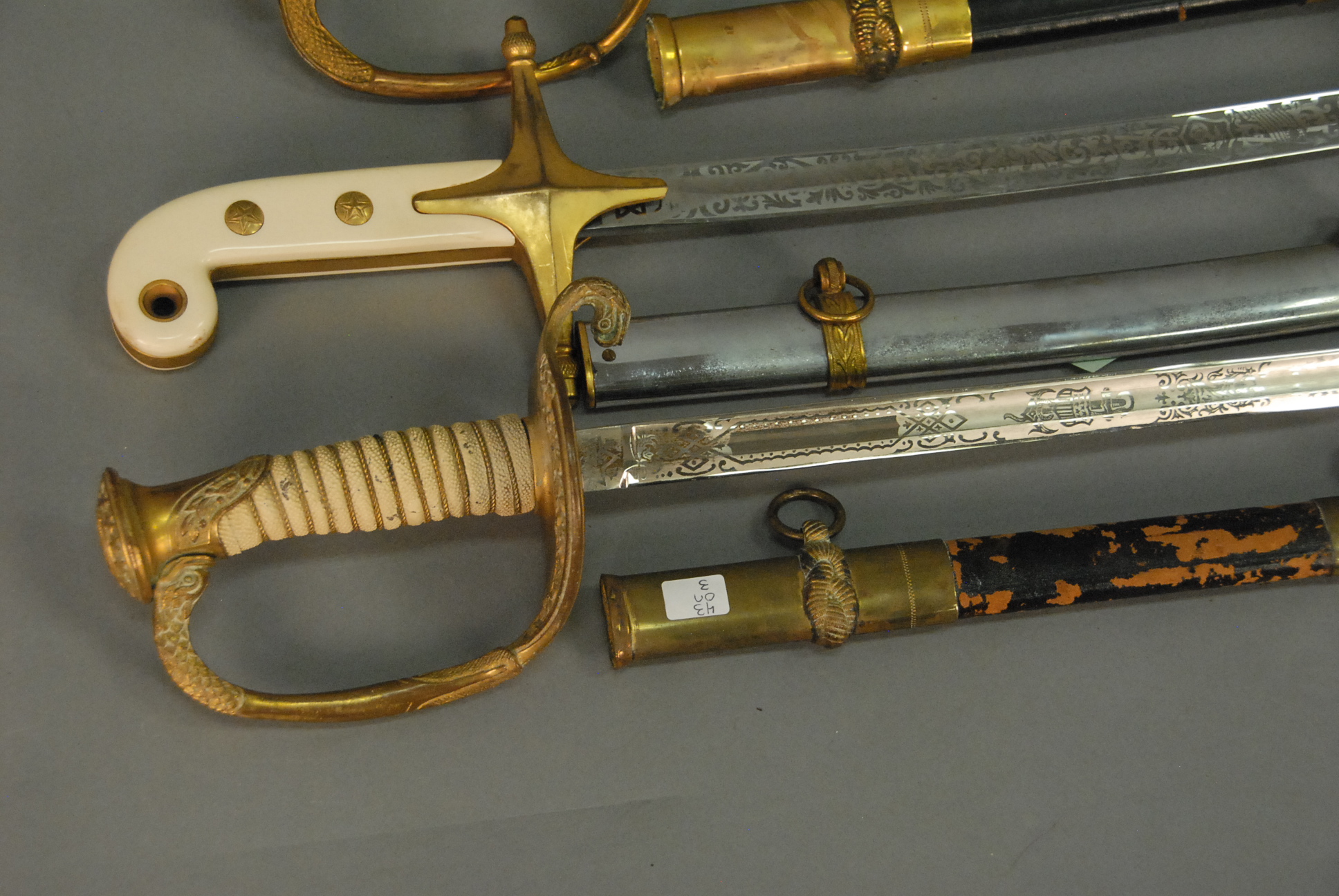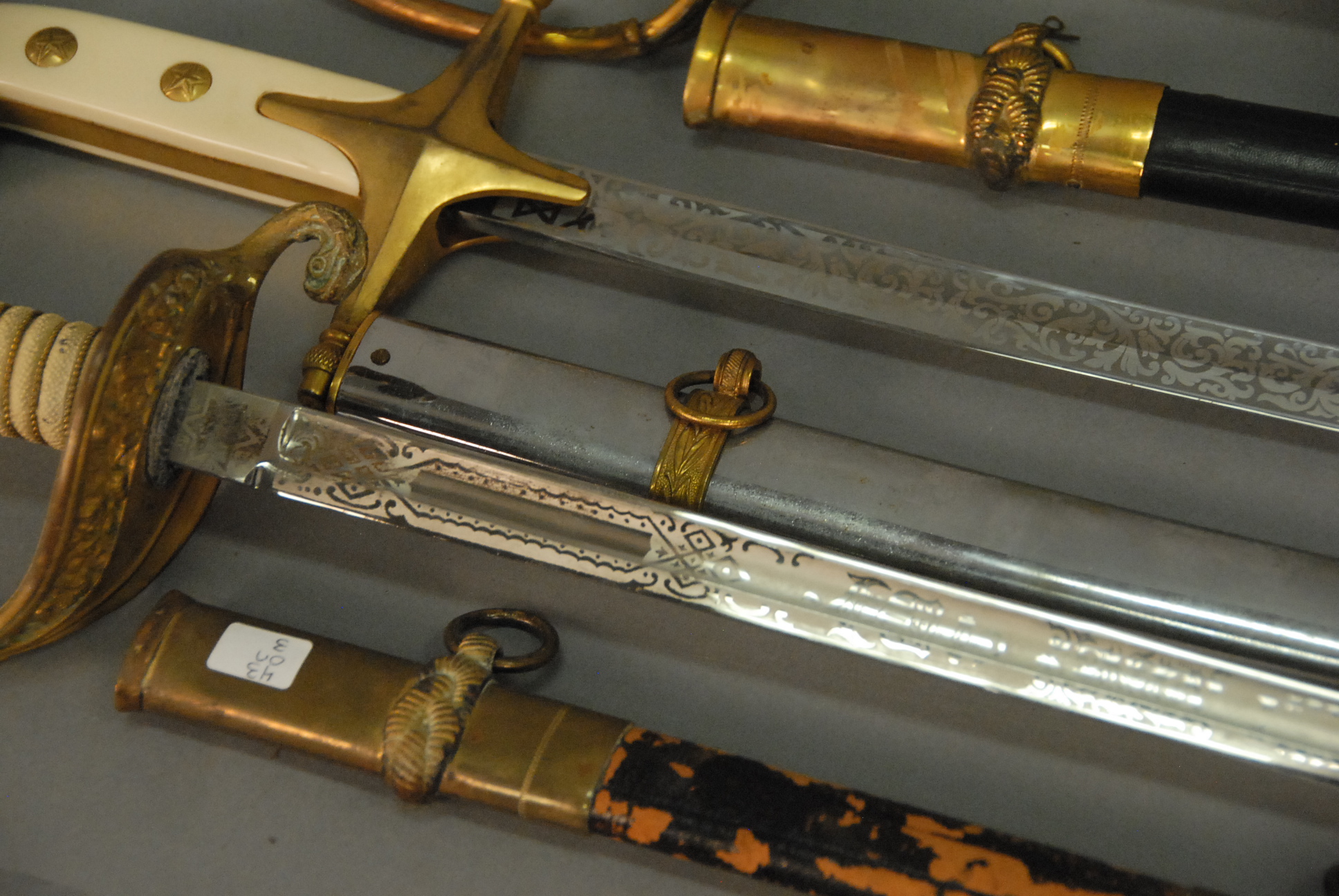 Three Naval dress swords, two by Gaunt. lengths 34 in., 34 in., and 40 in.