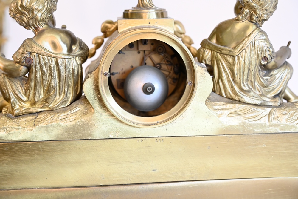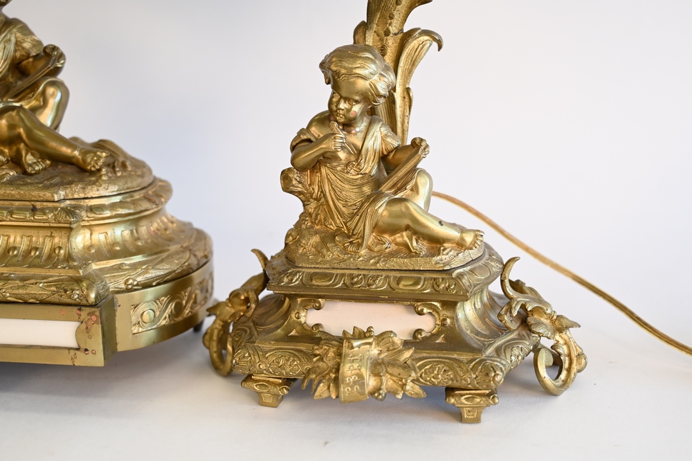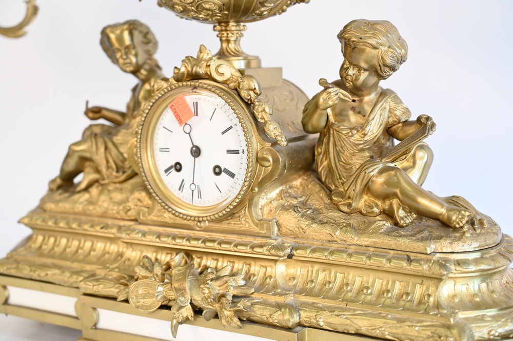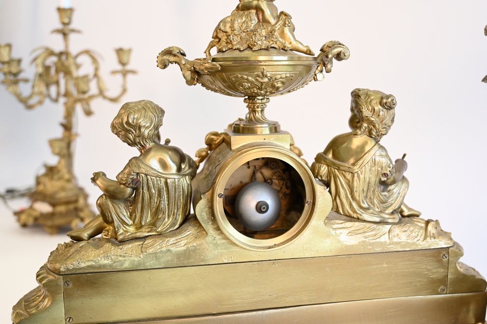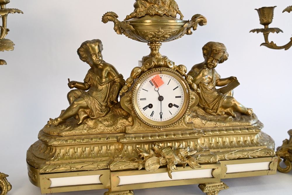 Lot 43: Three Piece Brass Mantle Set, to include a clock and two candelabras, each electrified into lamps and having figures mounted to the base, lamp height 22 1/2 inches. Provenance: Waterfront Estate, Stamford, CT.