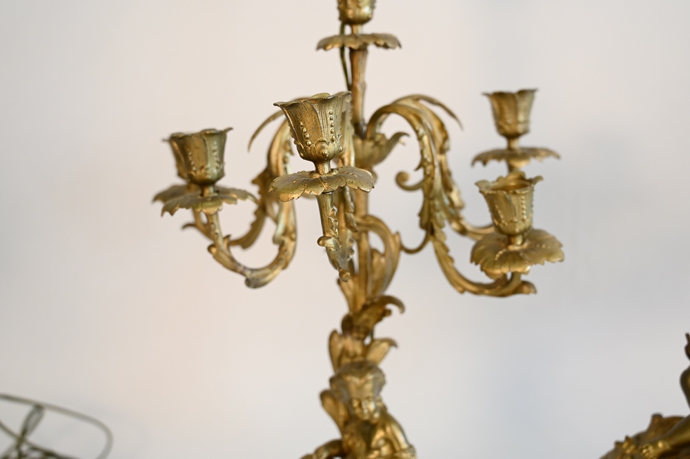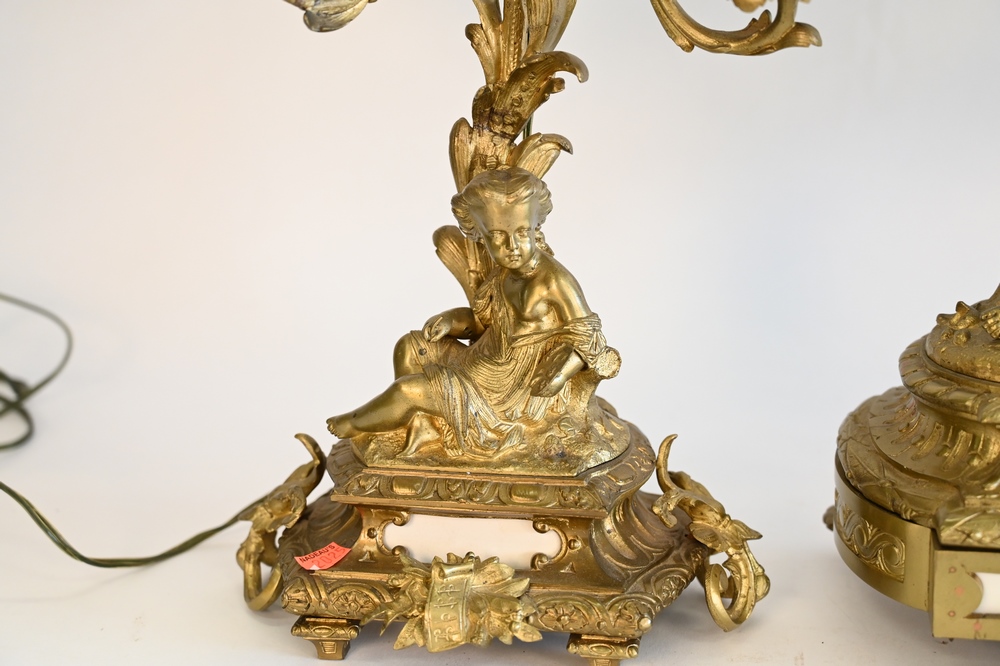 Three Piece Brass Mantle Set, to include a clock and two candelabras, each electrified into lamps and having figures mounted to the …