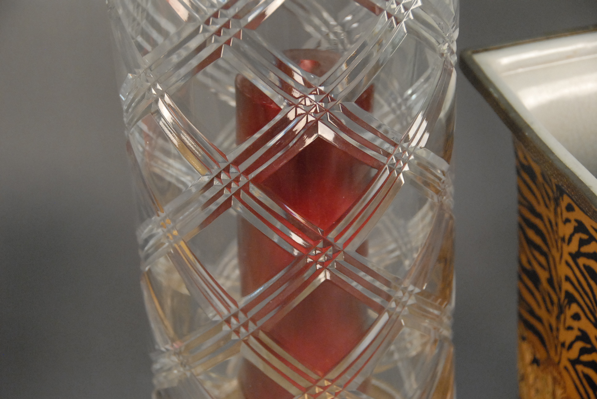 Lot 43: Three piece lot to include pair of crystal hurricane type candle holders ht. 19in. and a vase ht. 12 1/2in.