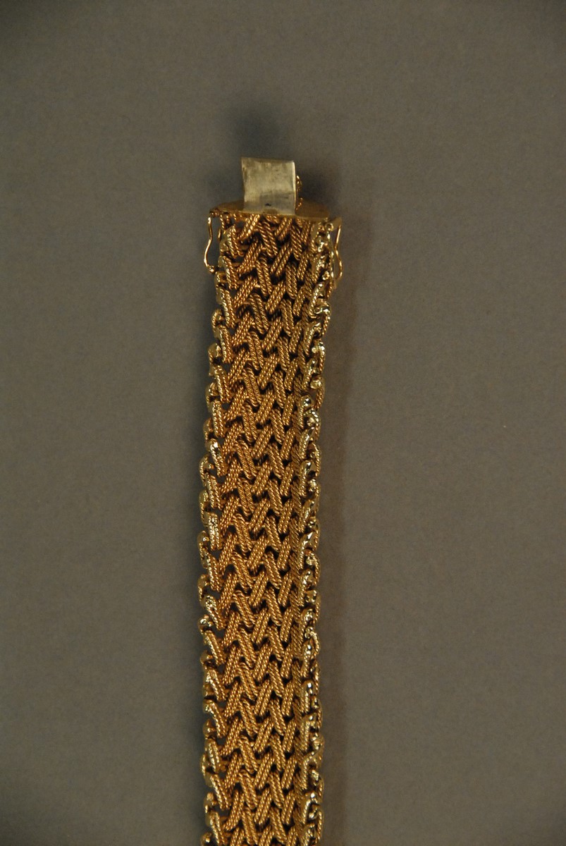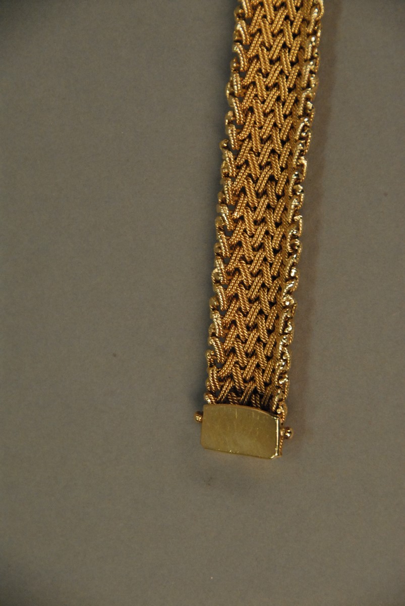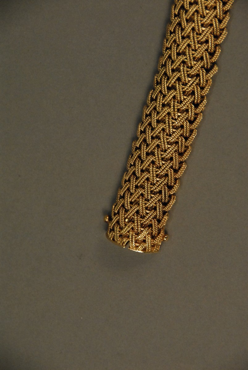 Lot 43: Tiffany & Co. 14K yellow gold woven bracelet. 92.4 grams Provenance: Property from The Estate of Margaret Reventlow of Litchfield, CT