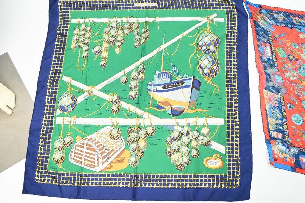 Lot 43: Two Hermes Silk Scarves, having fishing boat by artist P. Peroni, along with a red fluted Heraldic scarf, boat scarf has some slight…