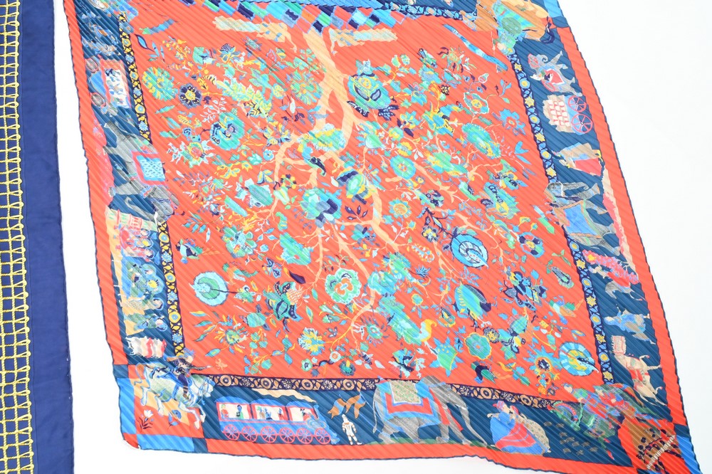 Two Hermes Silk Scarves, having fishing boat by artist P. Peroni, along with a red fluted Heraldic scarf, boat scarf has some slight staining, red scarf unremarkable, 35″ x 35″.