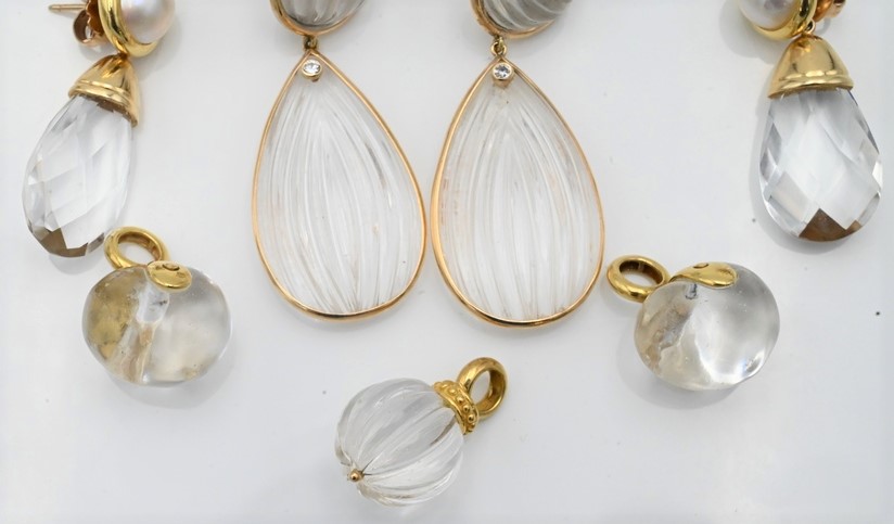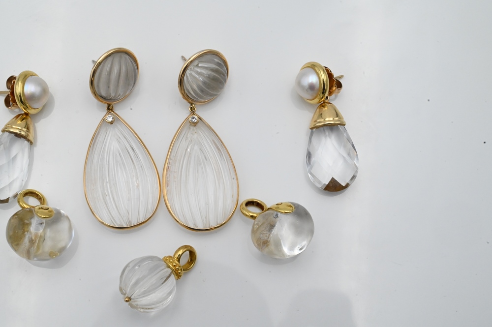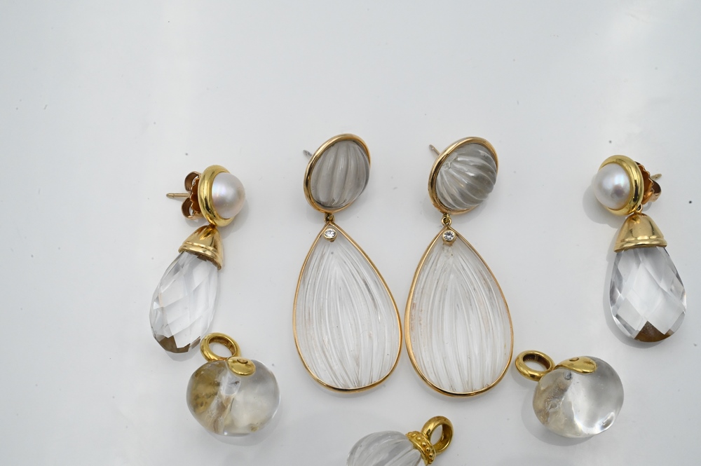 Lot 43: Two Pairs of Gold and Glass Earrings, to include pair 14 karat gold with drop pendants, pair of 18 karat gold with drop pendants, al…