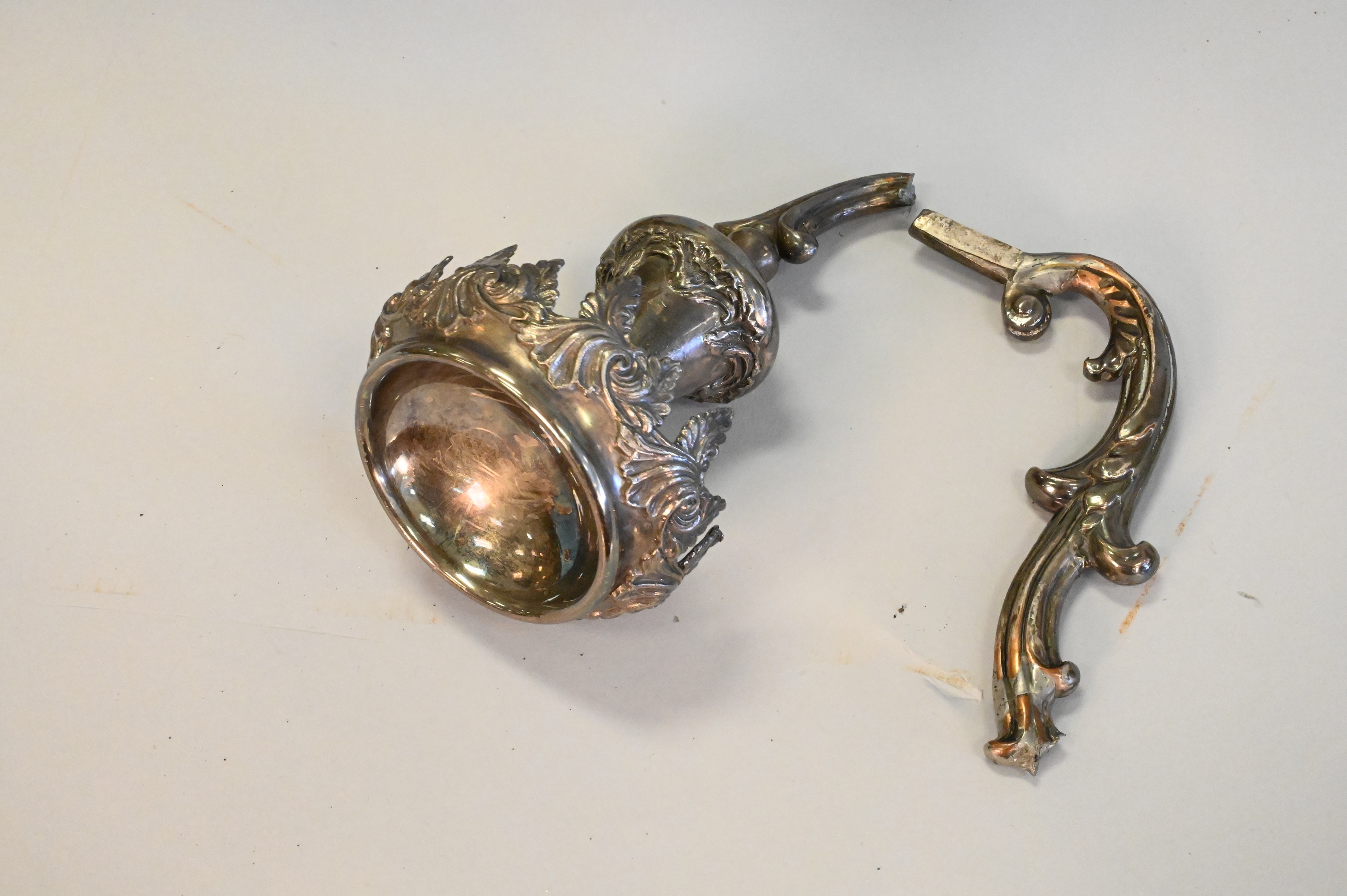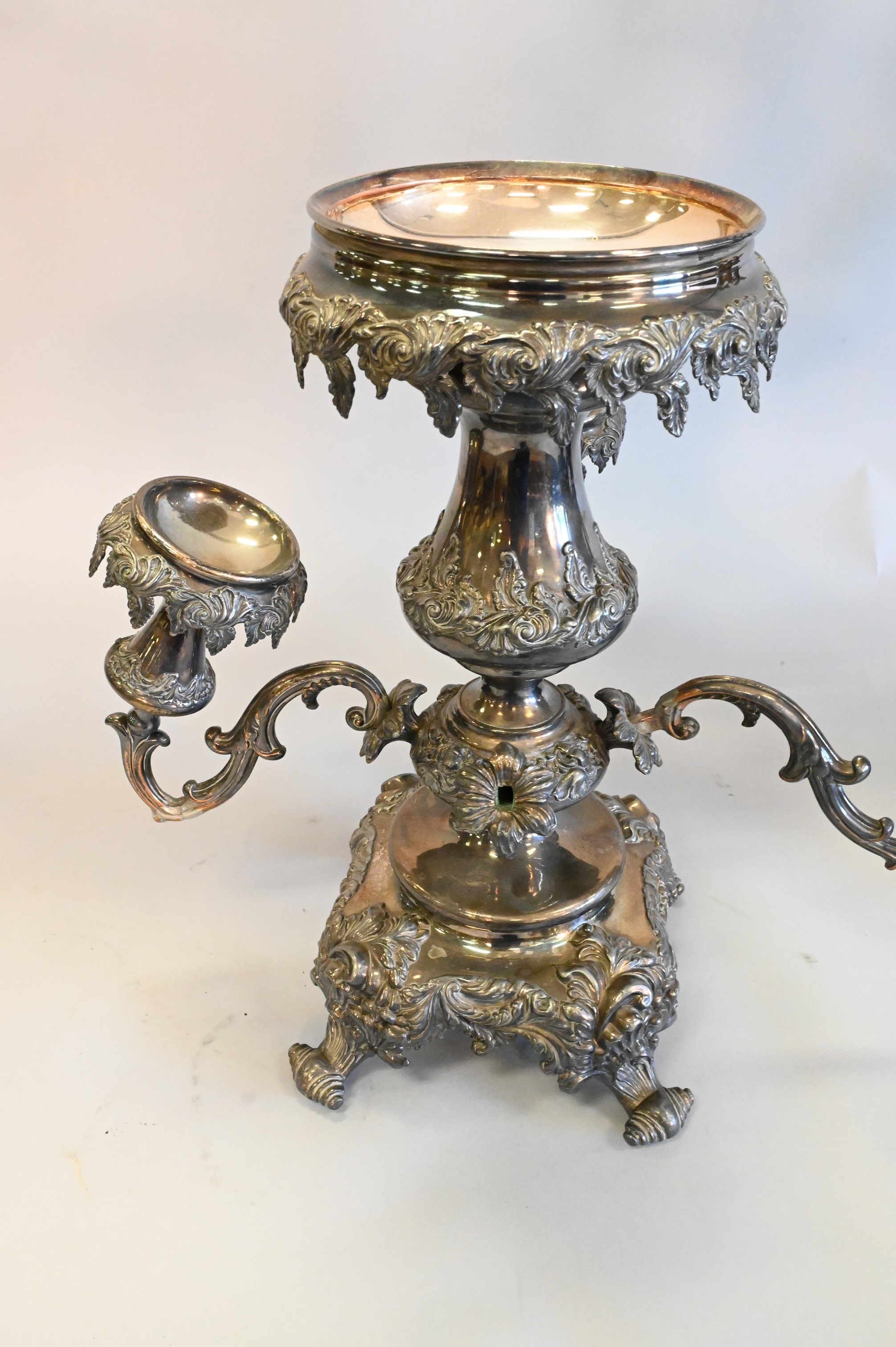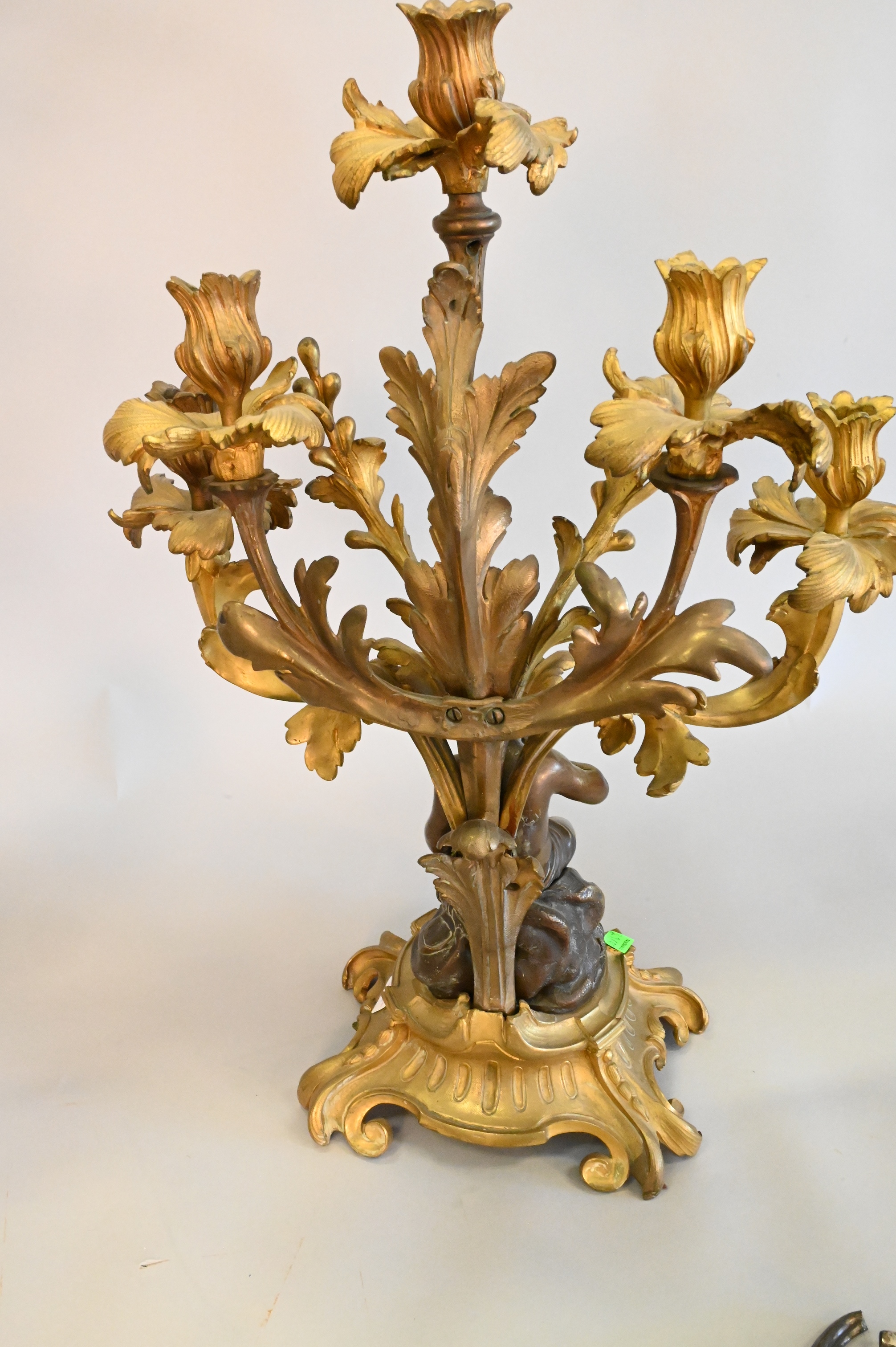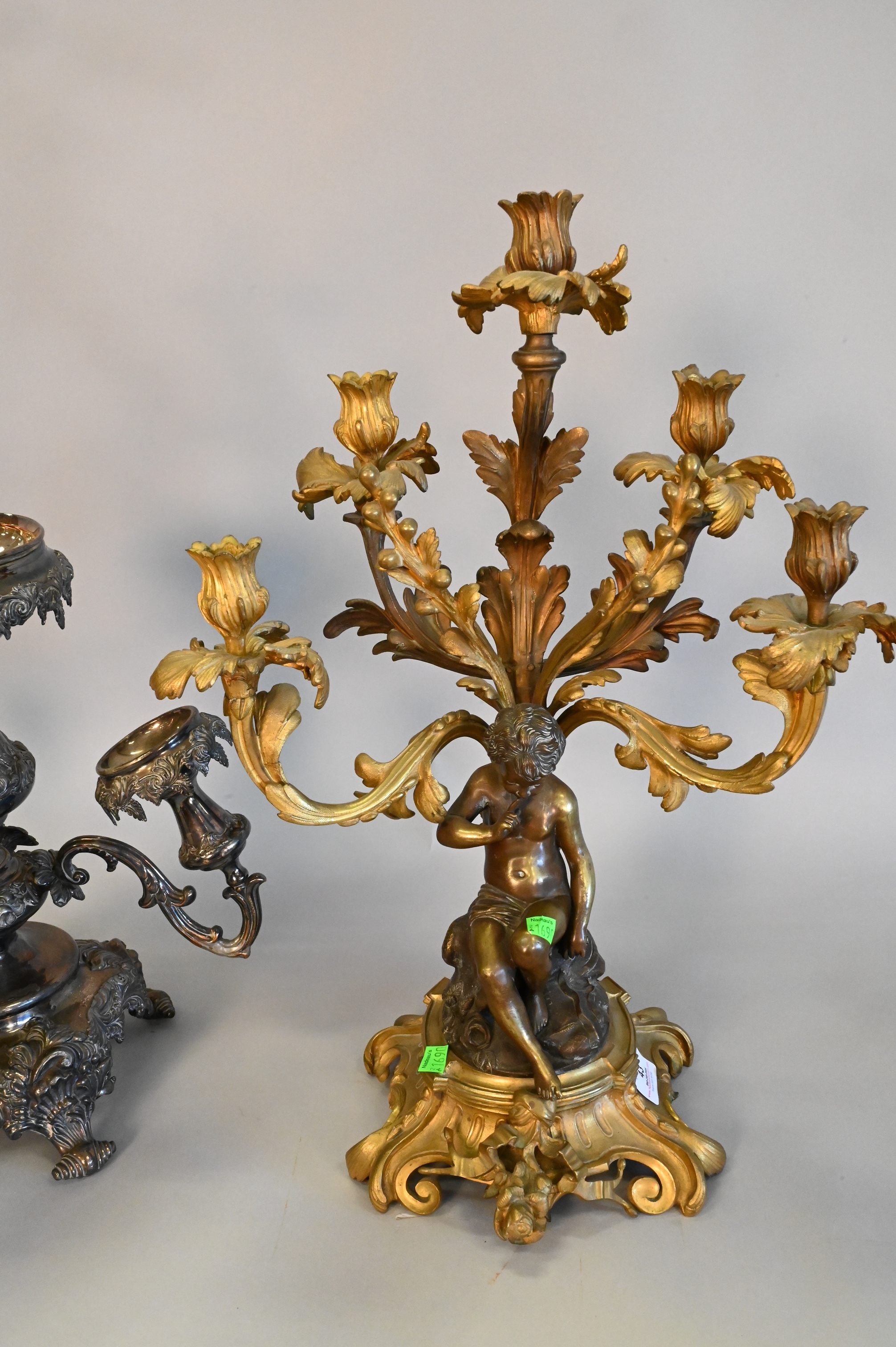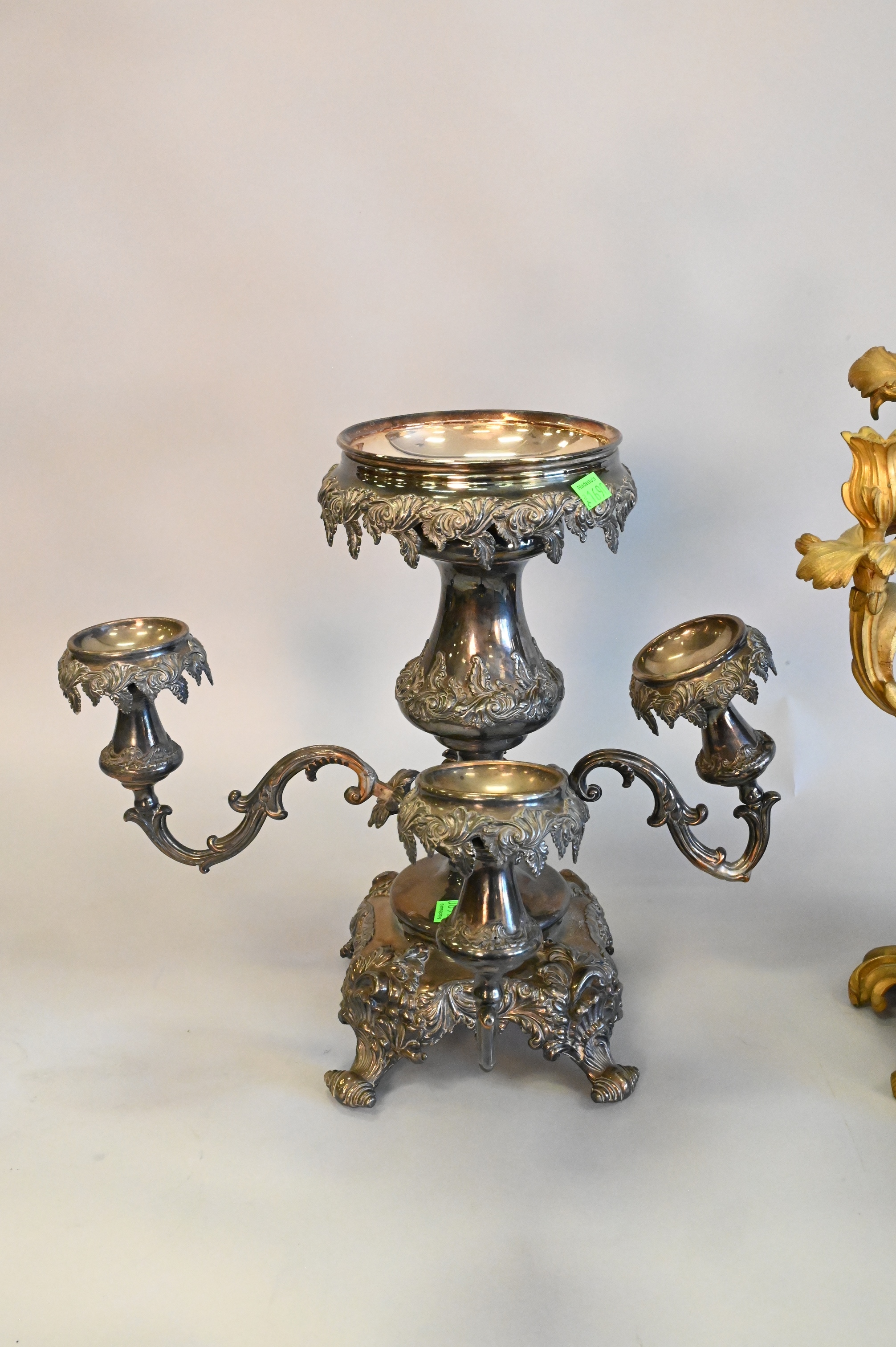 Two Piece Group, to include a large figural bronze candelabra, along with a large silver plated epergne, as is, largest height 33 inches.