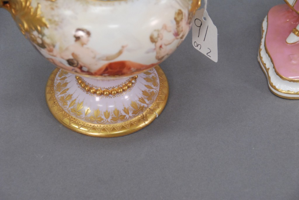 Lot 43: Two piece lot Royal Vienna vase with gilt ram head handles chip on base along with Minton figure two hairline cracks in base.