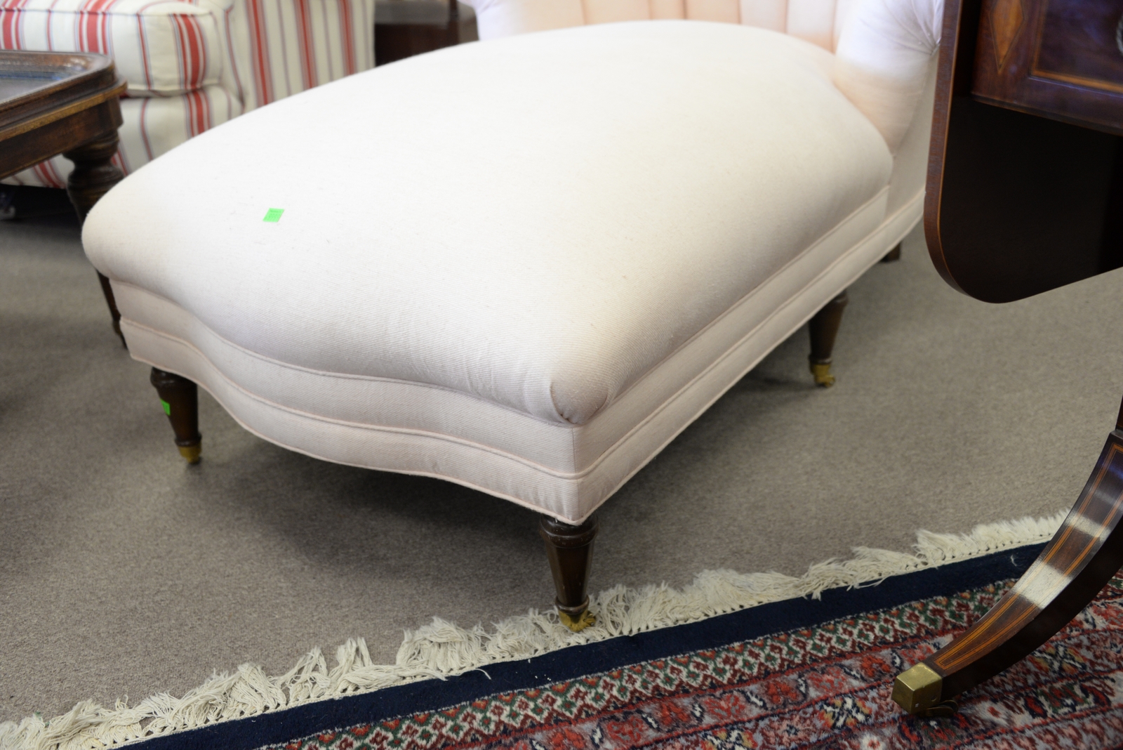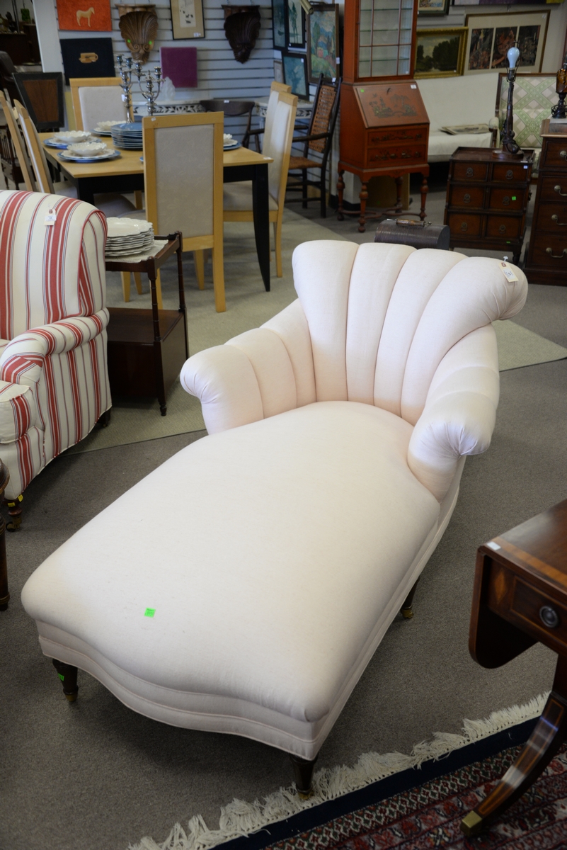 Upholstered chaise lounge with rolled arms and back and custom upholstery. lg. 64in.