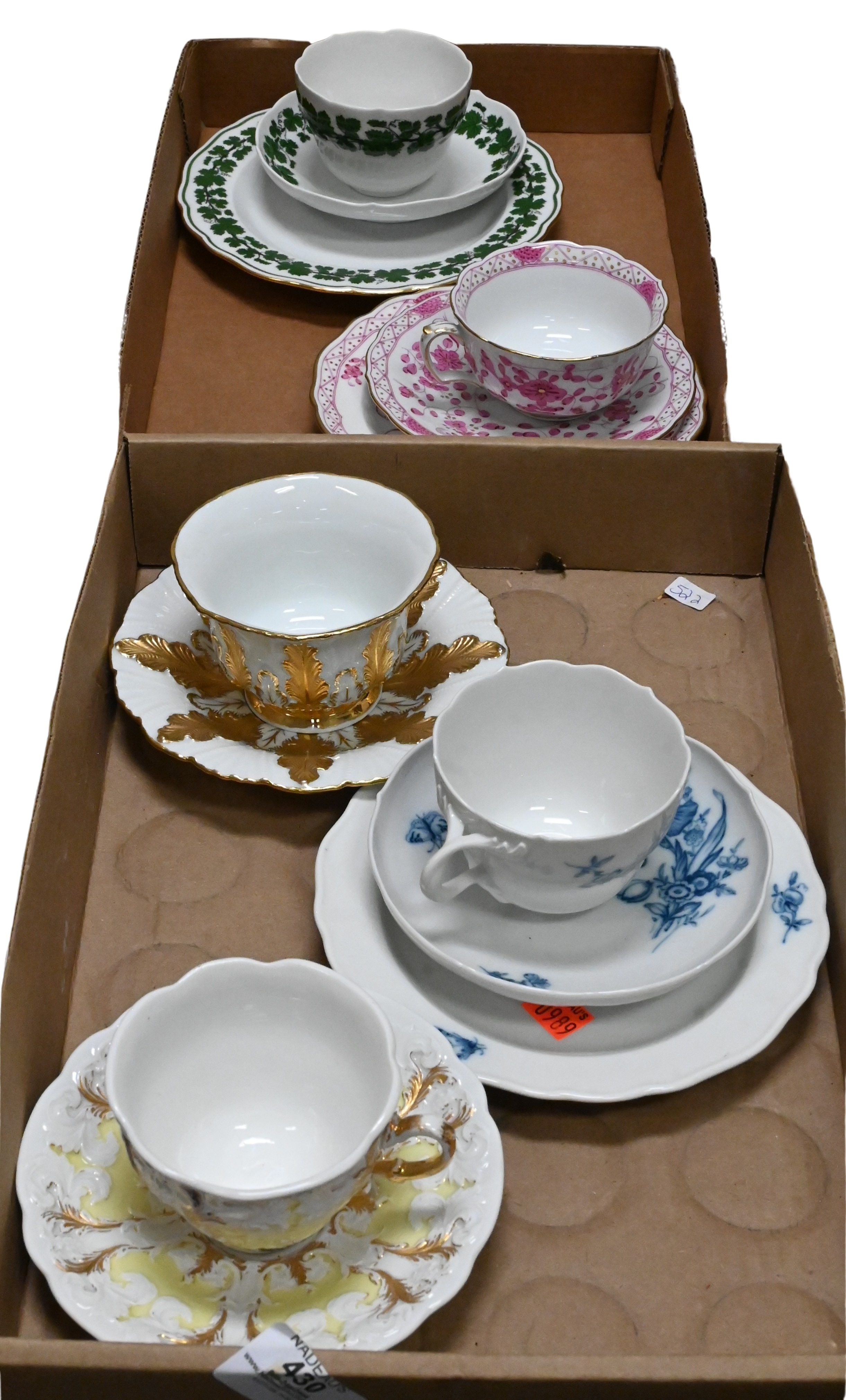 two pieces in “Acanthus”, three pieces in “Blue Onion”, three pieces in “Indian Pink”, one teacup, saucer and under plate in “Green Ivy”, along with one tea cup and saucer in white and yellow with gilt accents (heavy gilt loss)