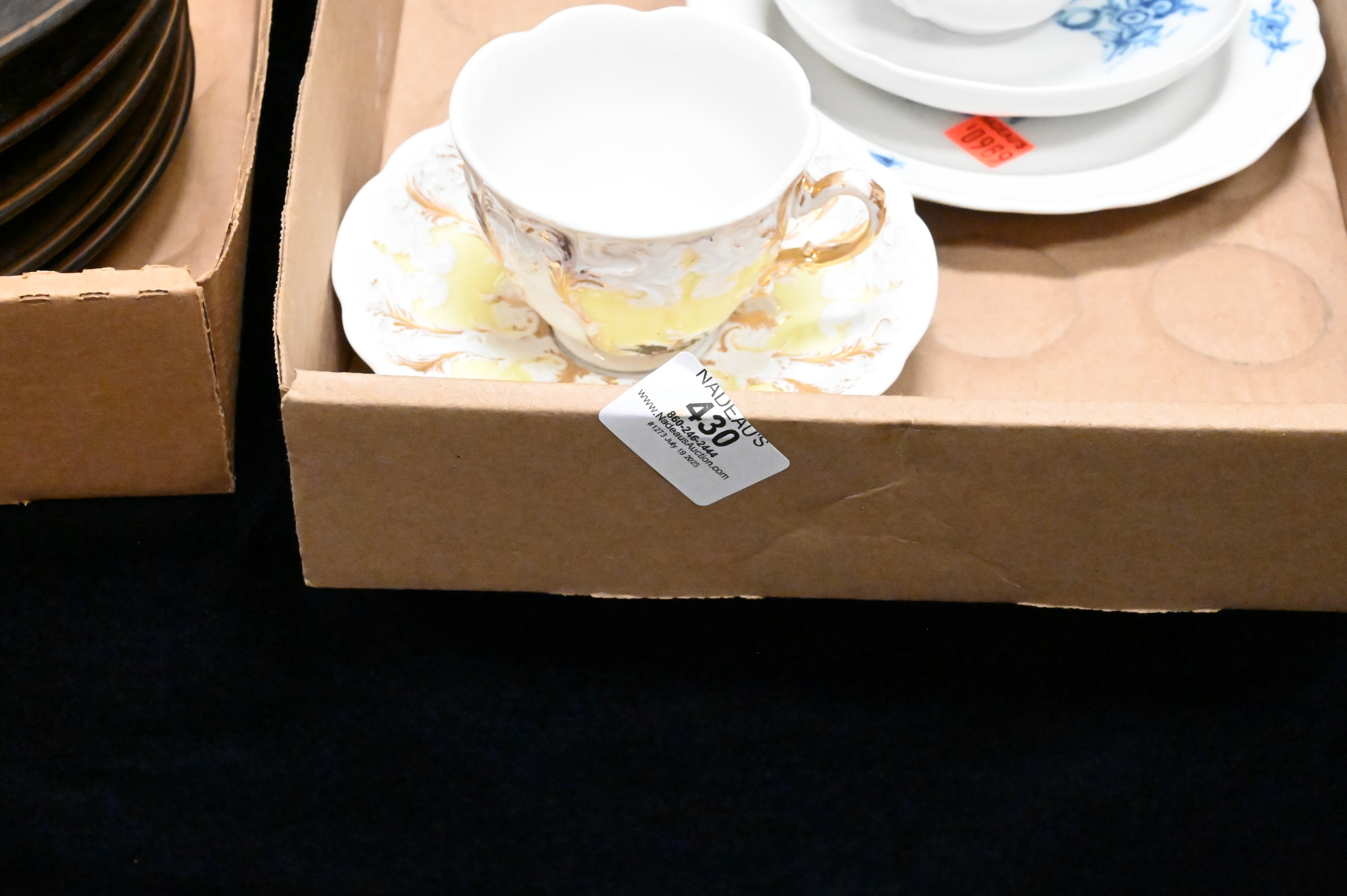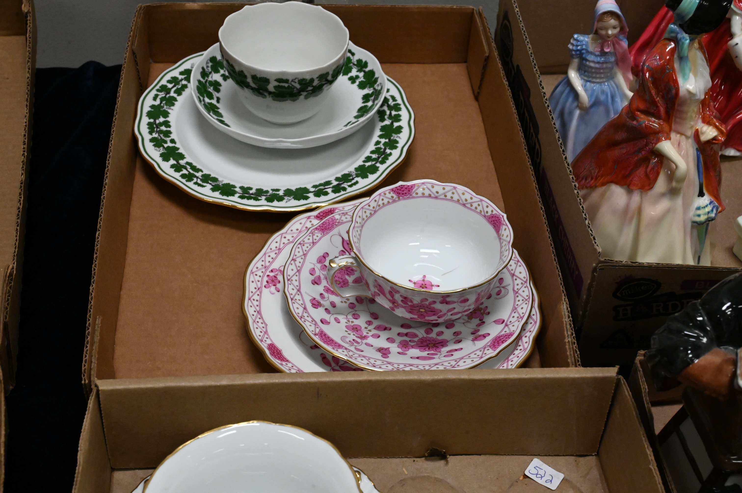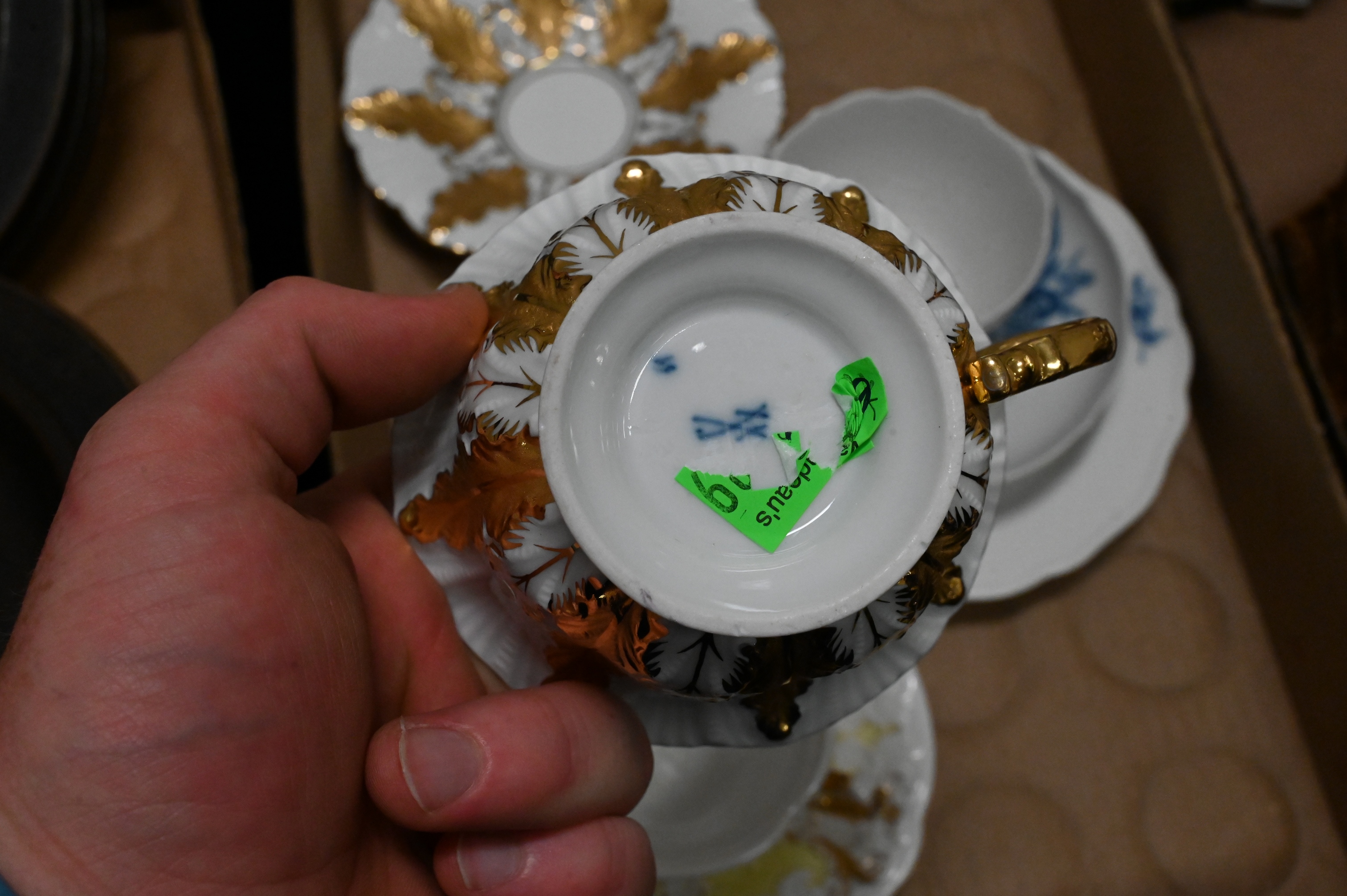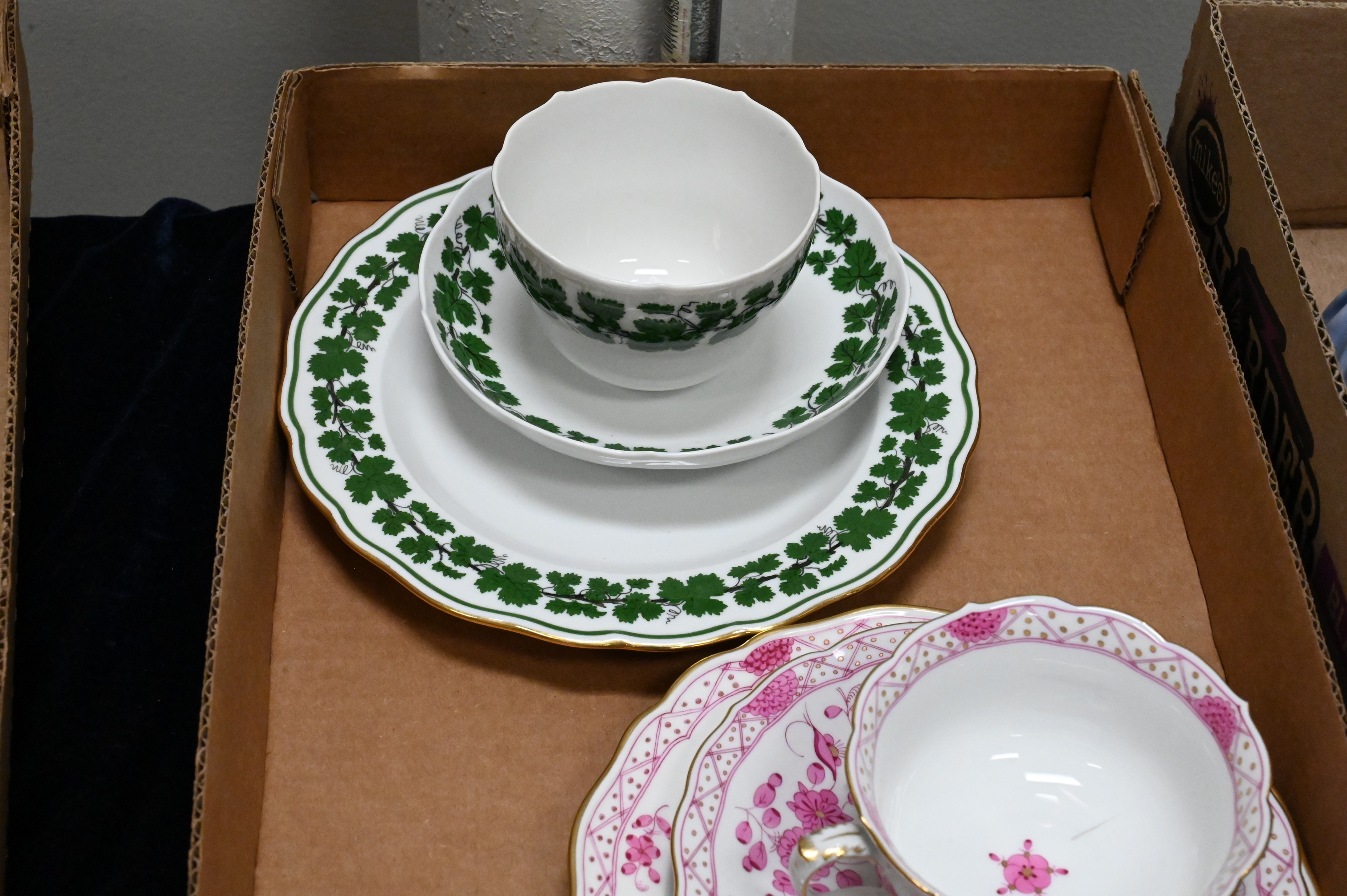 two pieces in “Acanthus”, three pieces in “Blue Onion”, three pieces in “Indian Pink”, one teacup, saucer and under plate in “Green Ivy”, along with one tea cup and saucer in white and yellow with gilt accents (heavy gilt loss)