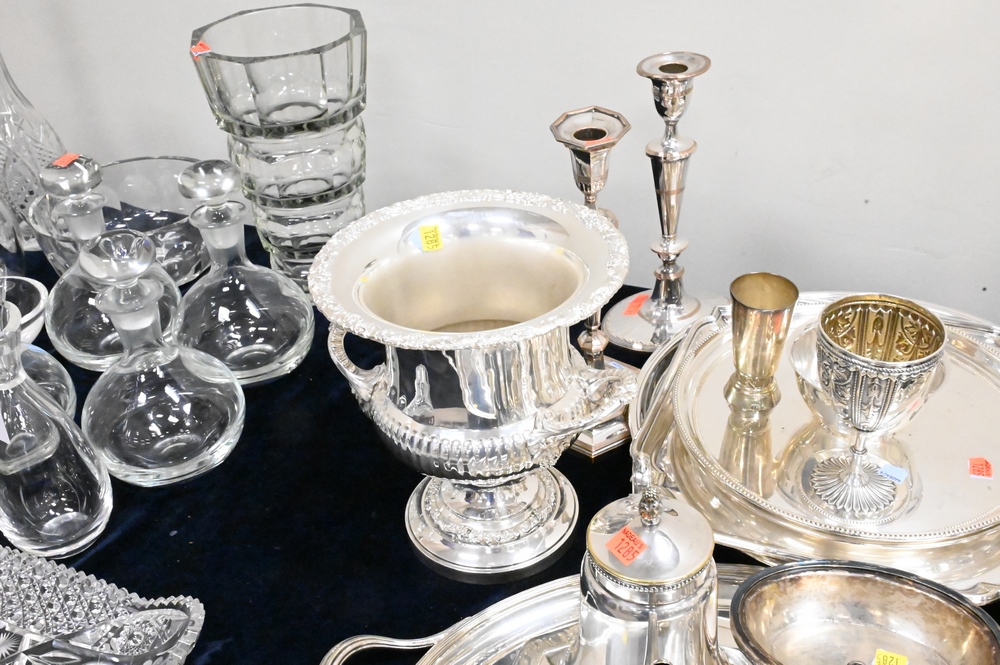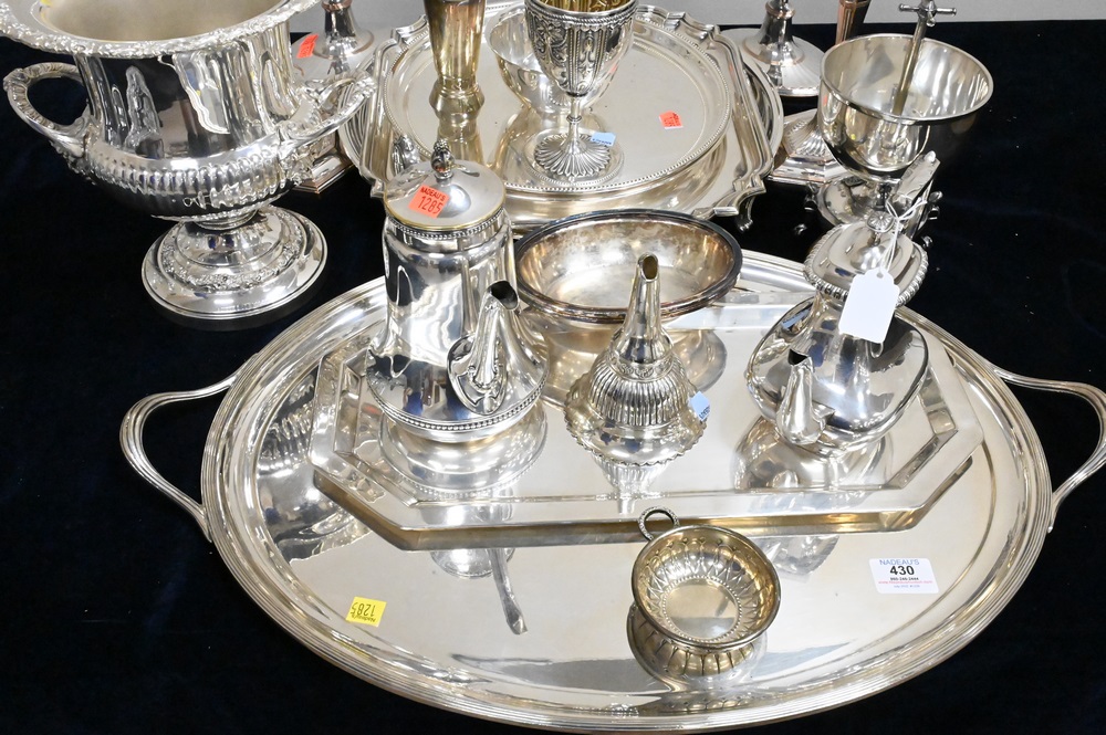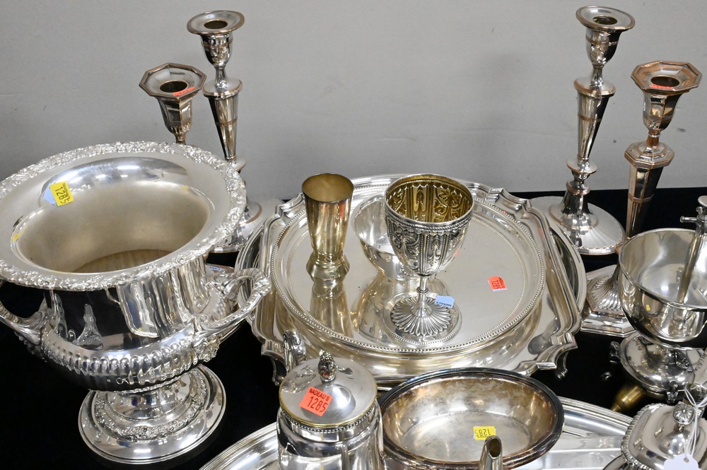 19 Piece Lot of Silver Plate, to include candlesticks, wine cooler, trays, teapot, etc., tray length 26 inches.